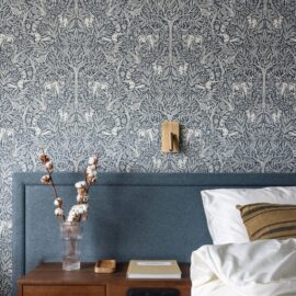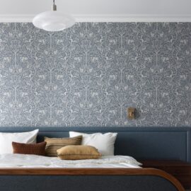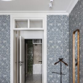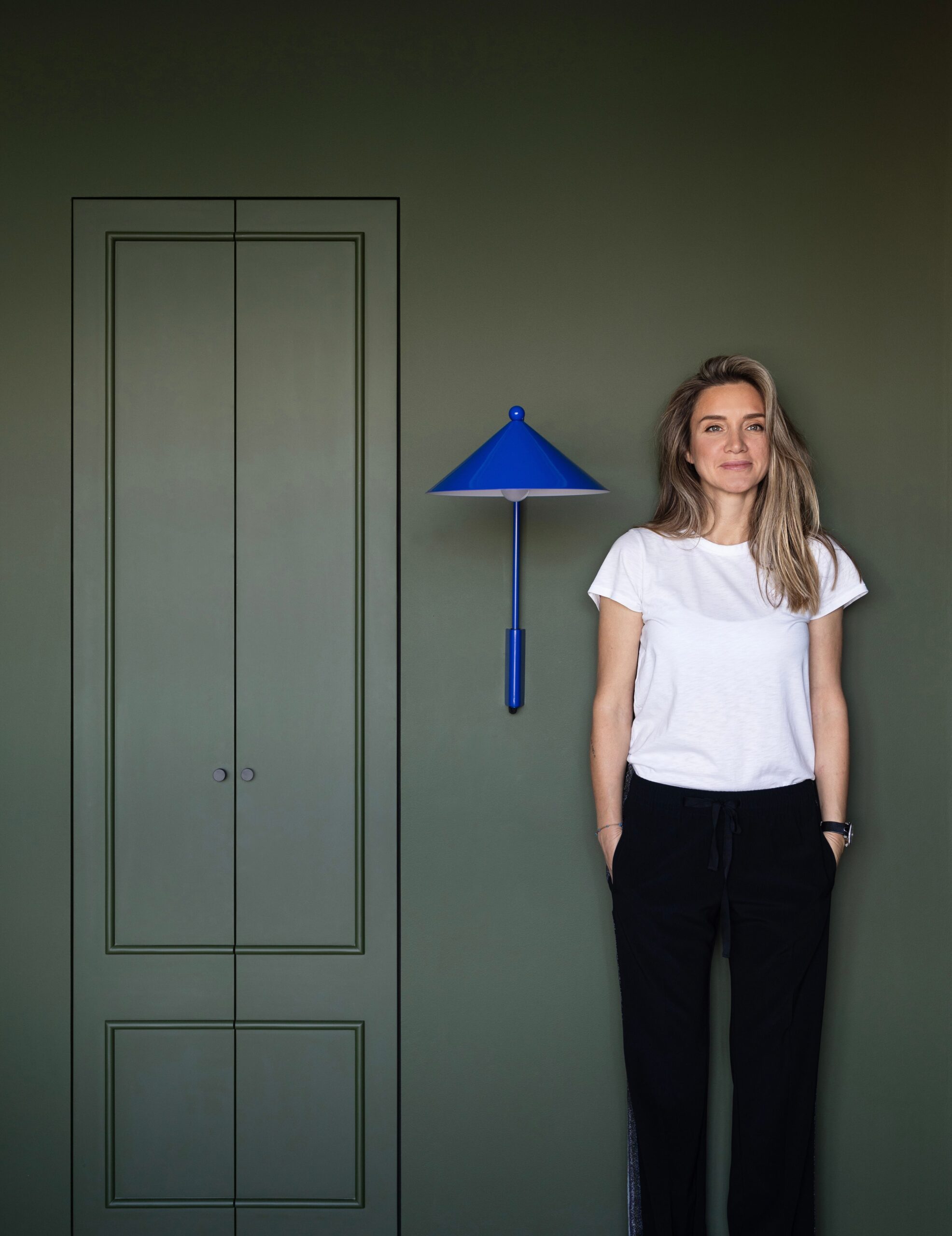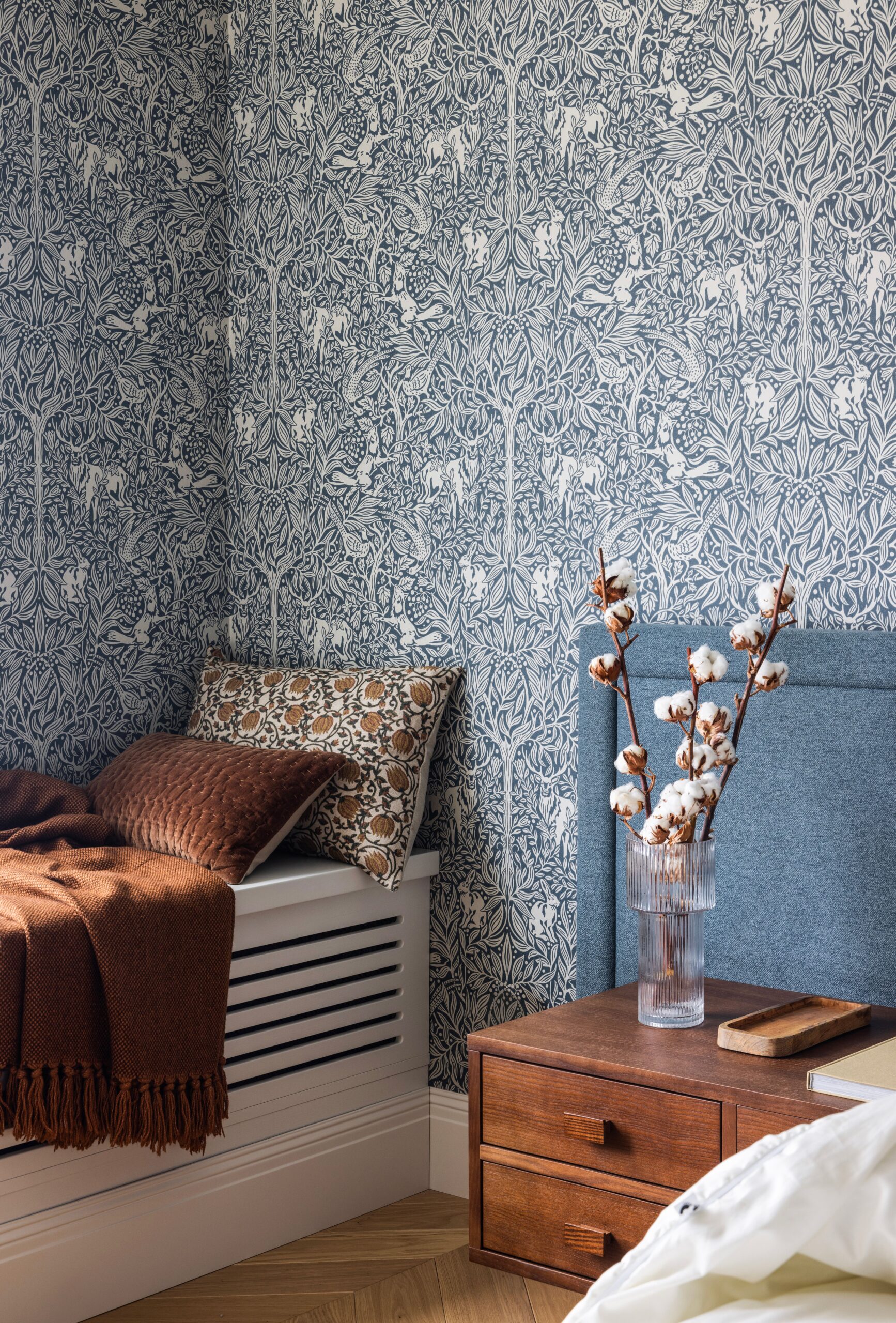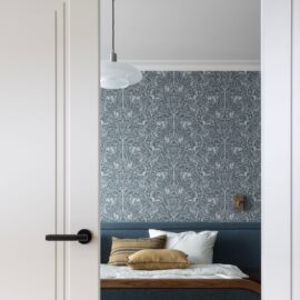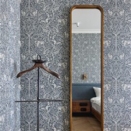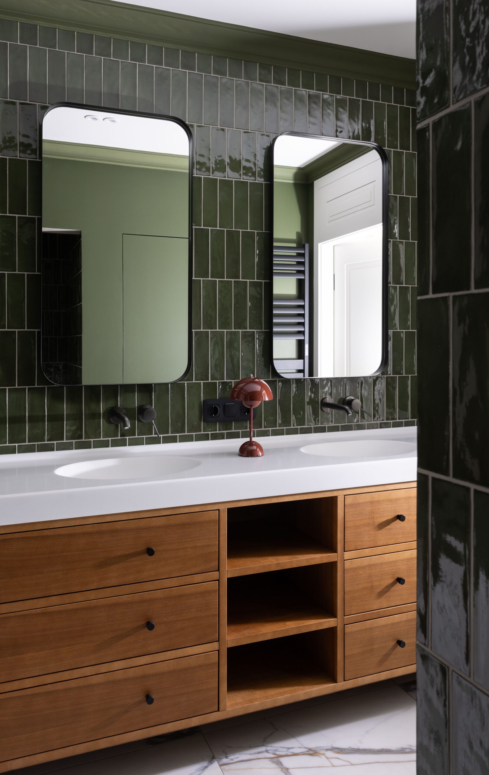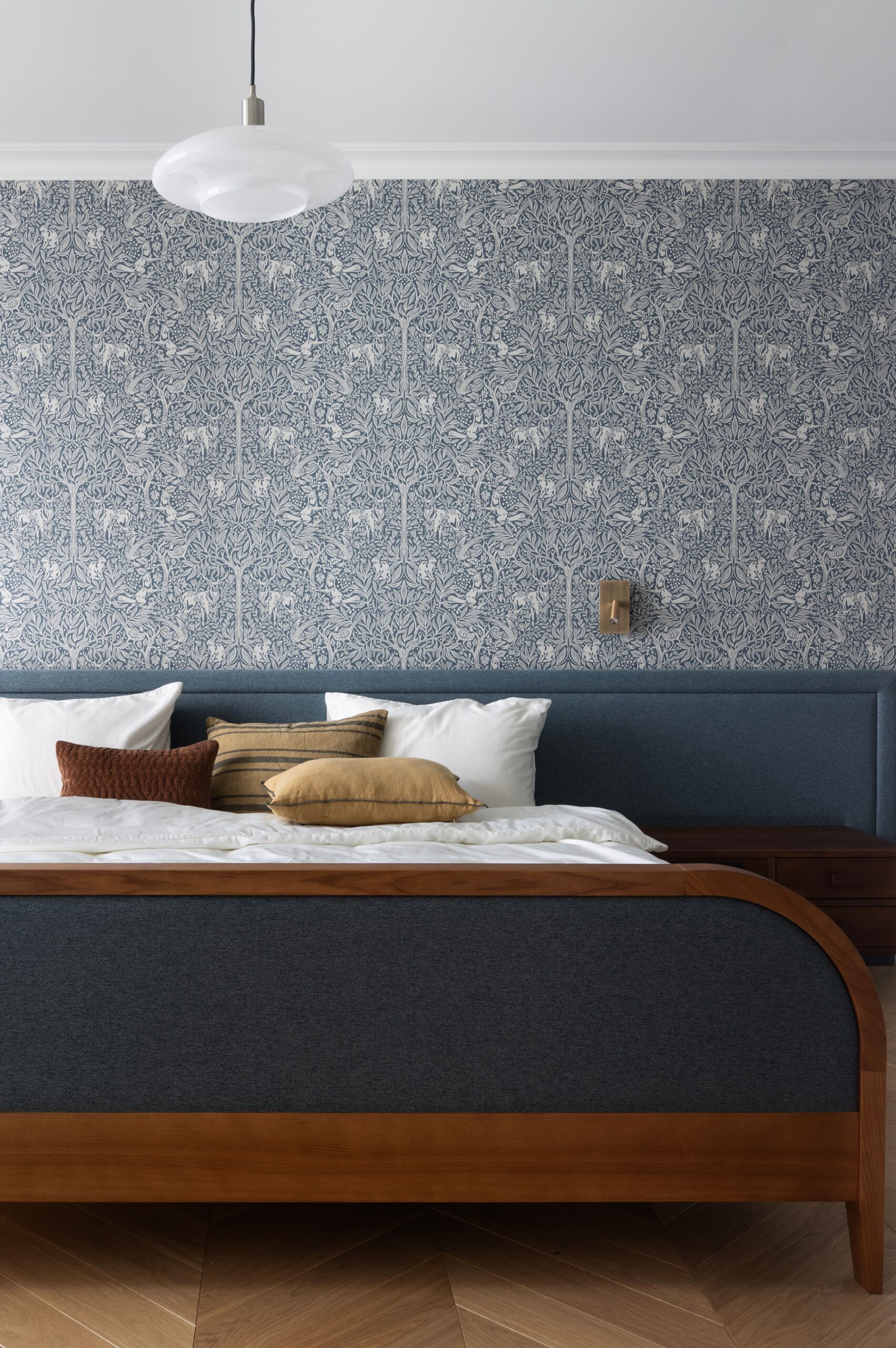 Найбільш виразними стали кольорові акценти у батьківському блоці. У спальні використали шпалери шведського бренду Borastapeter із блакитним орнаментом, які контрастують із насиченим зеленим відтінком стін у кабінеті. Двері між цими кімнатами переважно відкриті, що дозволяє бачити обидва кольори водночас.