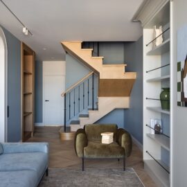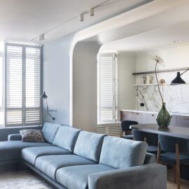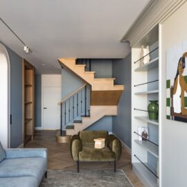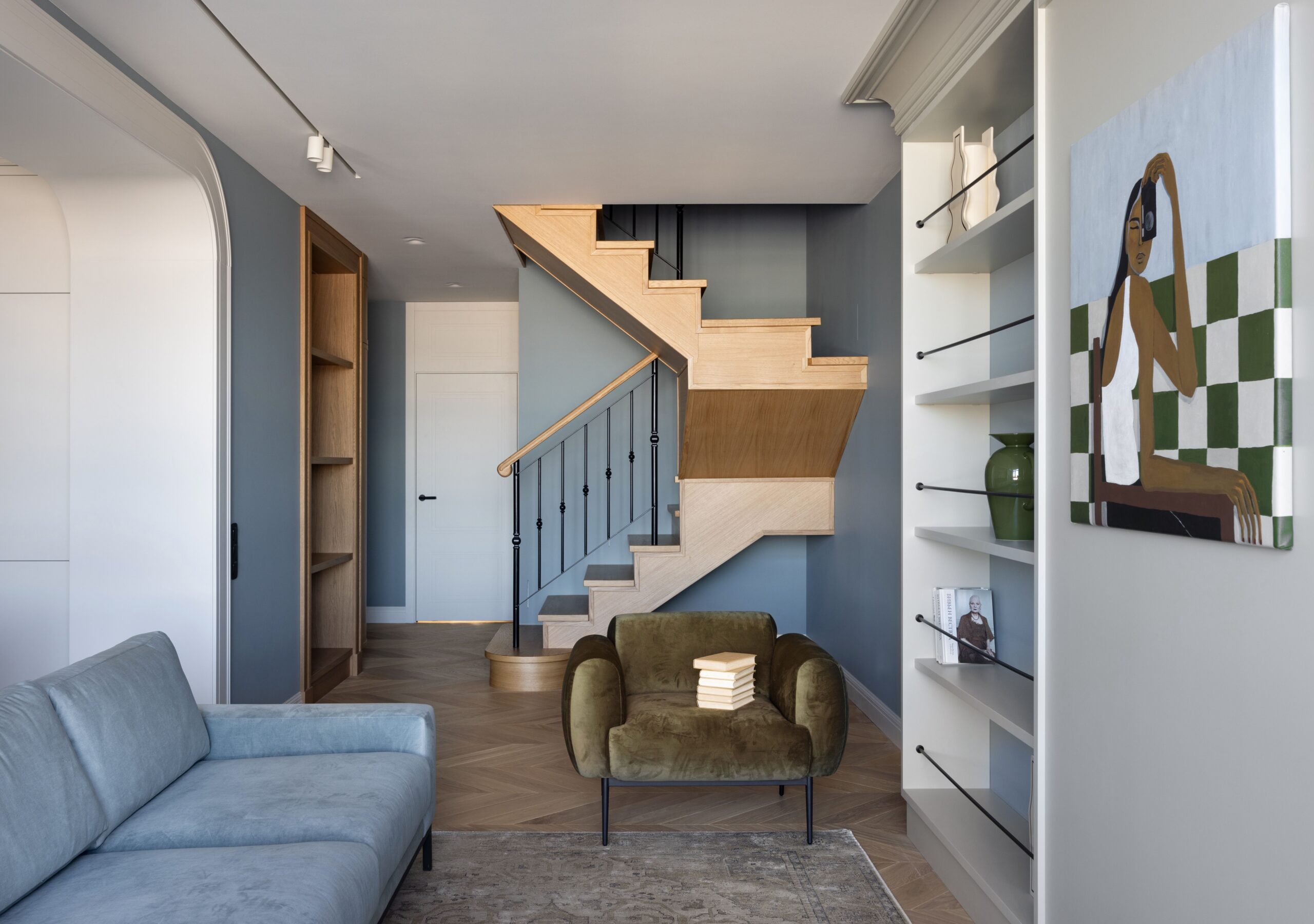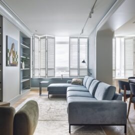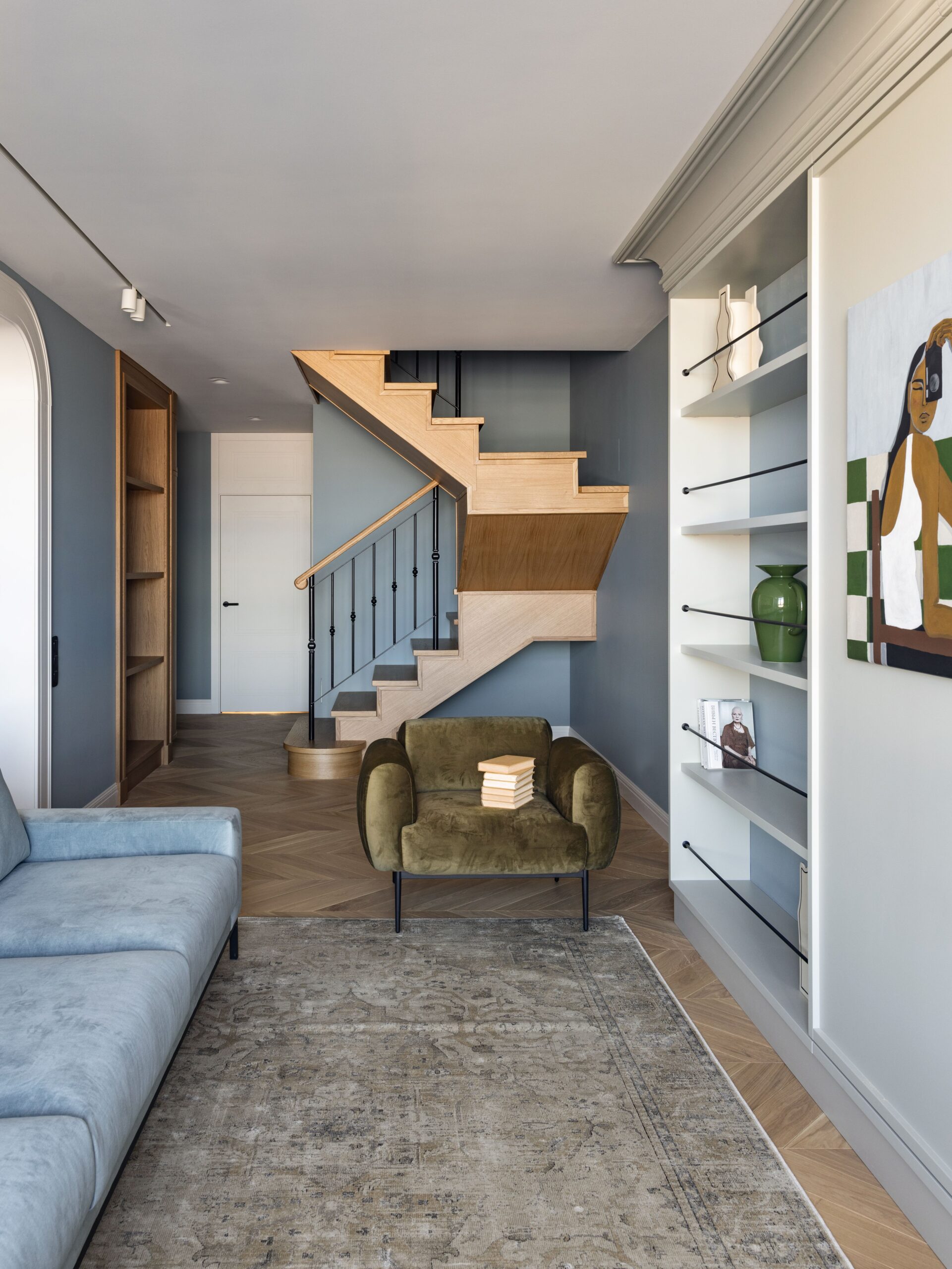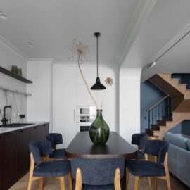 Дворівневі апартаменти для сім’ї з двома доньками-підлітками та йоркширським тер’єром розташовані в одному з нових житлових комплексів Києва. Основними інструментами дизайнерки Ольги Русакової в роботі над цим проєктом стали колір та специфічне зонування, коли приватна зона батьків умовно відділена вад загального простору.