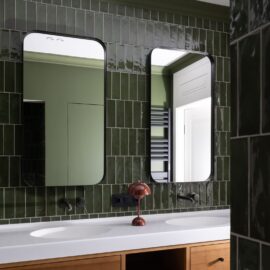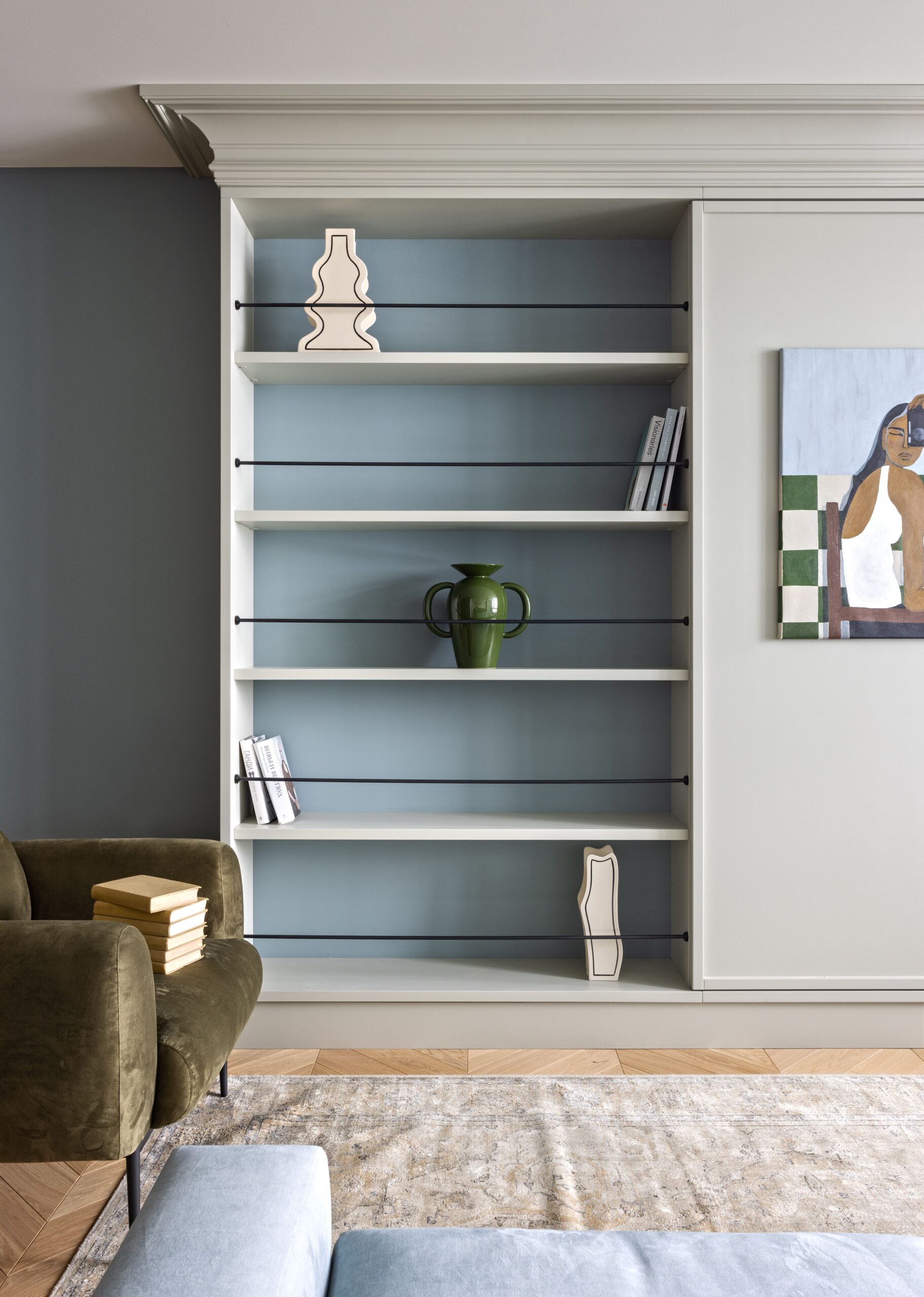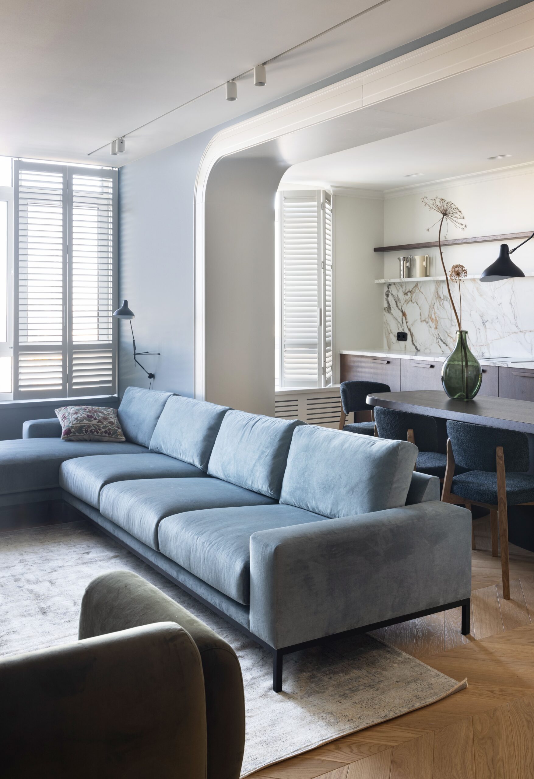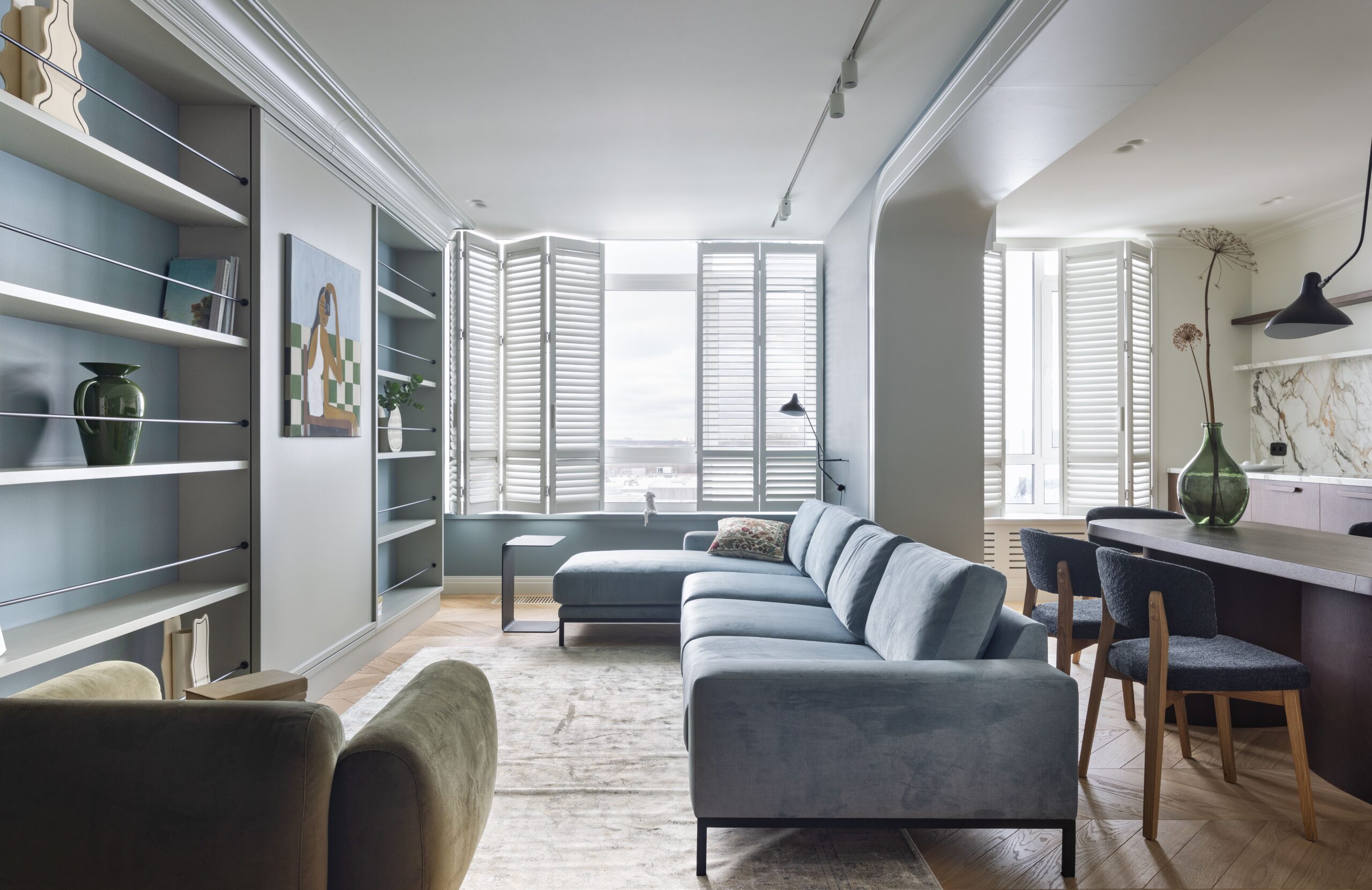 Вікна кухні виходять на дах торговельного центру, тож, щоб компенсувати урбаністичний краєвид, в інтер’єрі зробили акцент на кольорі. Відтінки синього та глибокий зелений відсилають до подорожі клієнтів у Португалію та їхньої любові до середземноморських мотивів. Шатерси на вікнах – також данина середземноморській стилістиці та бажанню перекрити сумний краєвид.