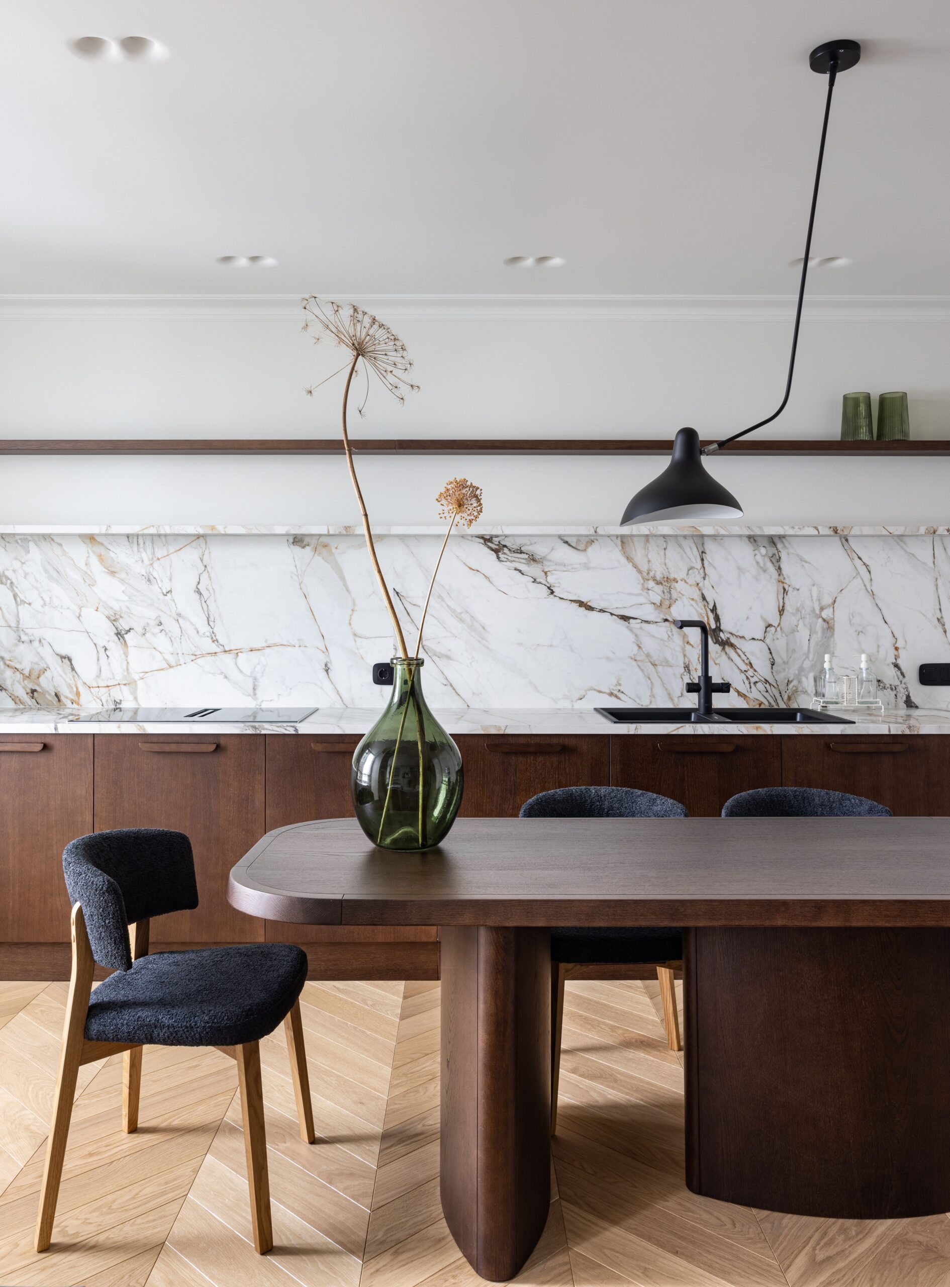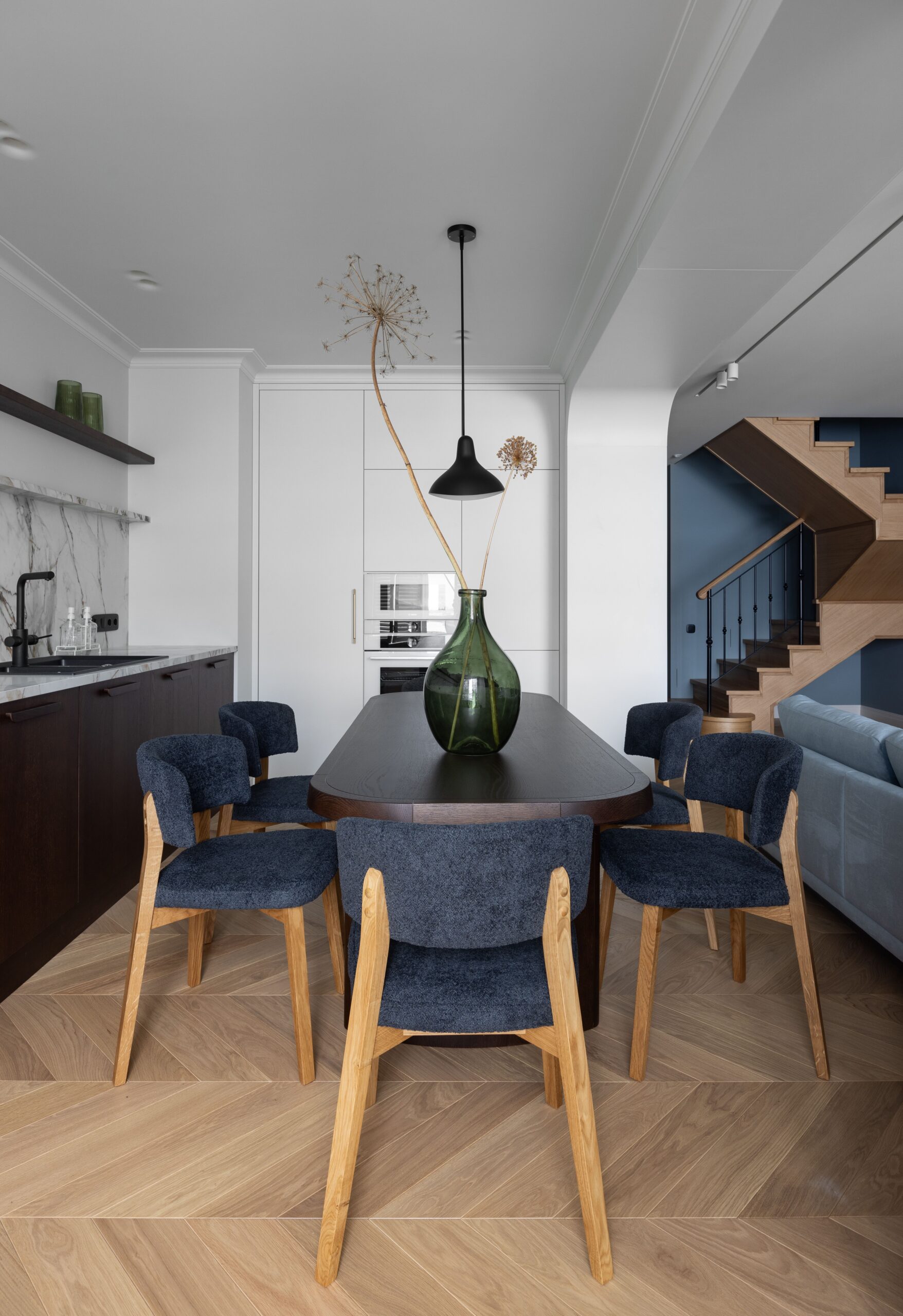 Щоб збалансувати холодну кольорову гаму, в інтер’єрі використали теплий білий тон і різні види деревини – на підлозі та фасадах меблів. Паркет покрили матовим лаком, що додало йому приємної тактильності.