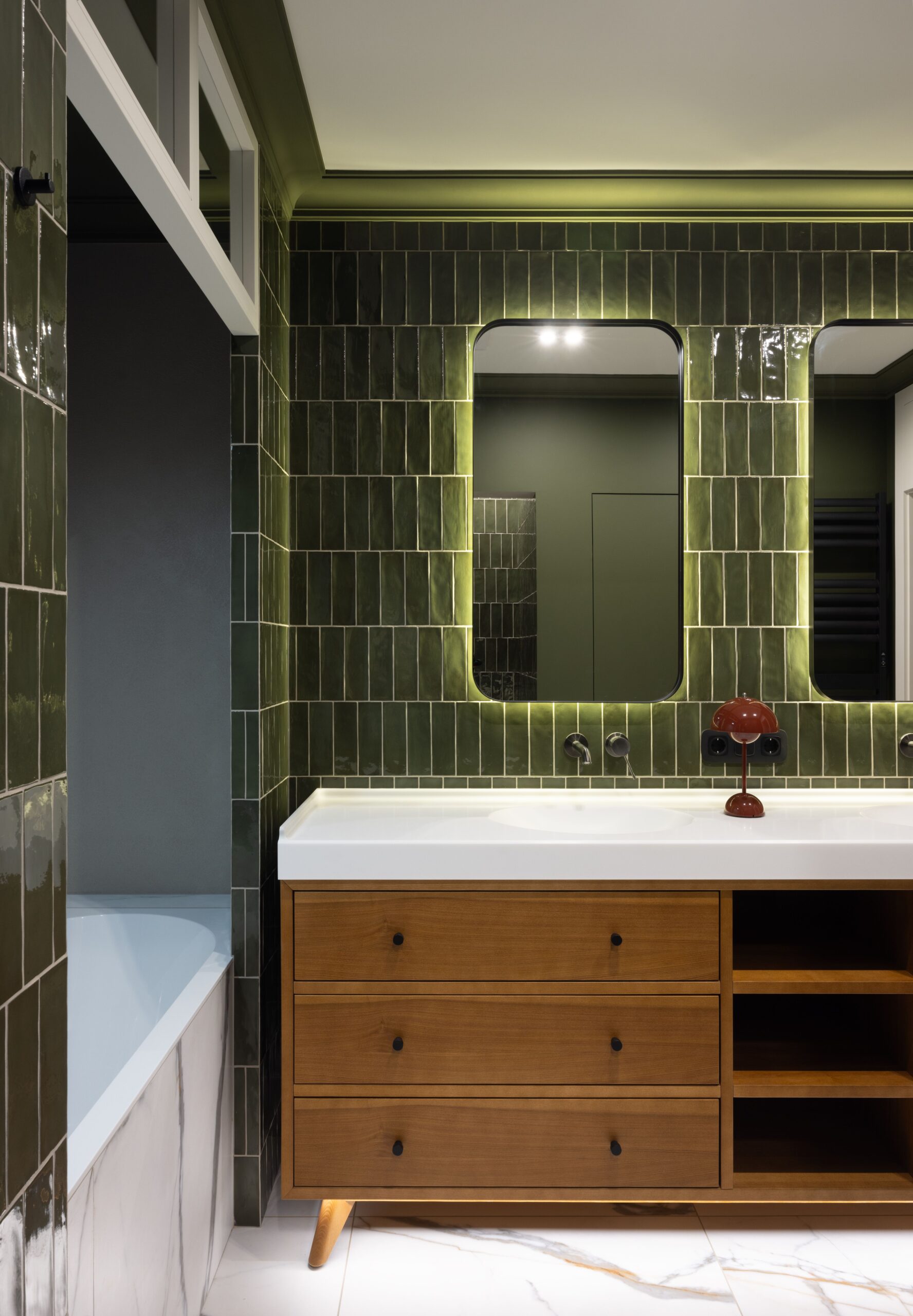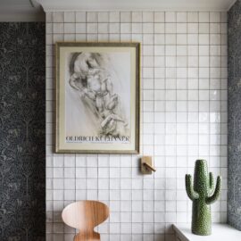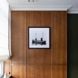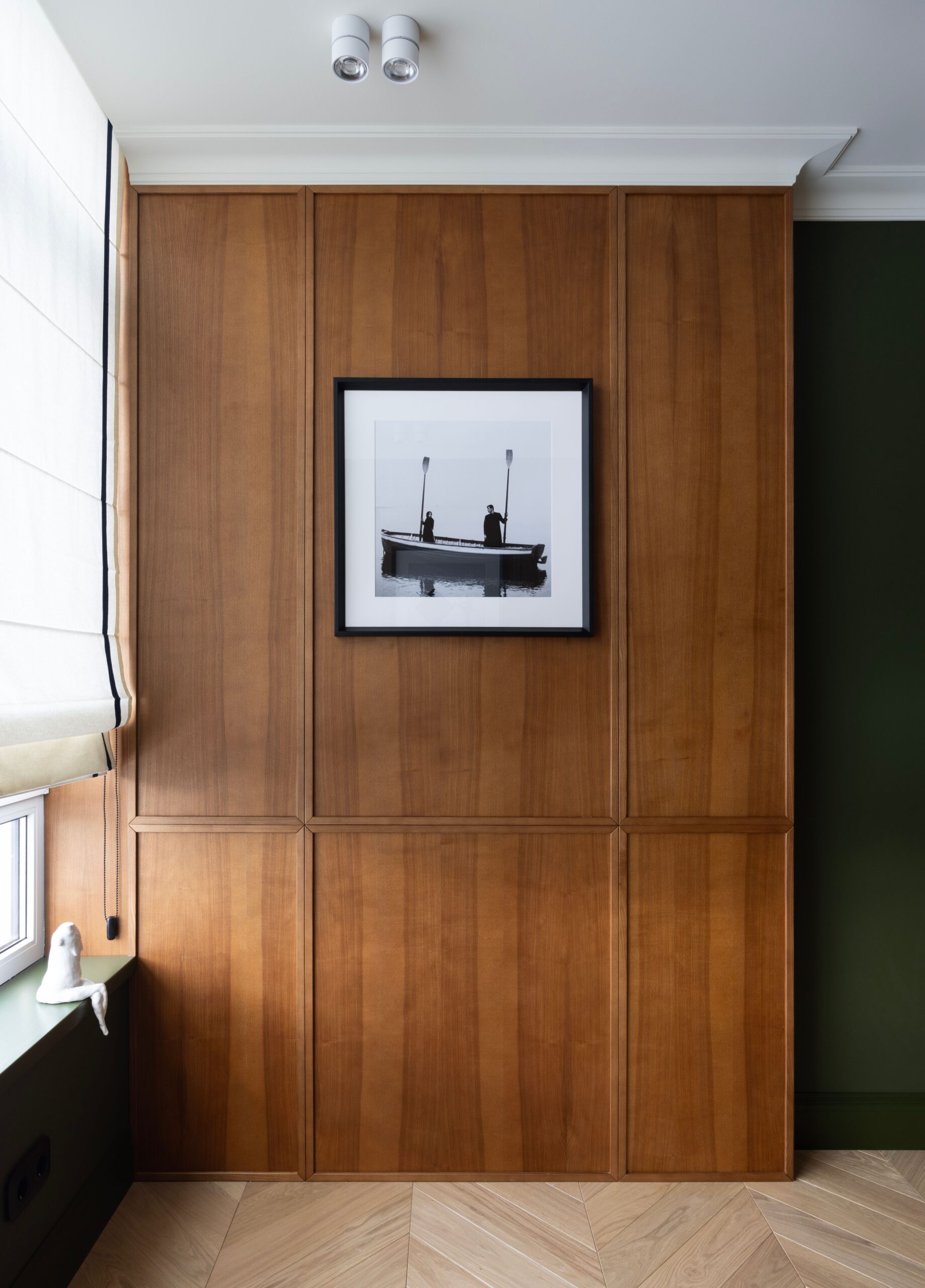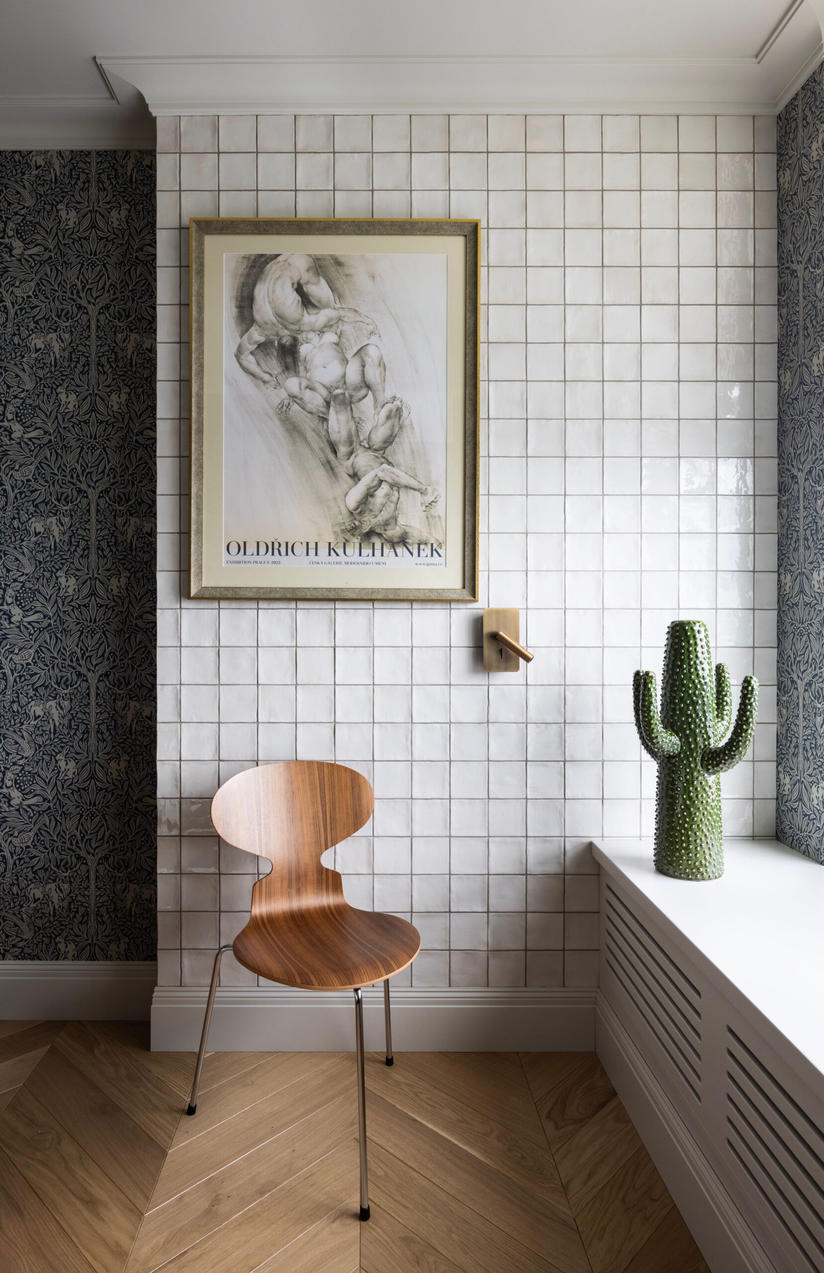 Стіни кабінету мають виступаючі пілони – конструктивні елементи, що залишилися після приєднання лоджії. “Коли в тебе є такі елементи стін, які виступають і візуально порушують гармонію простору, їх потрібно або сховати, зрівнявши рівень стін, або підкреслити, щоб вони стали візуально цікавою деталлю. В цьому випадку ми обрали другий прийом і підкреслили пілон плиткою, наче це декор пічки або каміна», – ділиться дизайнерка. Так у кабінеті з’явилася біла кахельна поверхня. Постер на ній – привезений клієнткою з музейної крамниці в Празі.