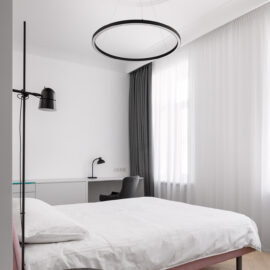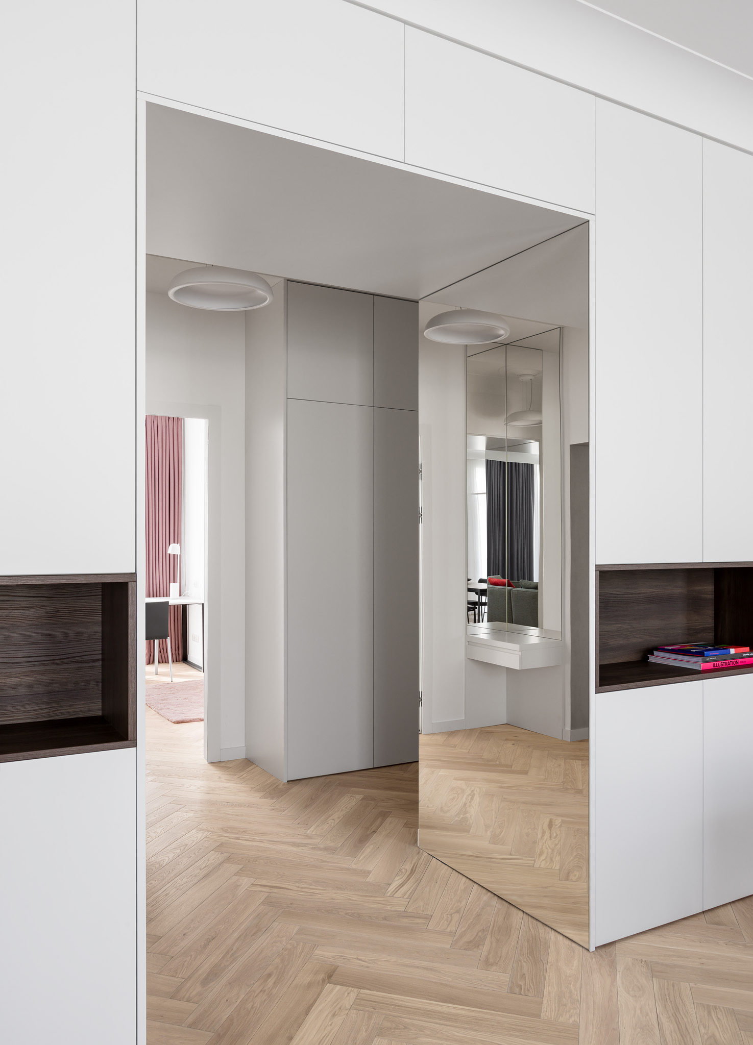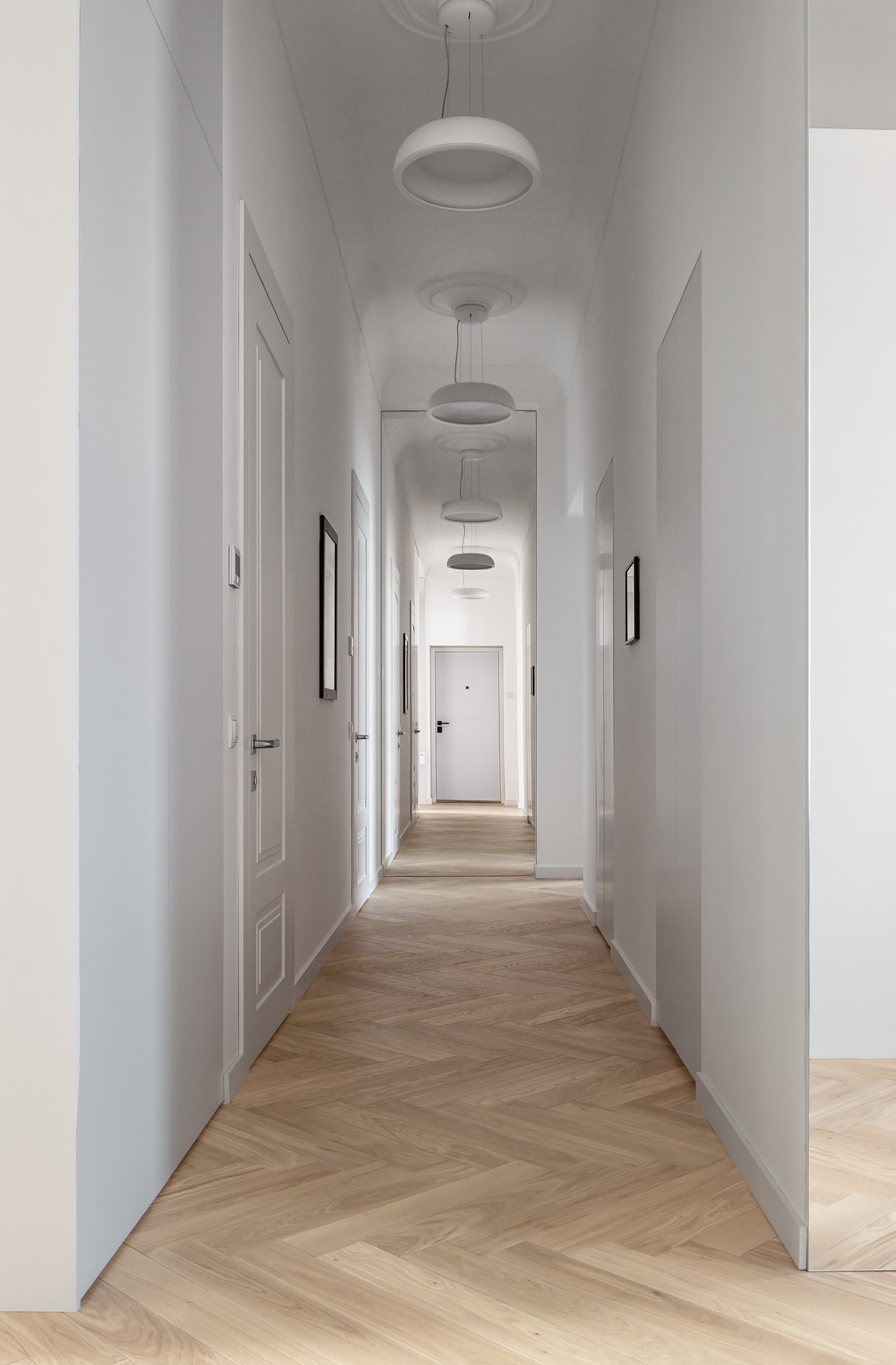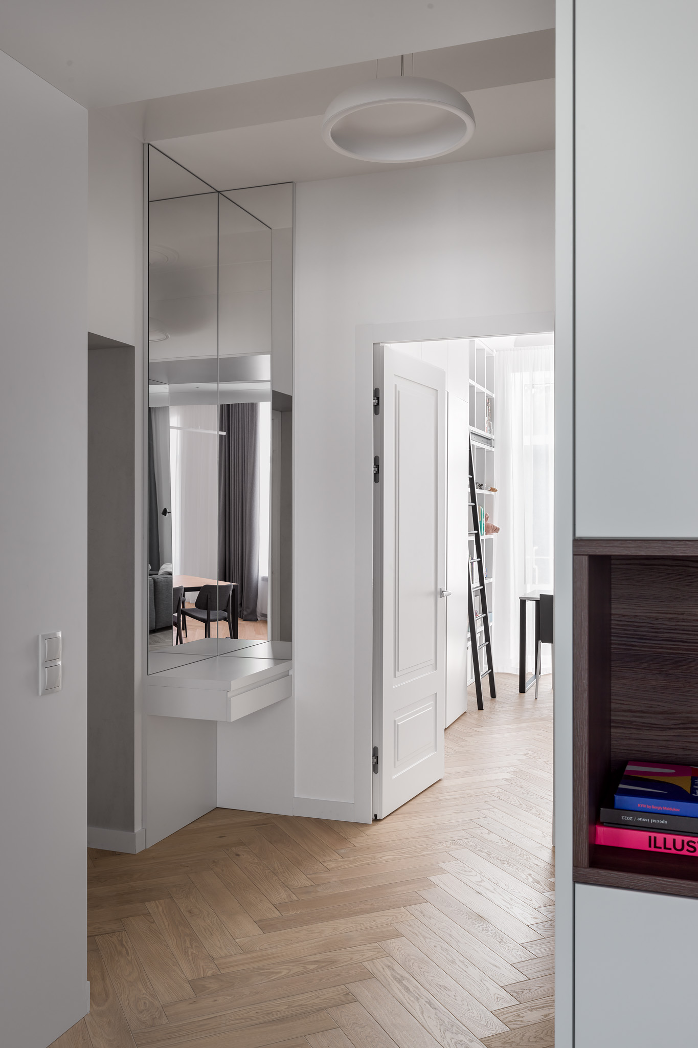 Майже нескінченний коридор від входу — зроблений ще довшим, шляхом дзеркал. Завеликий для традиційного паркету паркет «ялинкою», гігантська «мармурова крошка» плитки у ванній кімнаті, підвіконня з можливістю посидіти, штора у відкритому гардеробі замість скла, гігантська розетка на стелі, стільці, що нагадують меблі шкільних їдалень — все це виразний букет дитячих вражень.