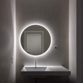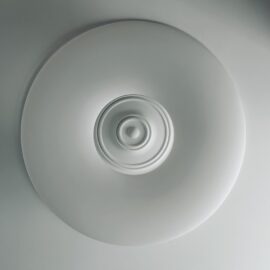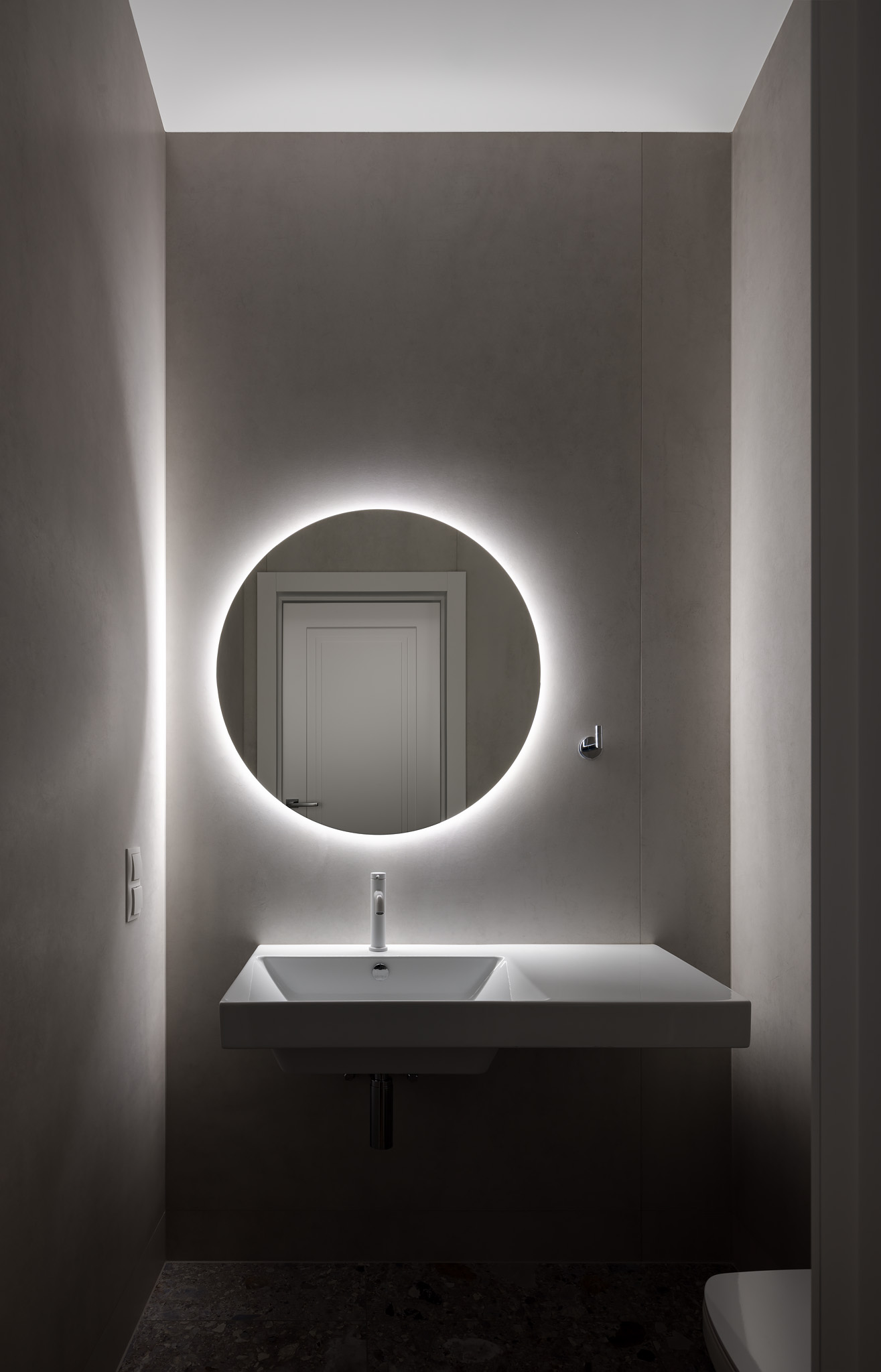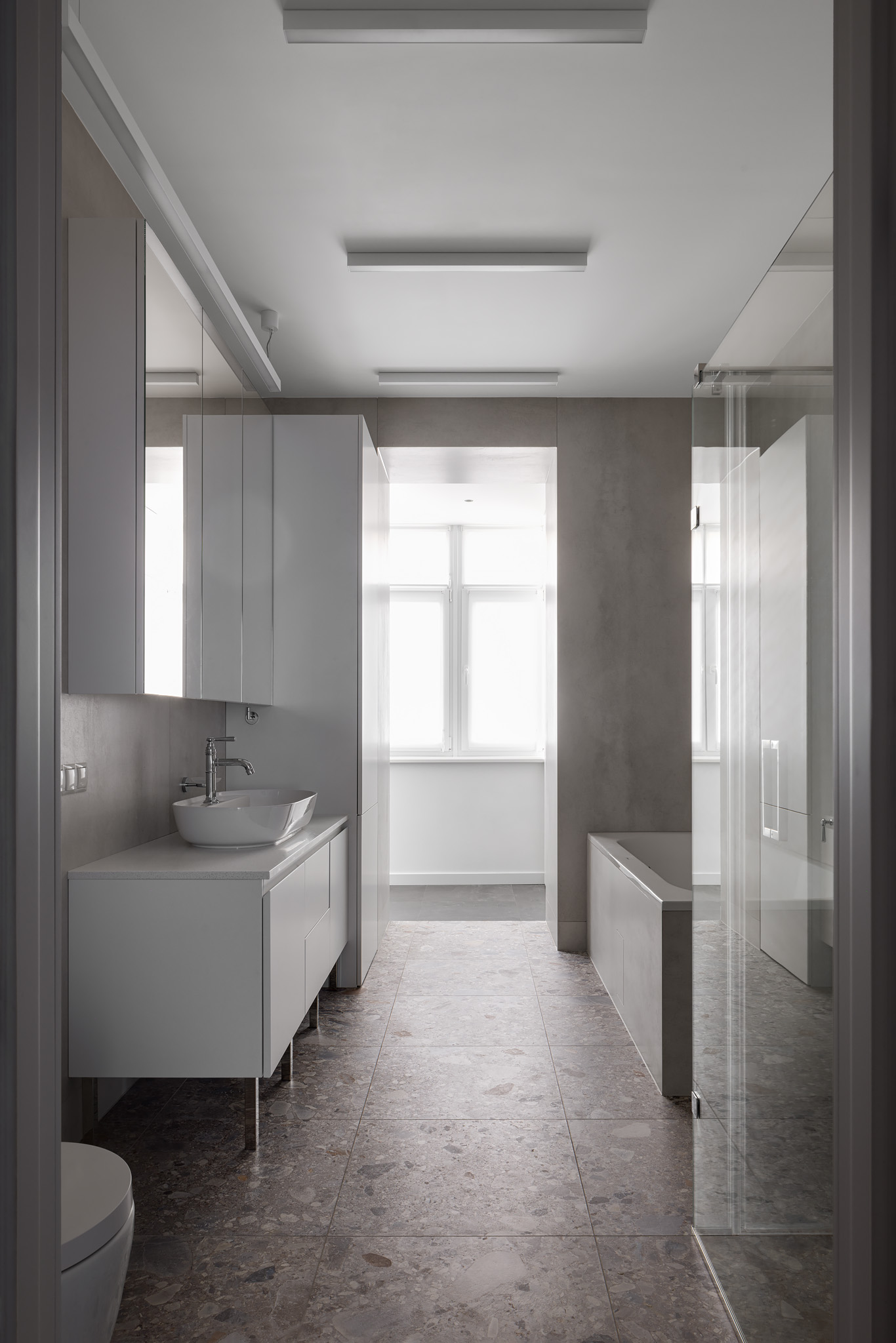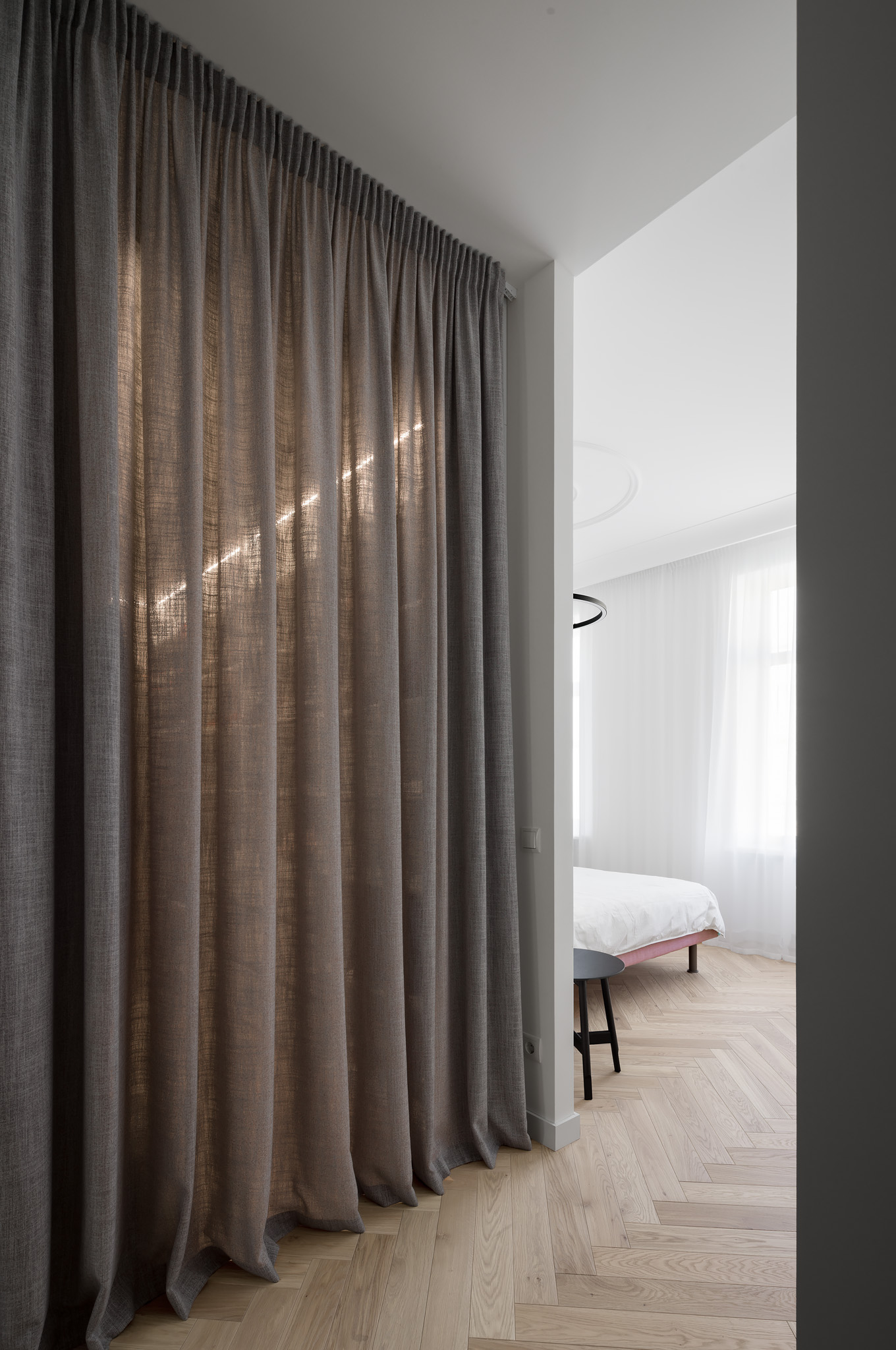 Майже нескінченний коридор від входу — зроблений ще довшим, шляхом дзеркал. Завеликий для традиційного паркету паркет «ялинкою», гігантська «мармурова крошка» плитки у ванній кімнаті, підвіконня з можливістю посидіти, штора у відкритому гардеробі замість скла, гігантська розетка на стелі, стільці, що нагадують меблі шкільних їдалень — все це виразний букет дитячих вражень.