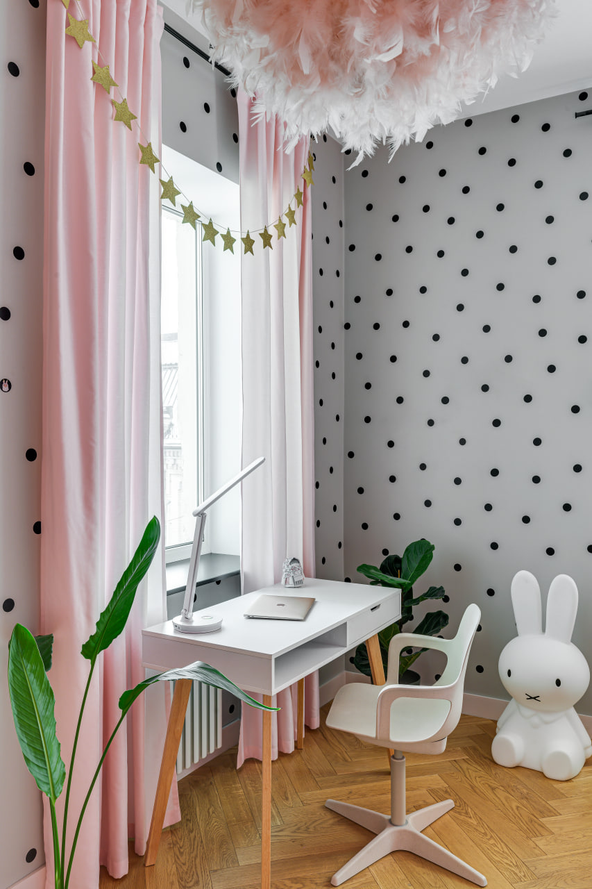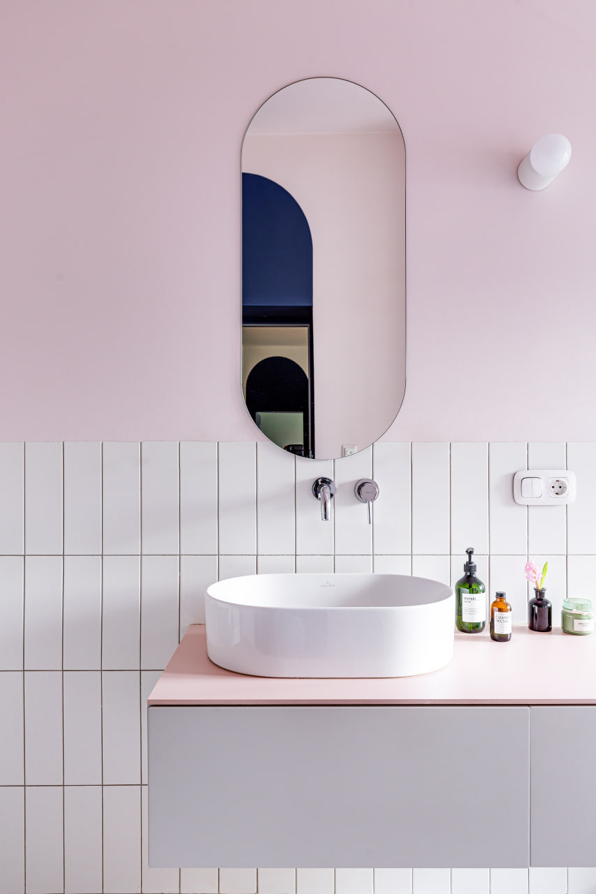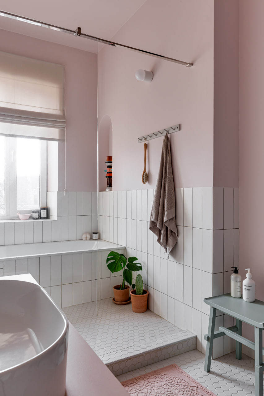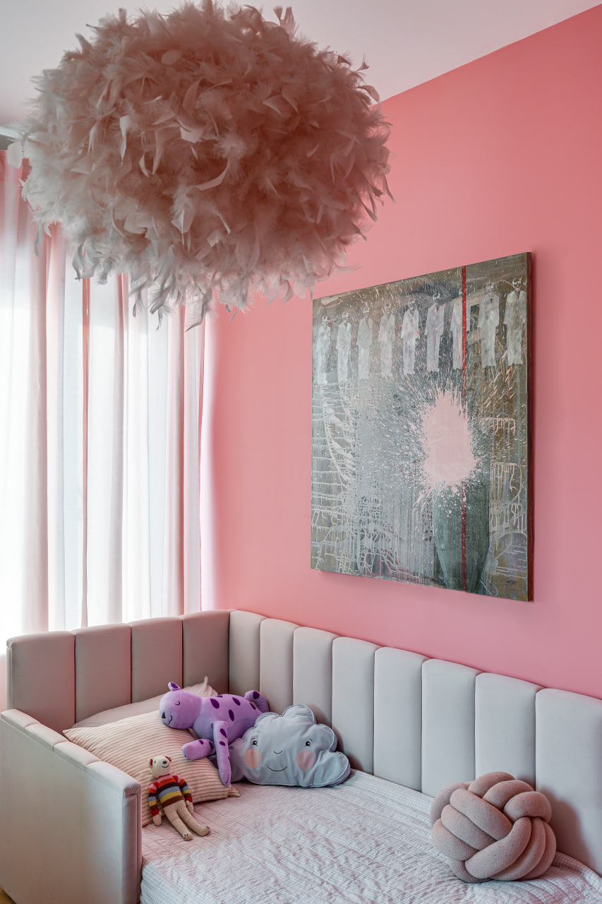 Ще одну кімнату, яка за розмірами релевантна вітальні, сімейне подружжя альтруїстично віддало донечці-підлітку (і це з її подачі в інтер’єрі з’явився досить зухвалий насичений відтінок рожевого). А з нарізки дрібних додаткових приміщень (були окремі туалет, ванна та кладова) зробили суцільний простір світлої ванної кімнати.