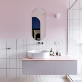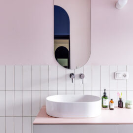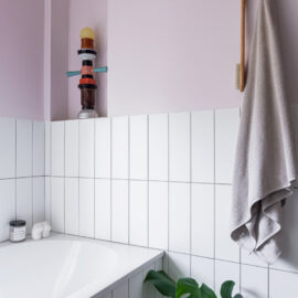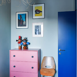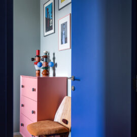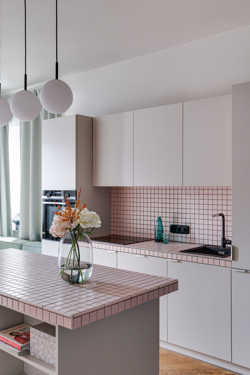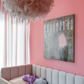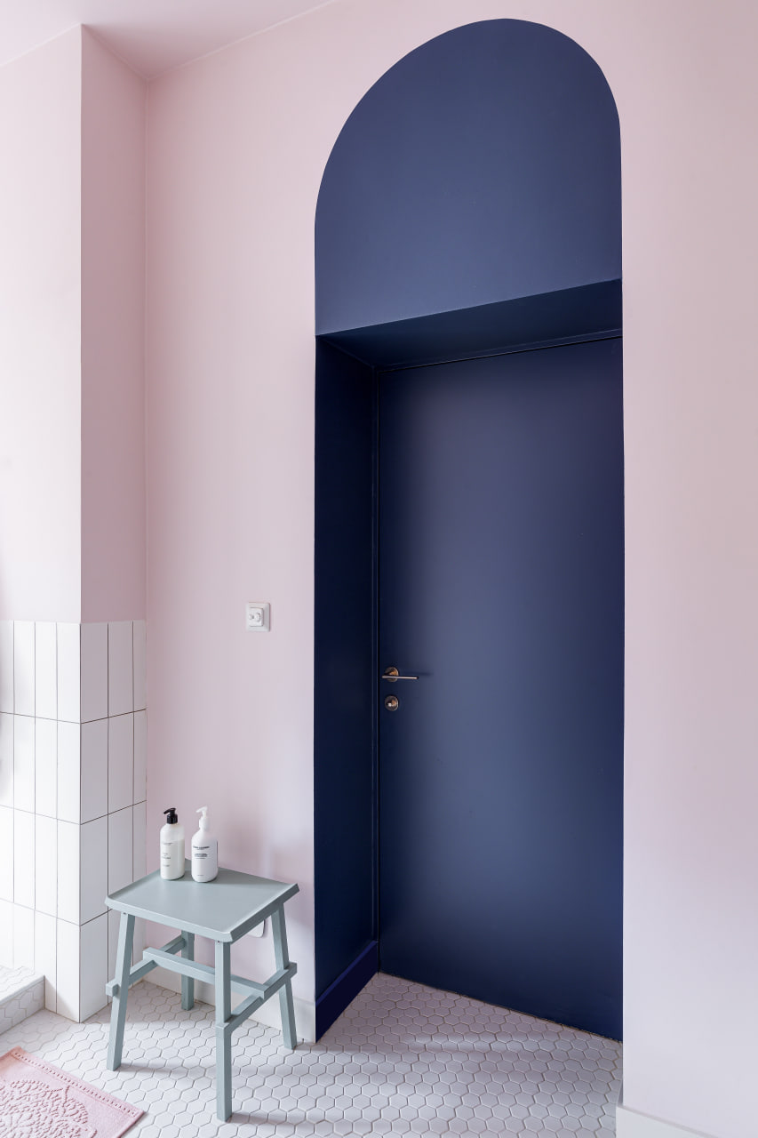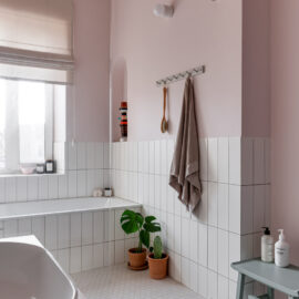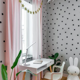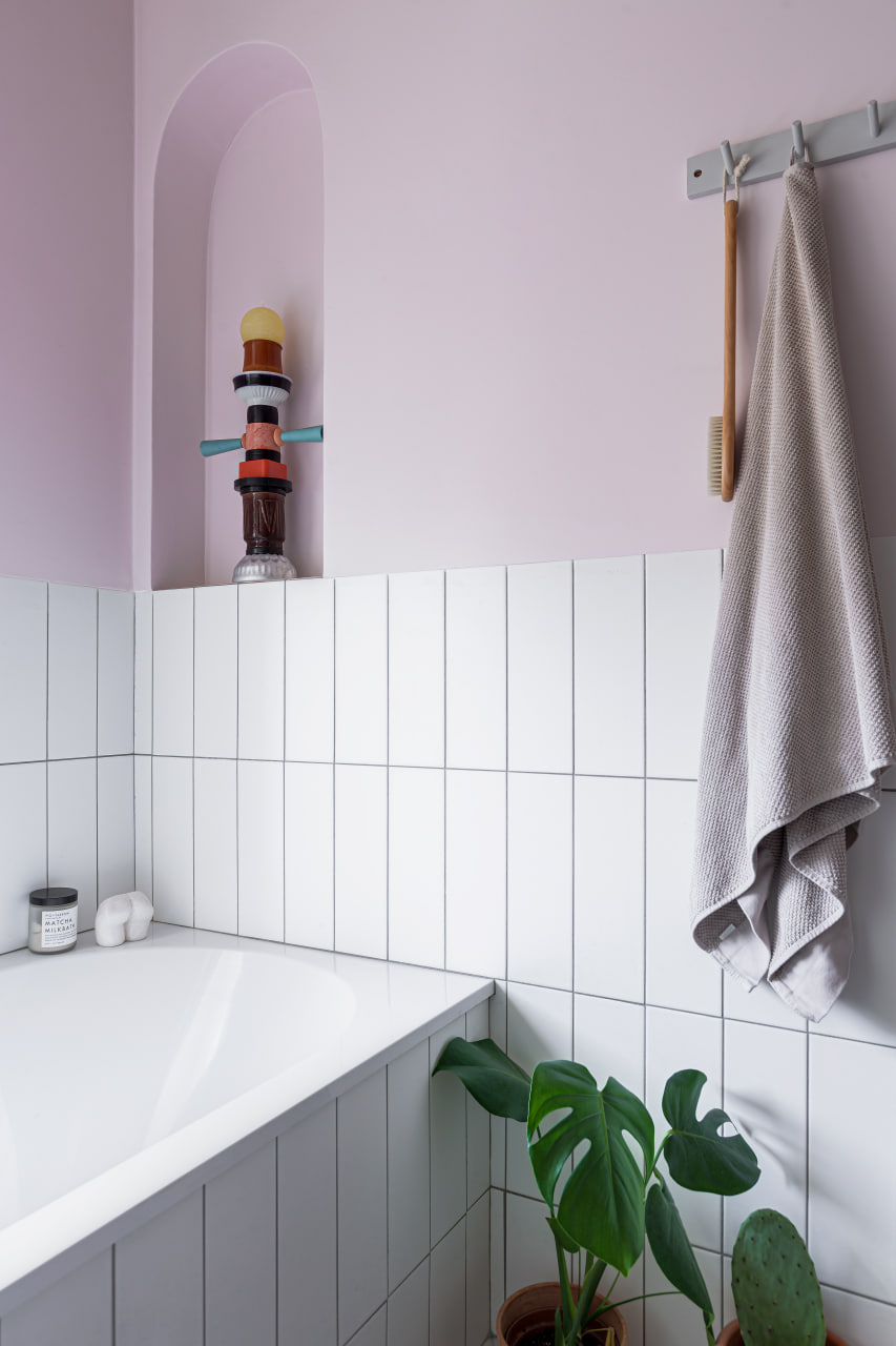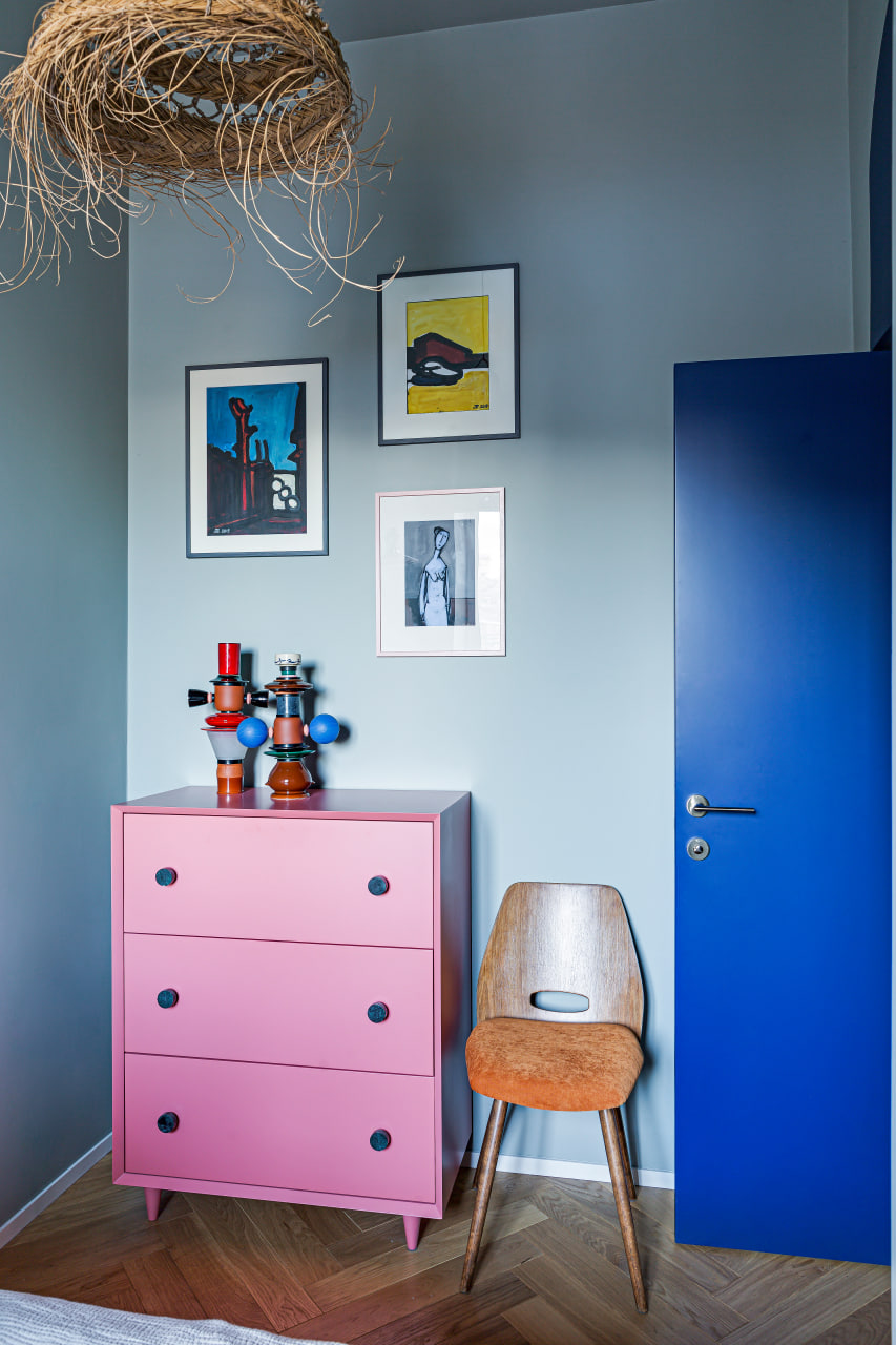 Ще одну кімнату, яка за розмірами релевантна вітальні, сімейне подружжя альтруїстично віддало донечці-підлітку (і це з її подачі в інтер’єрі з’явився досить зухвалий насичений відтінок рожевого). А з нарізки дрібних додаткових приміщень (були окремі туалет, ванна та кладова) зробили суцільний простір світлої ванної кімнати.