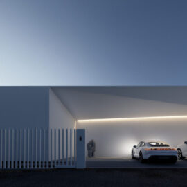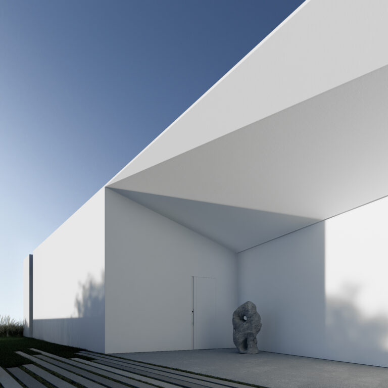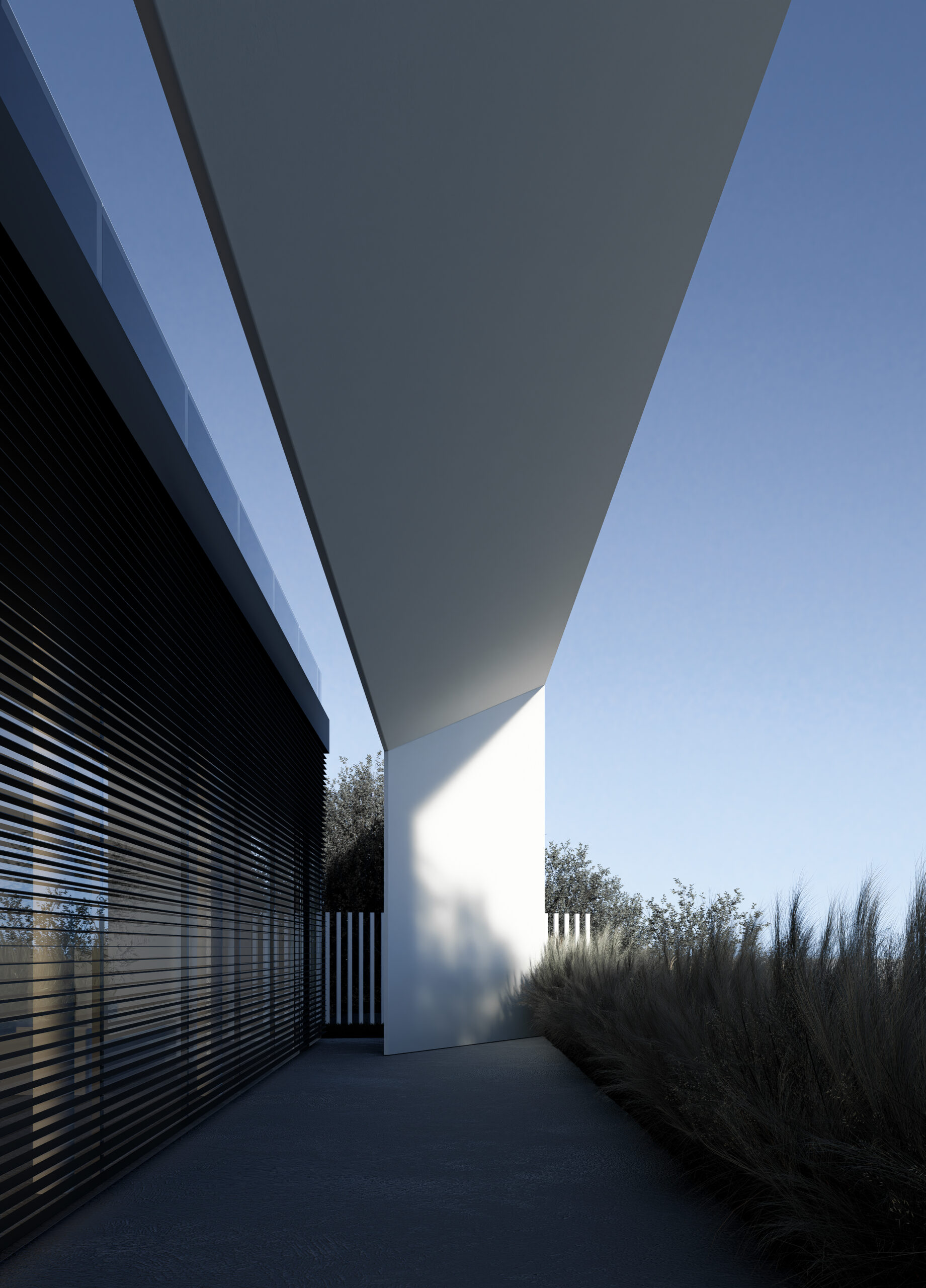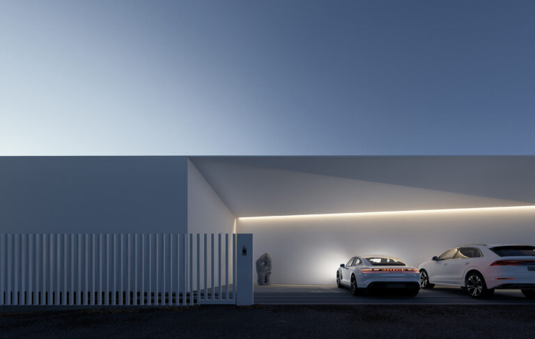Переднє подвір’я – зона перед головним входом до будинку, з розташованою поруч парковкою для автомобілів. Простір продуманий так, щоб бути функціональним і зручним, водночас не порушуючи мінімалістичної естетики.