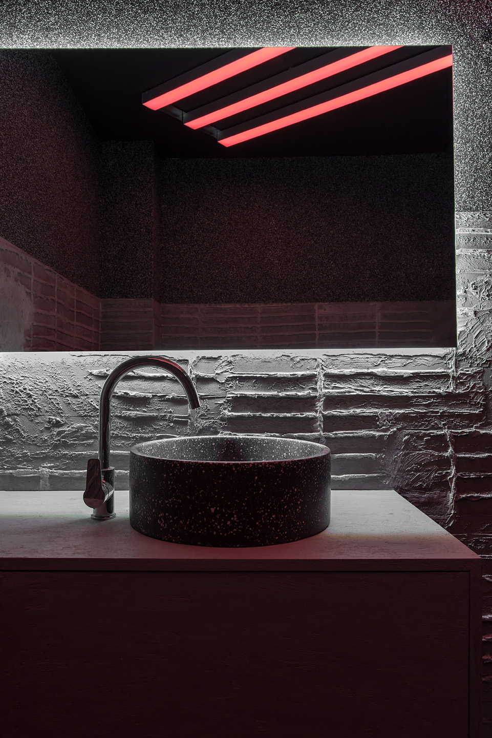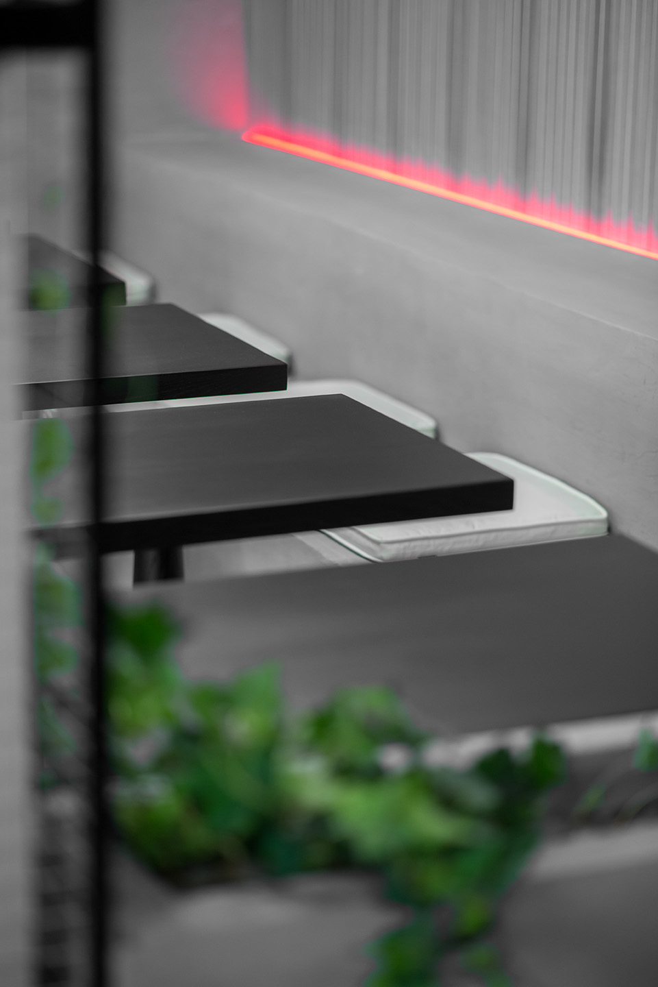 Весь посуд закладу і навіть сама їжа мають акцентний колір, який виділяється на тлі грубих інтер’єрних рішень, а головне — на чорній стільниці.