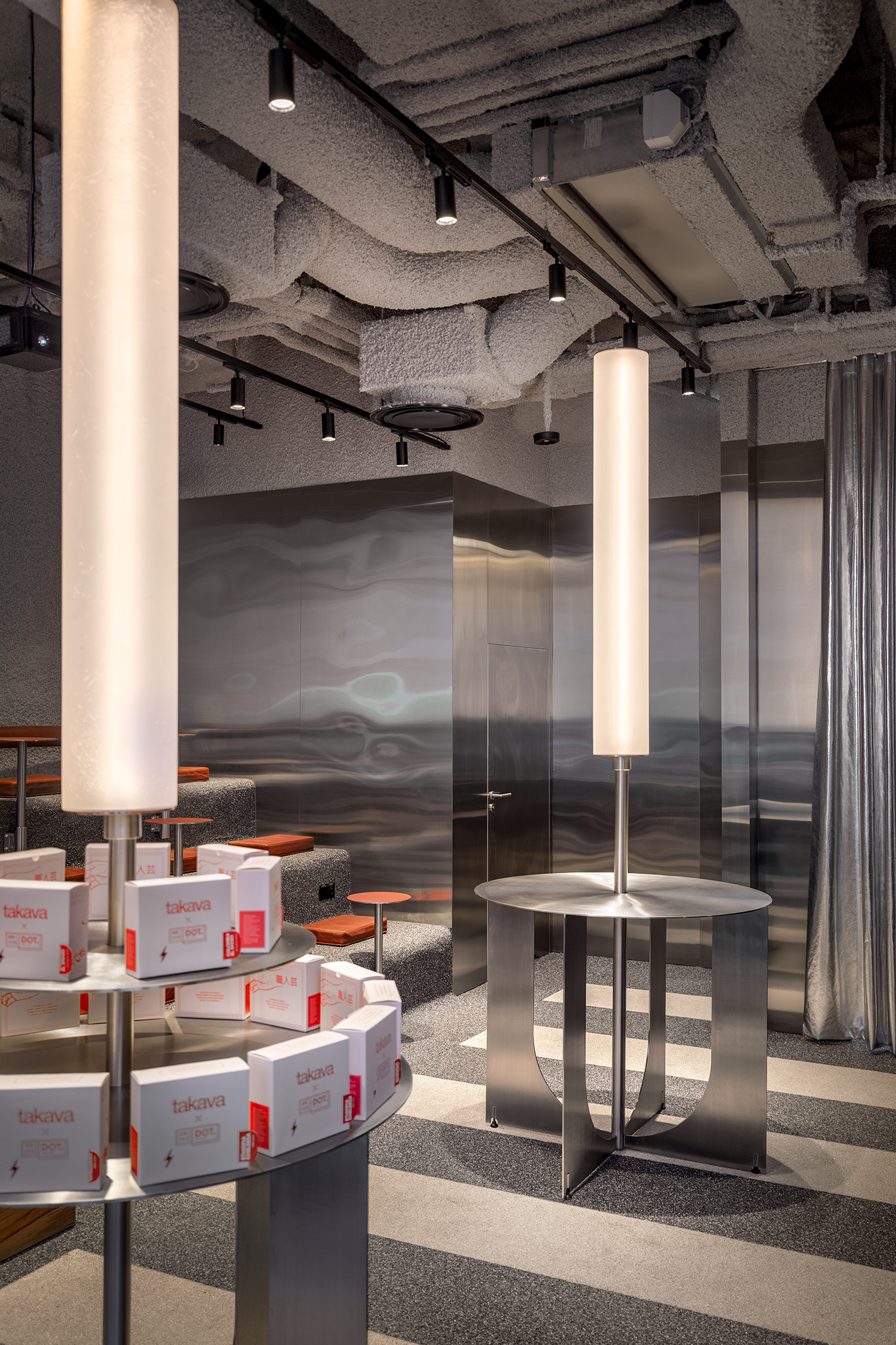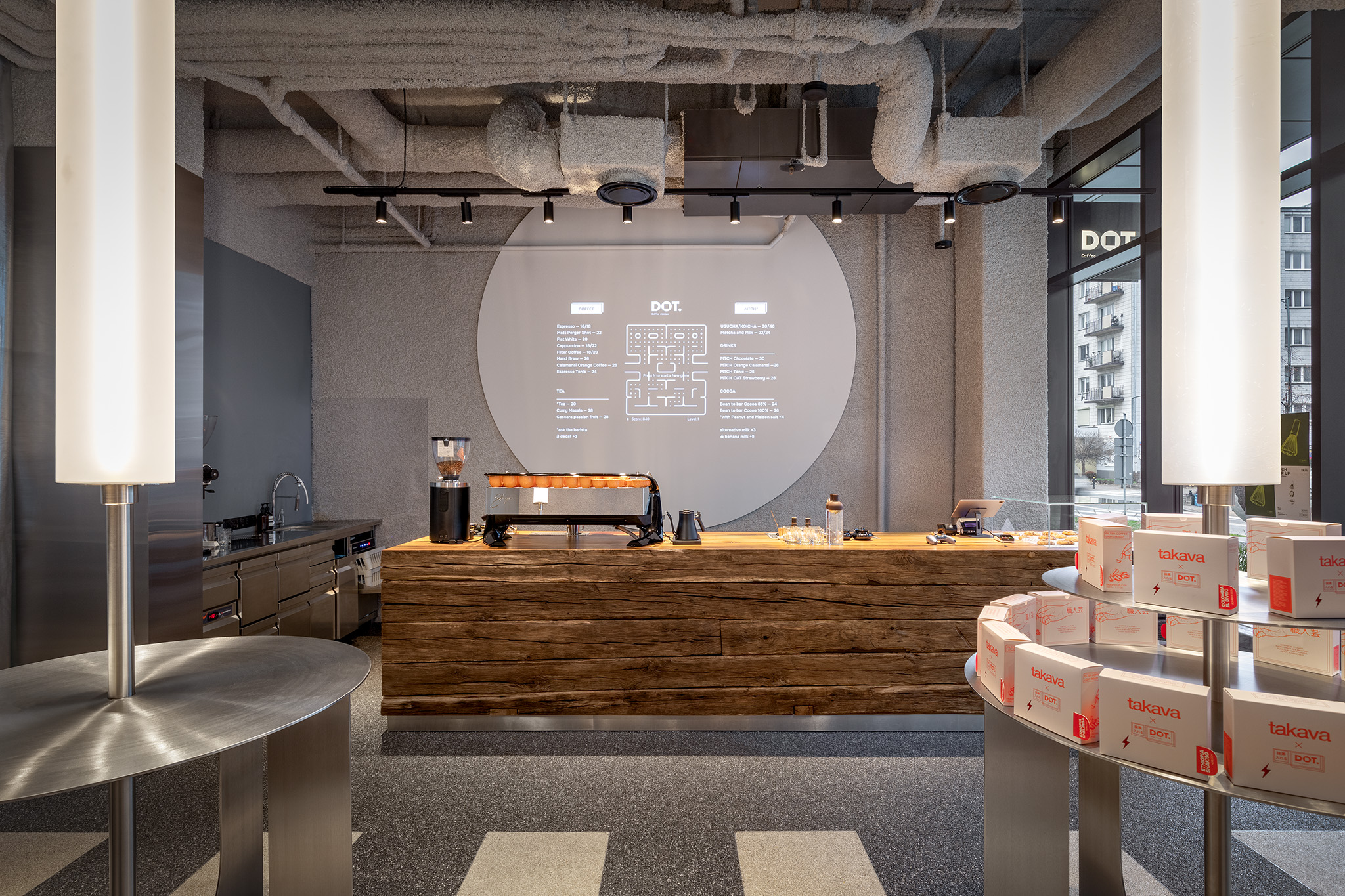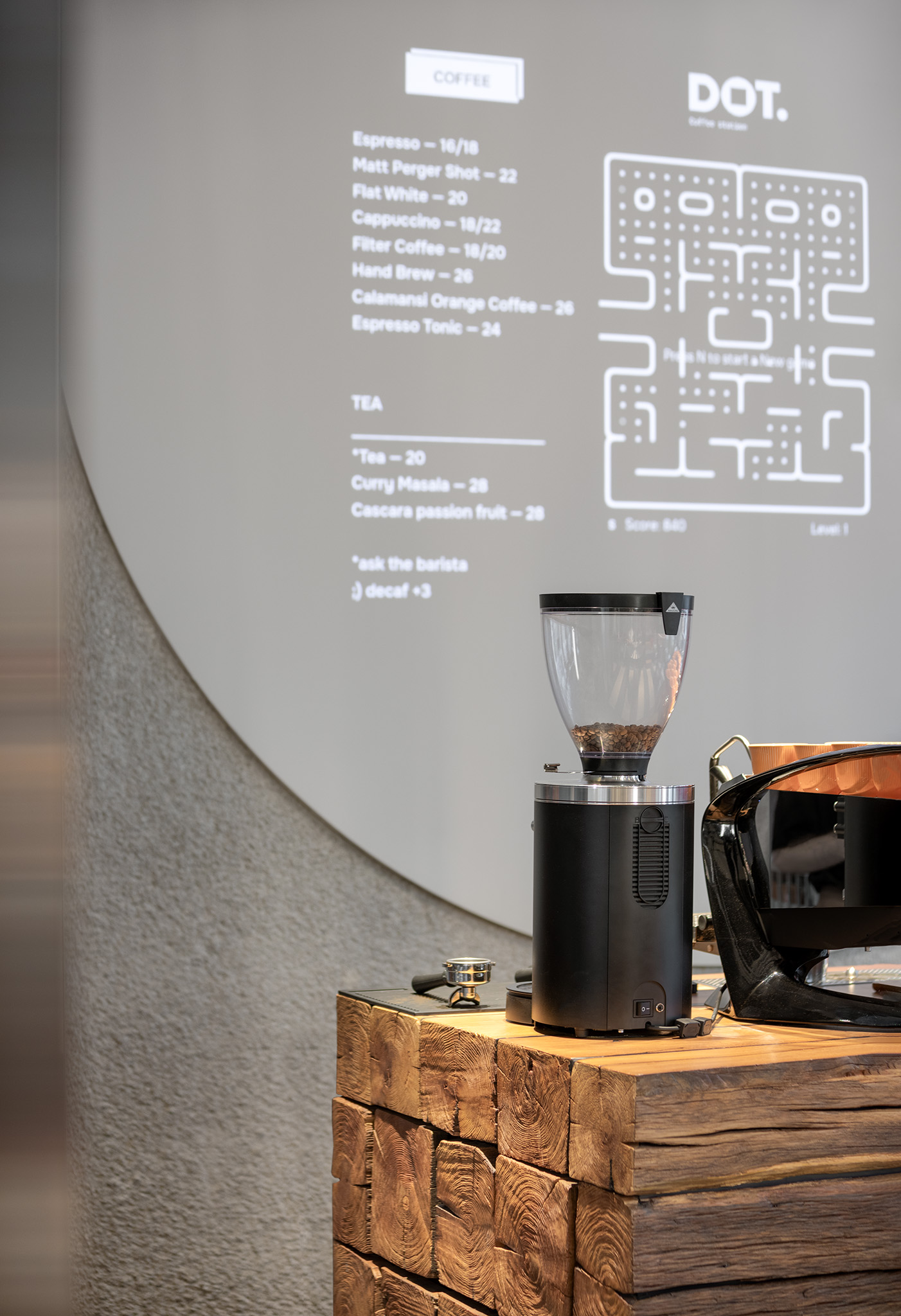 Ключовим елементом інтер’єру стала масивна барна стійка з дерев’яних балок, що вже були у використанні. На ній розміщені кавомашина, матча-станція та вітрина з десертами. Така виразна, важка форма є фірмовим елементом усіх закладів DOT і формує візуальний центр простору. Додатковий шар взаємодії створює проекція меню на стіні позаду бару та можливість зіграти в Pac-Man за допомогою джойстика під час очікування напою – елемент гри, який органічно вплітається в міський ритм і перетворює паузу на досвід.