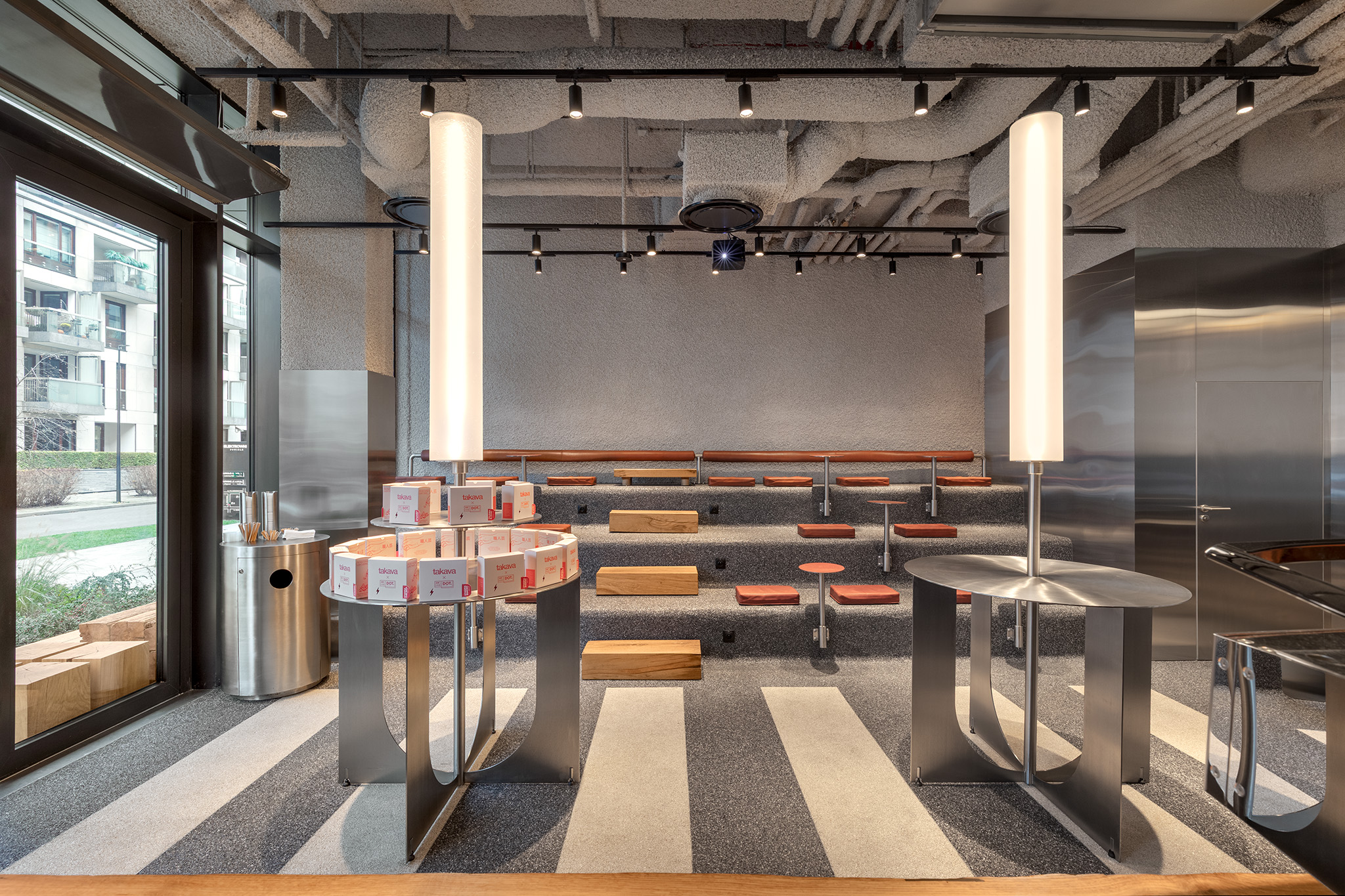 Інтер’єр з великими вітражними вікнами та мінімалістичними функціональними рішеннями переосмислює формат кав’ярні як повноцінного міського social space. На відміну від київських локацій бренду, орієнтованих переважно на формат to-go, цей простір задуманий як місце, де люди залишаються, проводять час і взаємодіють одне з одним. Зона з ярусною посадкою заохочує неформальну комунікацію: відвідувачі займають різні рівні, спілкуються та спостерігають за життям довкола. Таке рішення працює за принципом комунального столу, але без власне столу.