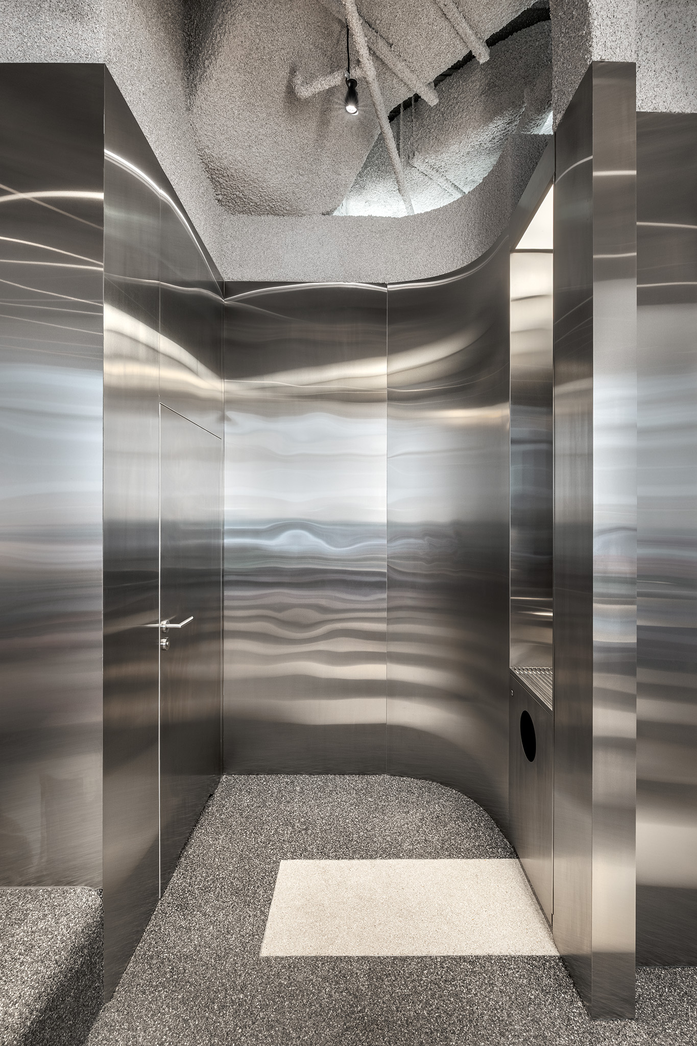 Наскрізною темою інтер’єру став урбанізм, проявлений через матеріали та графіку. Підлогове покриття асоціюється з асфальтом, а розмітка на ньому відсилає до міської інфраструктури – пішохідного переходу в залі та паркінгових маркувань у вбиральні.