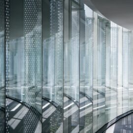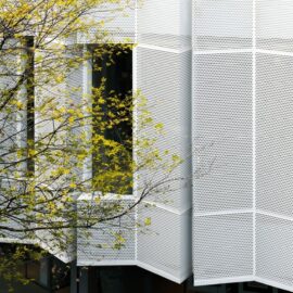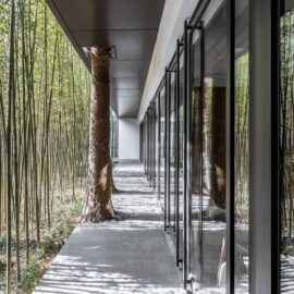 От агрессивного уличного пейзажа комплекс защищает решетка с вертикальным рисунком, вдоль которой высажены хвойники и бамбук. Несмотря на ограждение, комплекс является доступной частью общественного пространства.