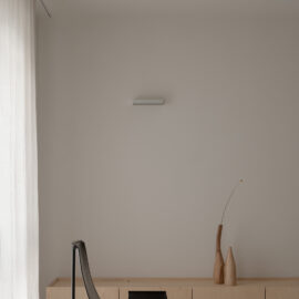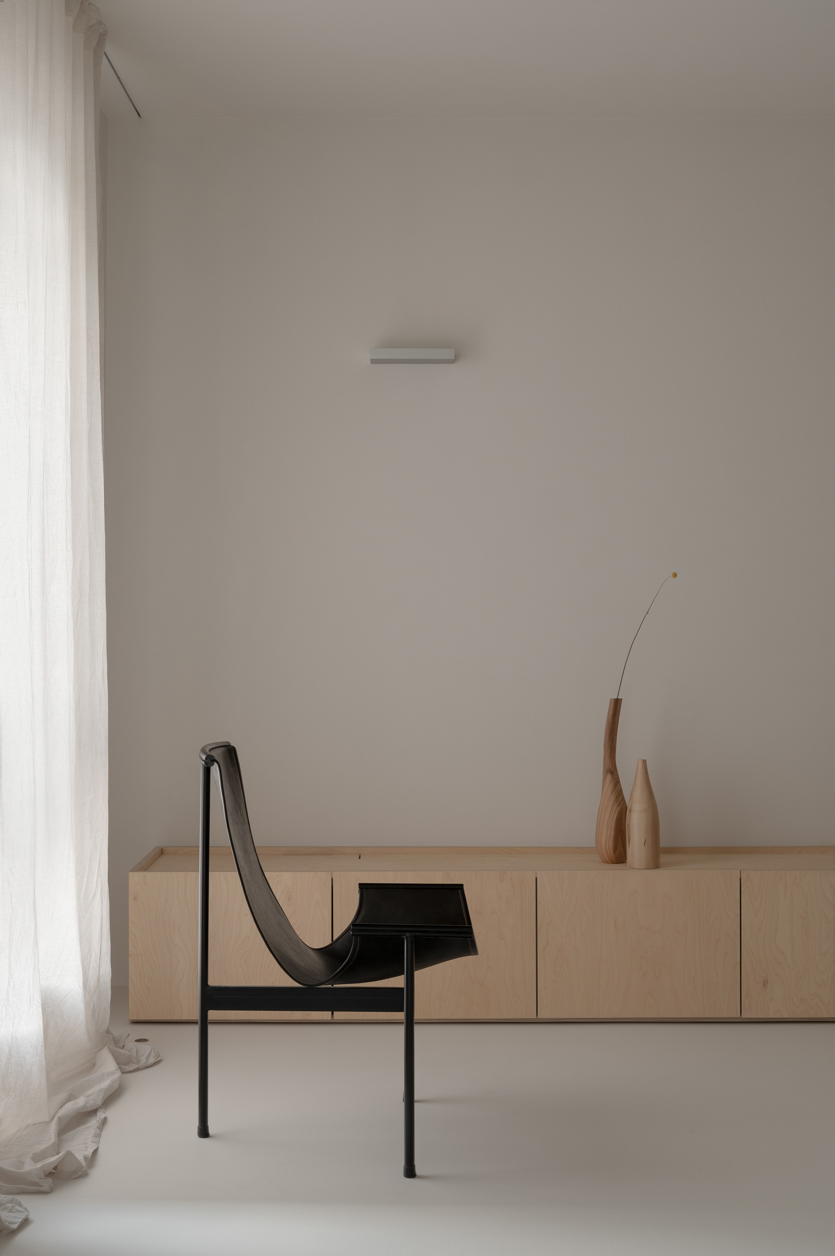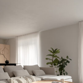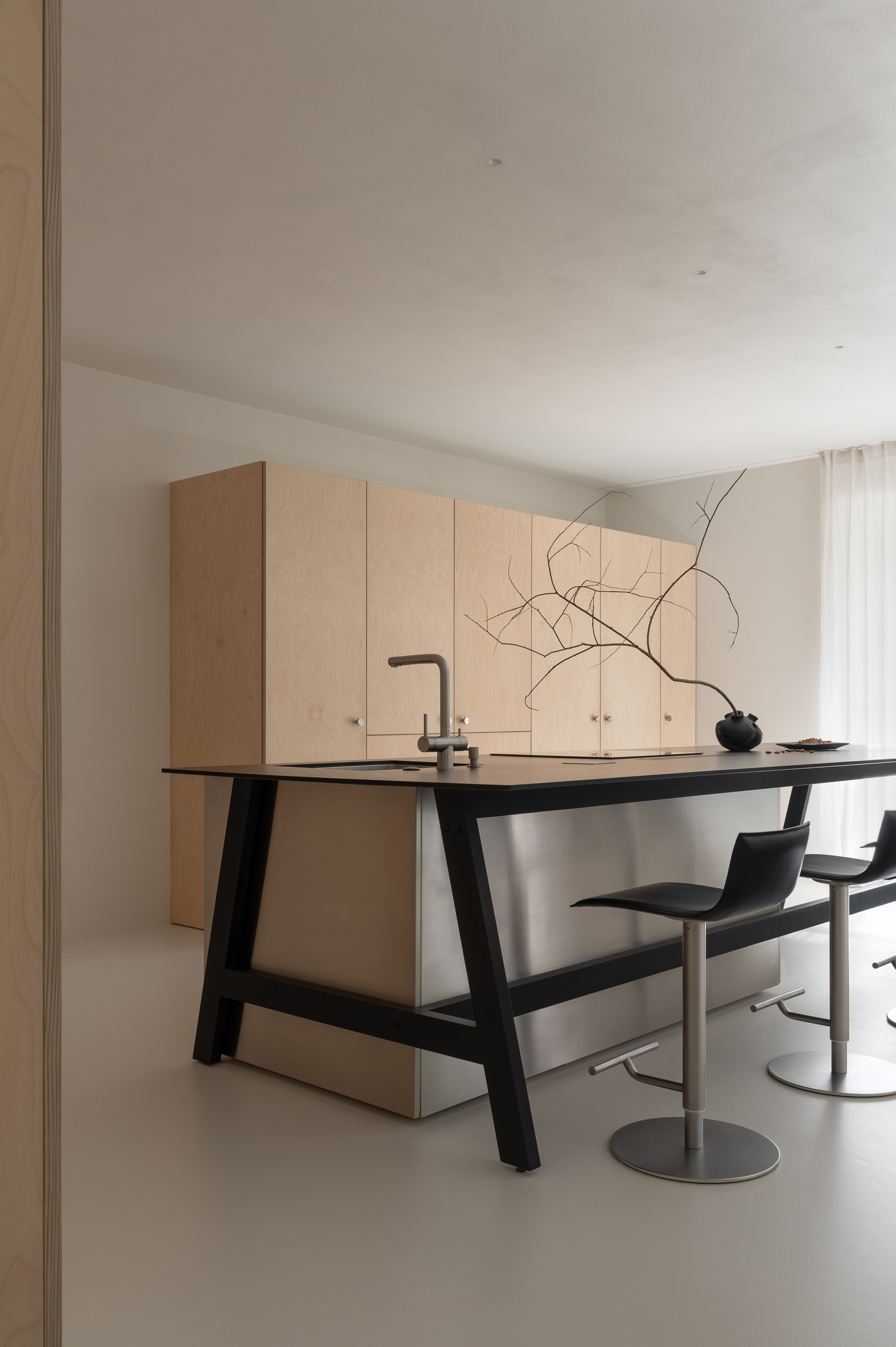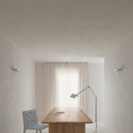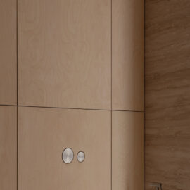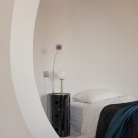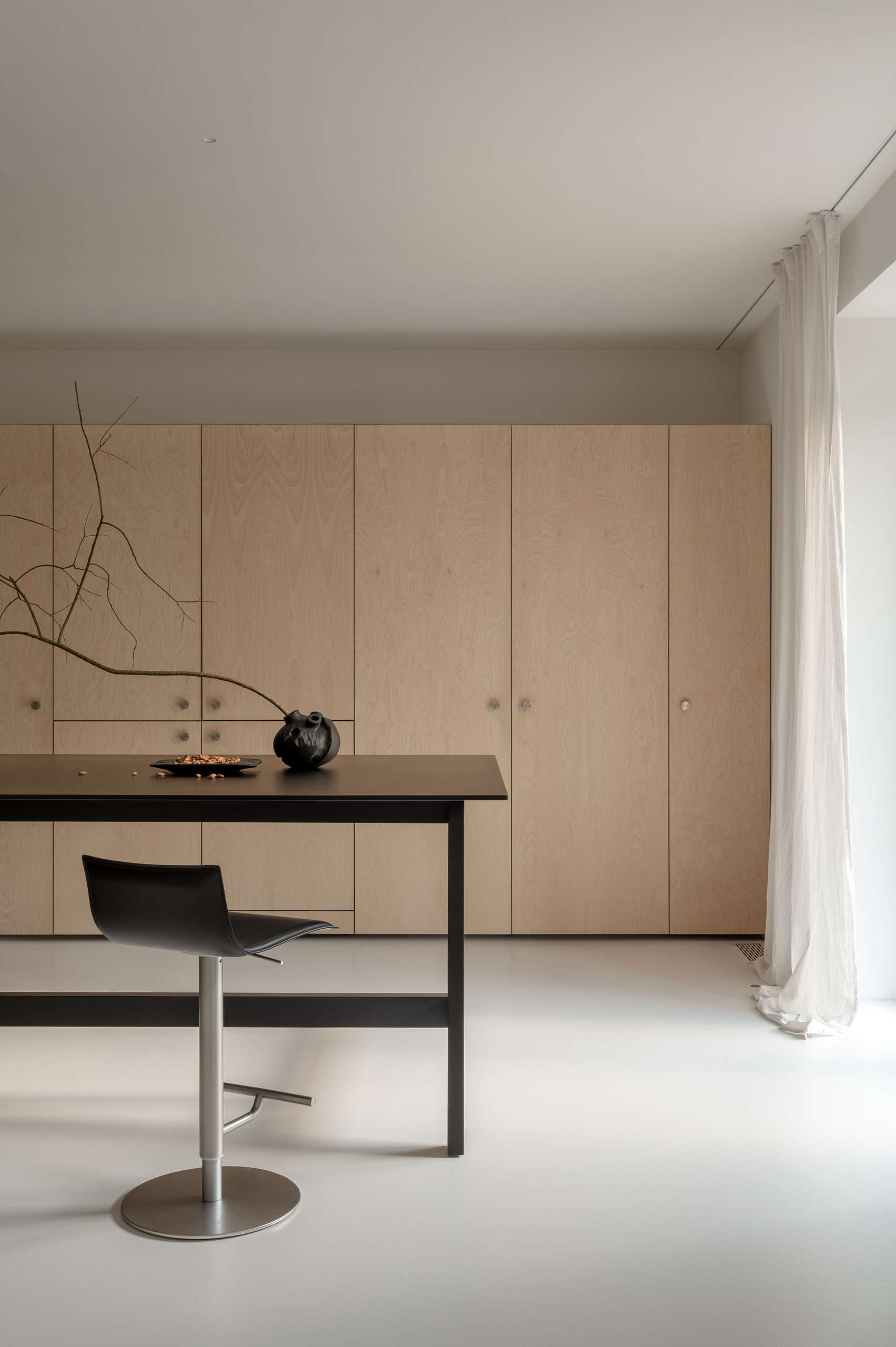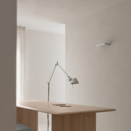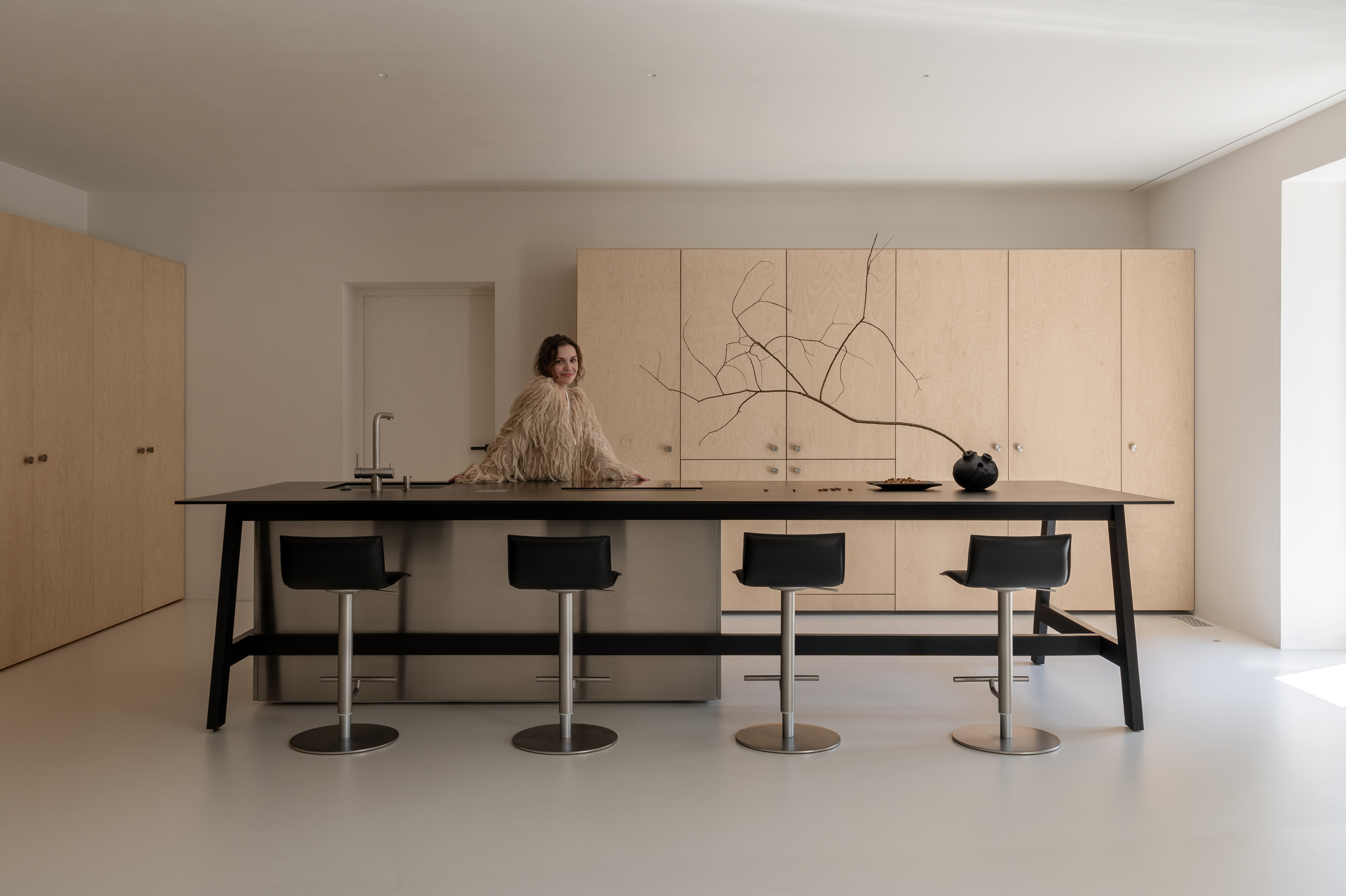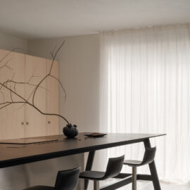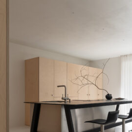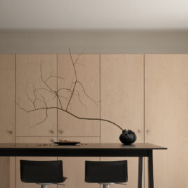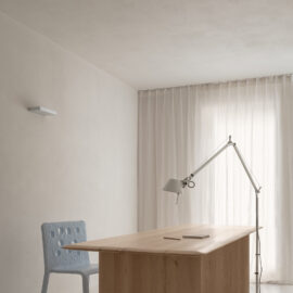 Основні матеріали проєкту – природні. Іграшка Puppi від Magis – чи не єдина річ із пластику в інтер’єрі. Та й загалом речей у просторі не багато, доречність та цінність кожного предмету ретельно зважена, щоб дотриматися мінімалістського способу життя. Стіни та стеля оздоблені натуральним вапняним штуком, підлога – фарбований бетон. Меблі виконані з березового шпону та нержавіючої сталі, а санвузли – з плитки травертину. Весь текстиль – з бавовни та льону.