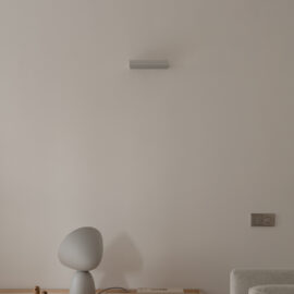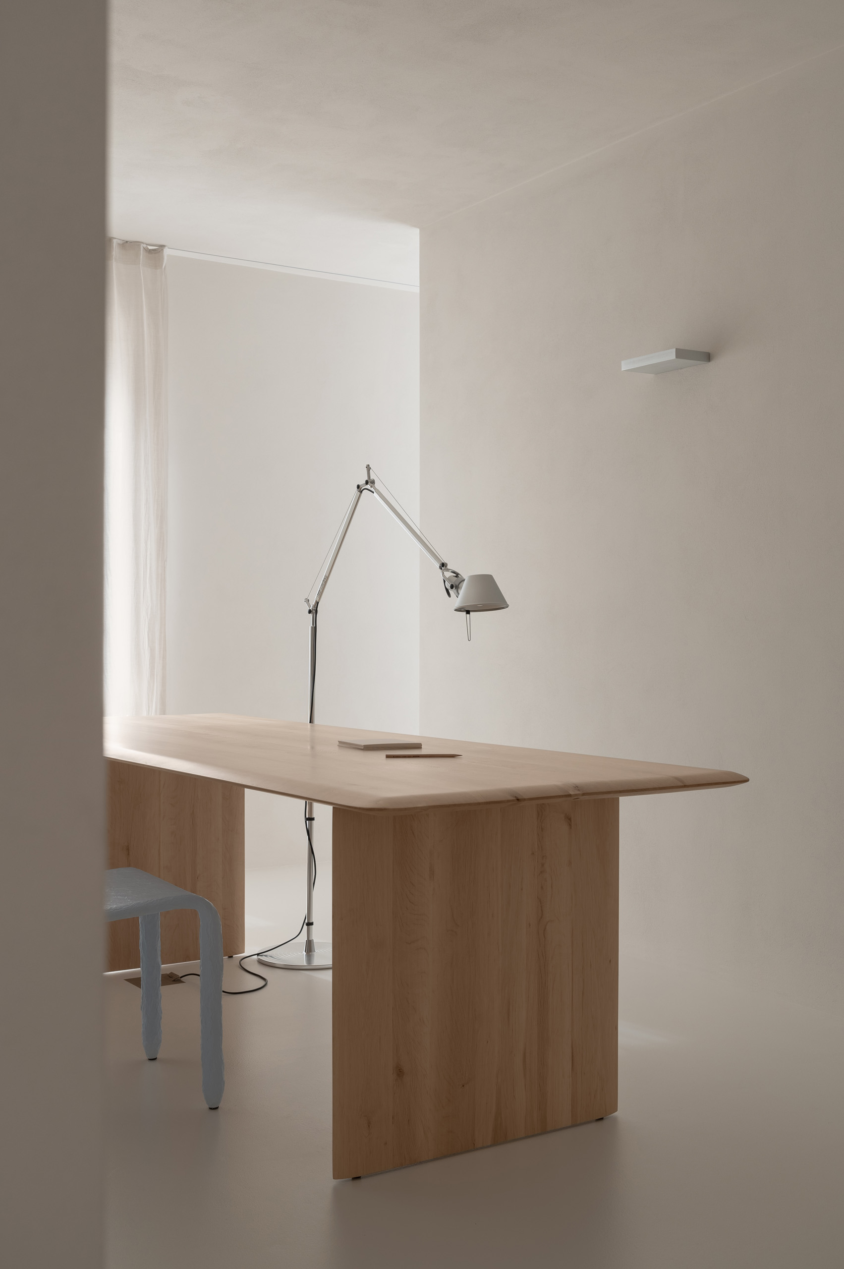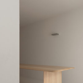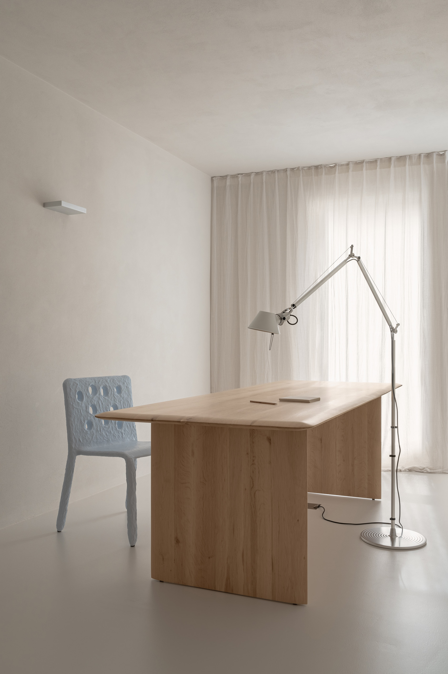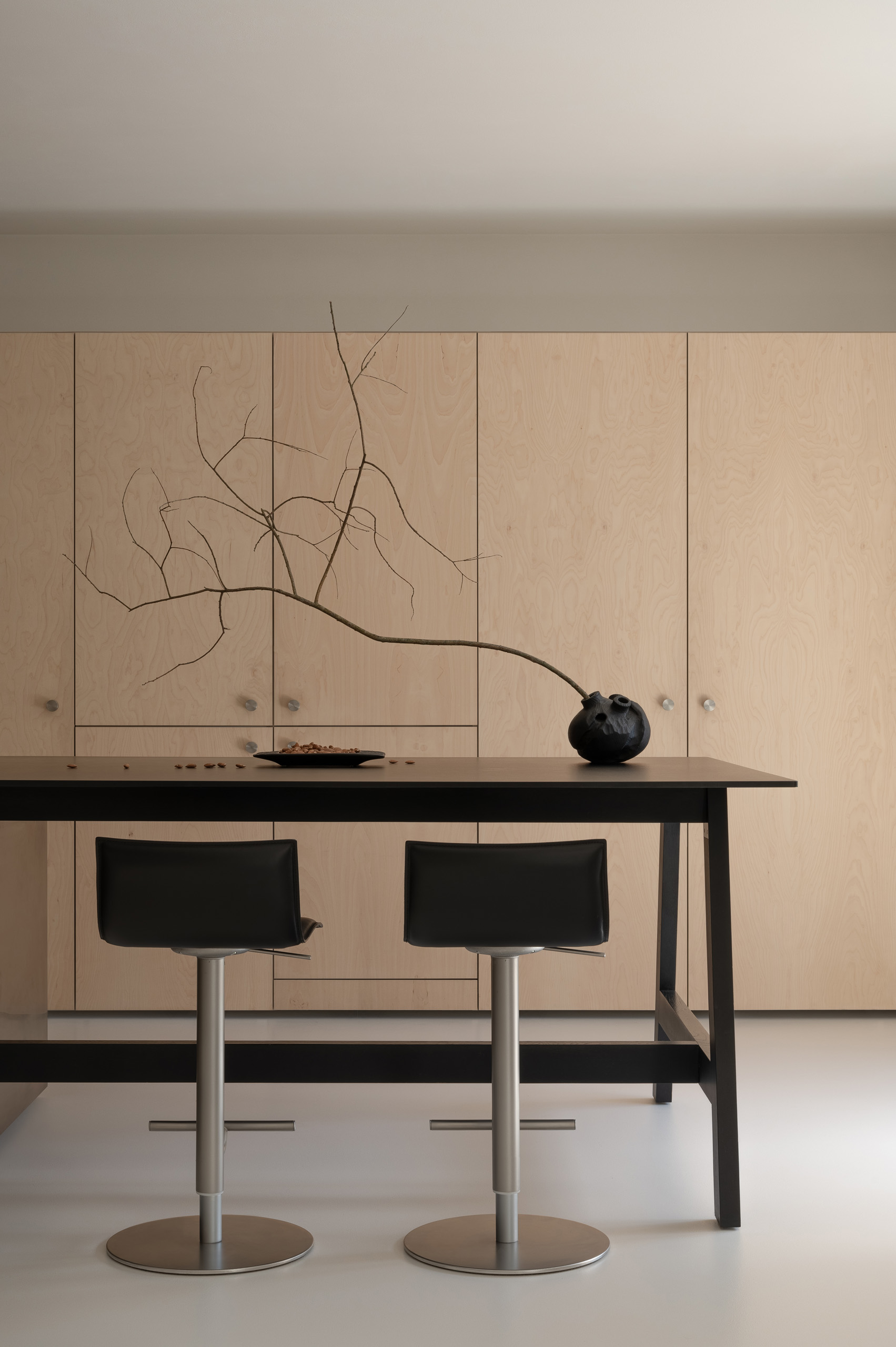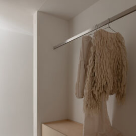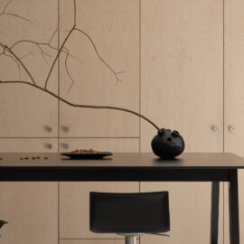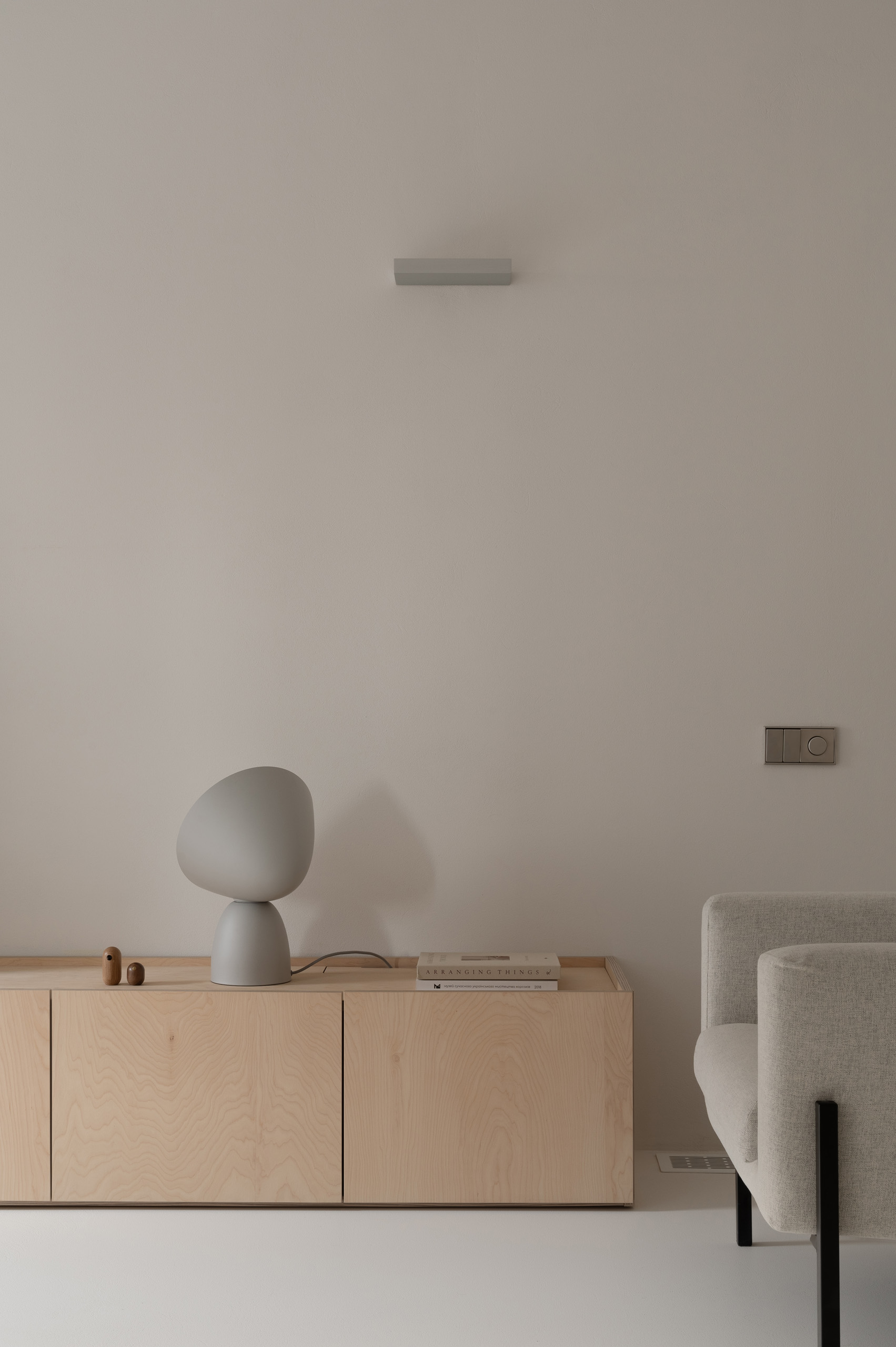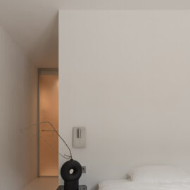 Основні матеріали проєкту – природні. Іграшка Puppi від Magis – чи не єдина річ із пластику в інтер’єрі. Та й загалом речей у просторі не багато, доречність та цінність кожного предмету ретельно зважена, щоб дотриматися мінімалістського способу життя. Стіни та стеля оздоблені натуральним вапняним штуком, підлога – фарбований бетон. Меблі виконані з березового шпону та нержавіючої сталі, а санвузли – з плитки травертину. Весь текстиль – з бавовни та льону.