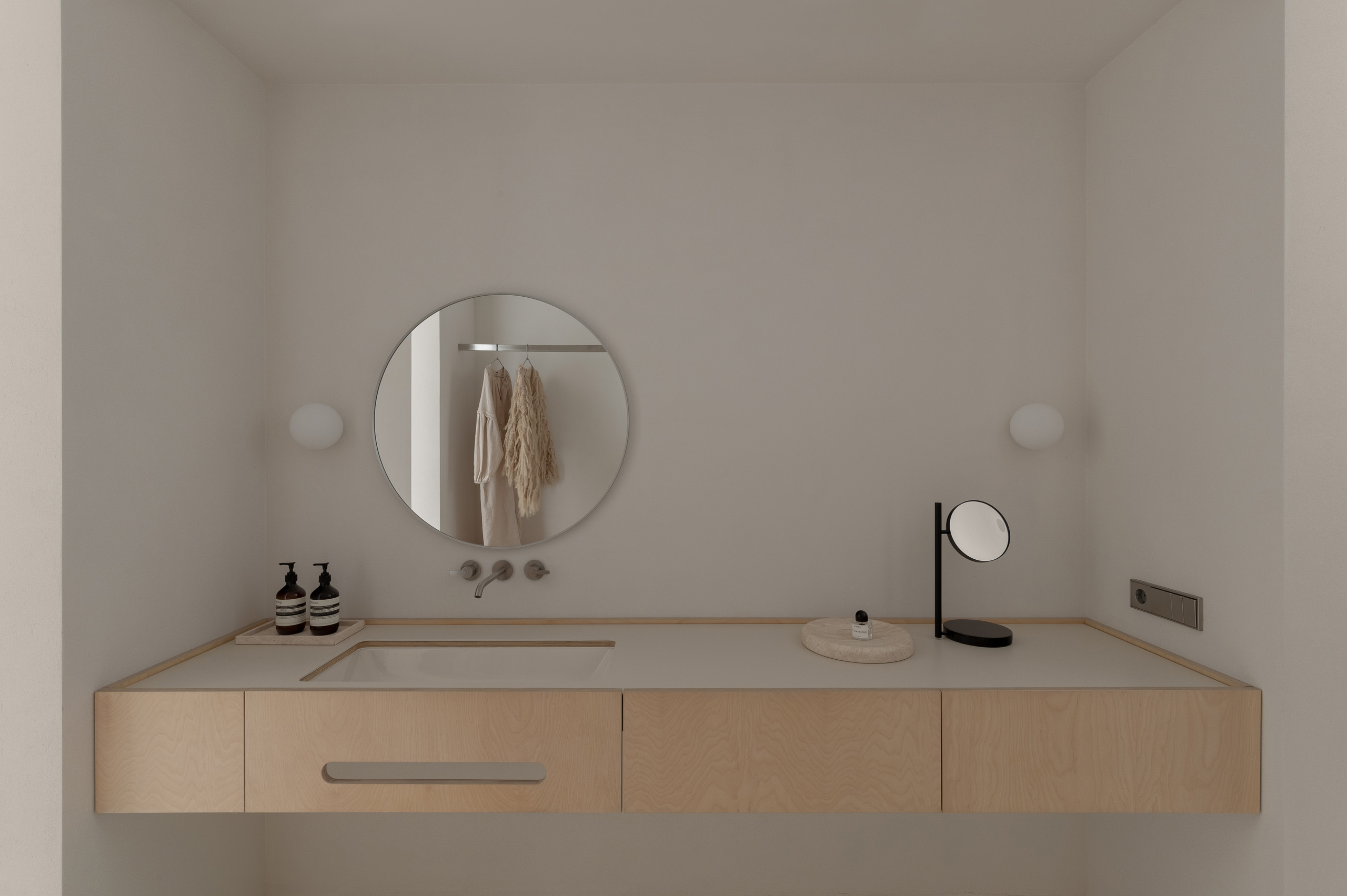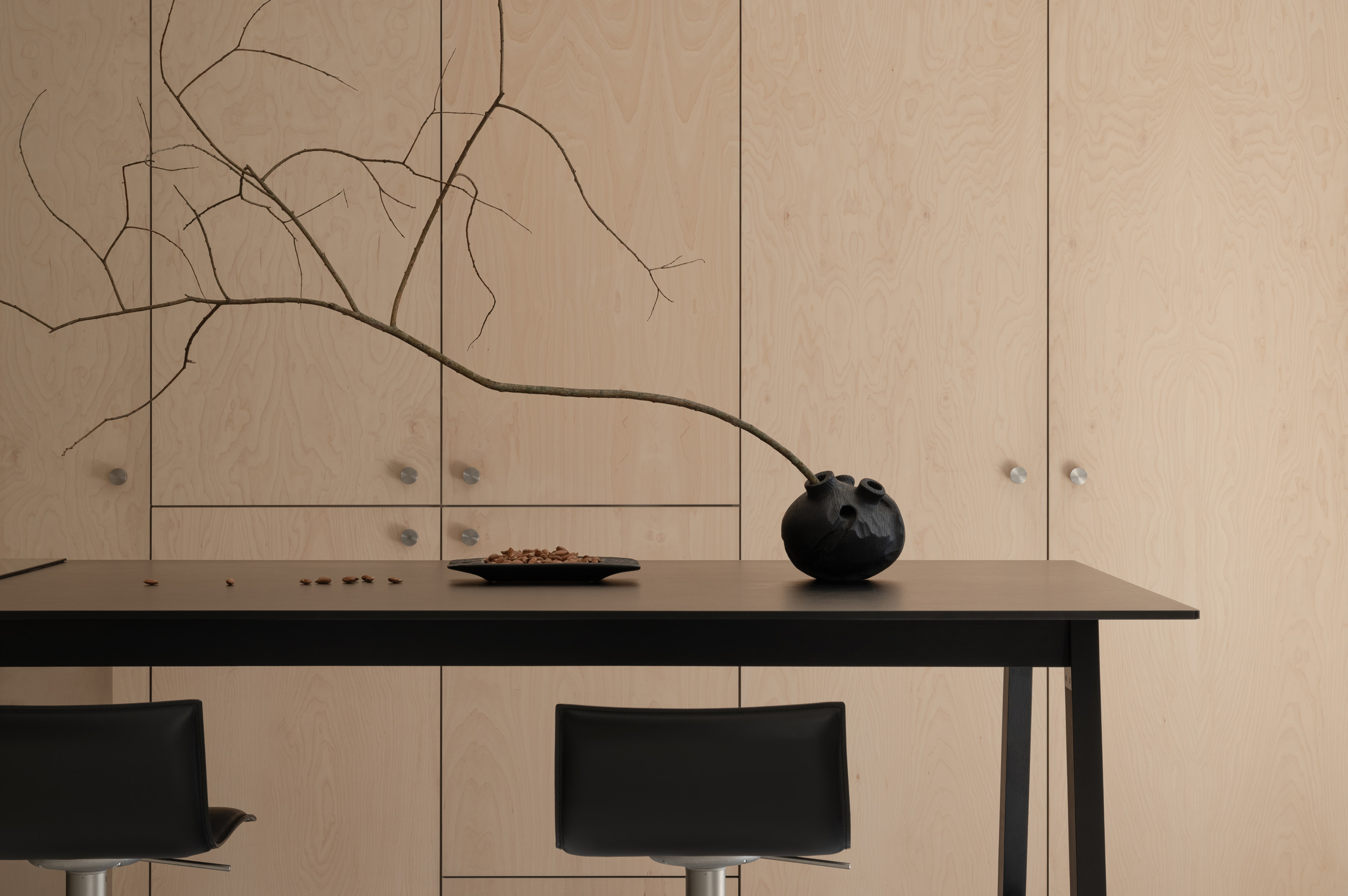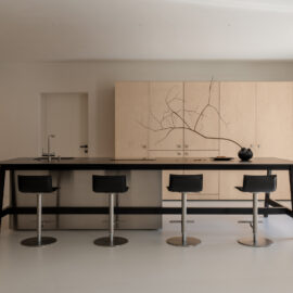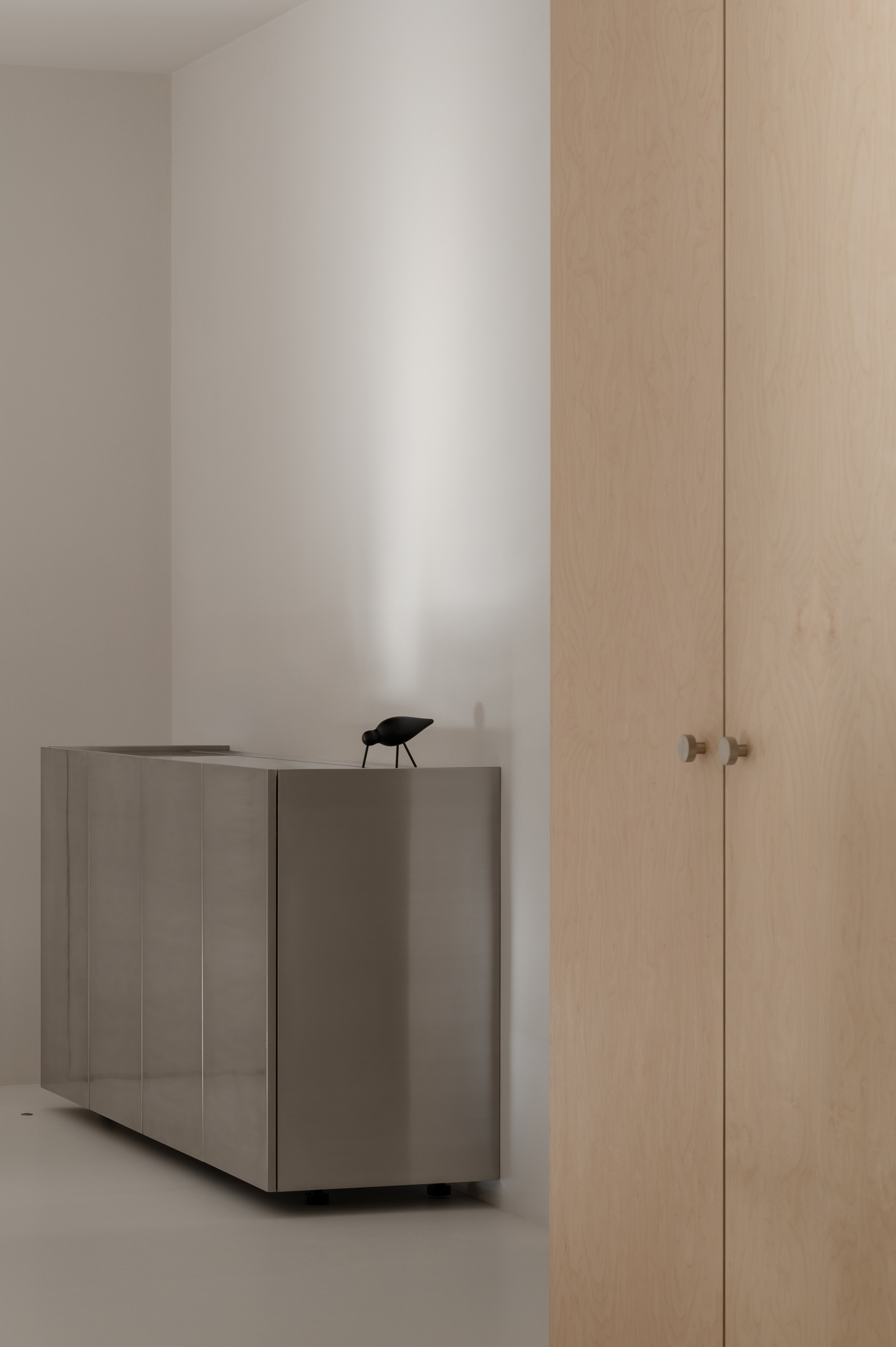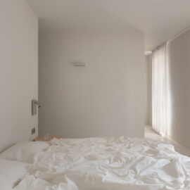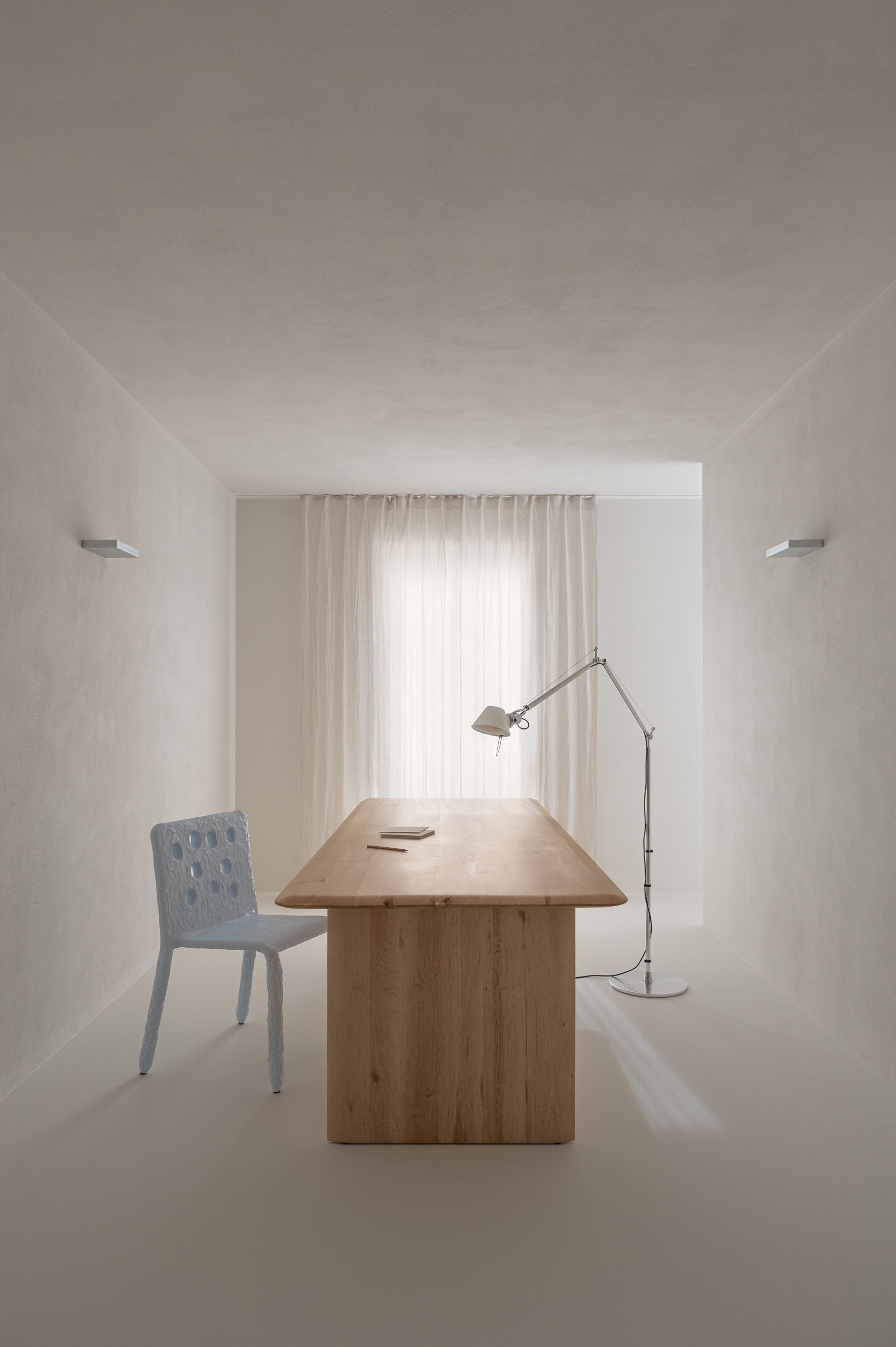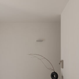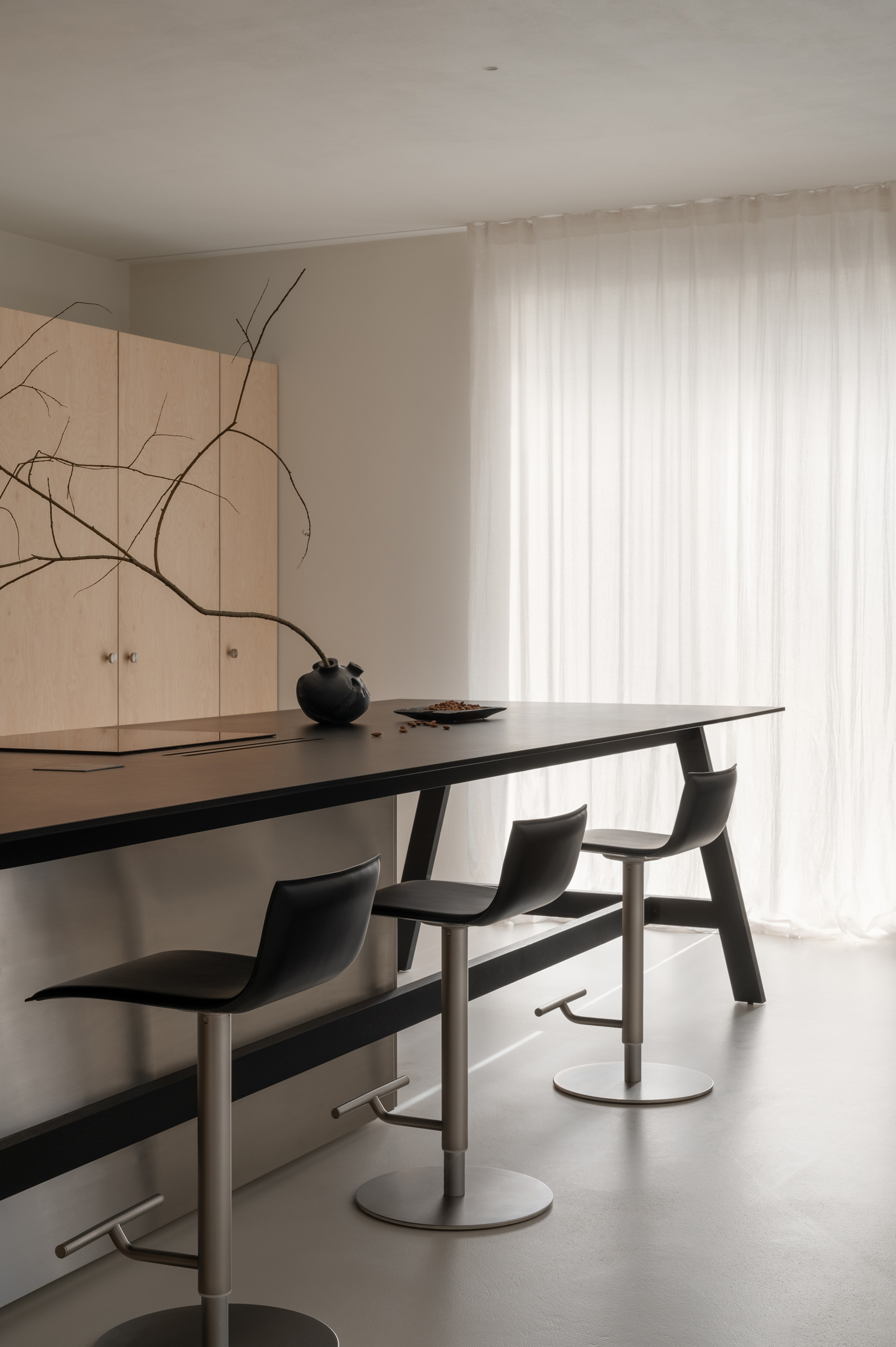 Основні матеріали проєкту – природні. Іграшка Puppi від Magis – чи не єдина річ із пластику в інтер’єрі. Та й загалом речей у просторі не багато, доречність та цінність кожного предмету ретельно зважена, щоб дотриматися мінімалістського способу життя. Стіни та стеля оздоблені натуральним вапняним штуком, підлога – фарбований бетон. Меблі виконані з березового шпону та нержавіючої сталі, а санвузли – з плитки травертину. Весь текстиль – з бавовни та льону.