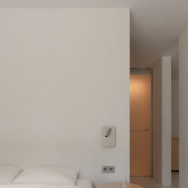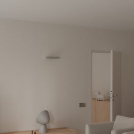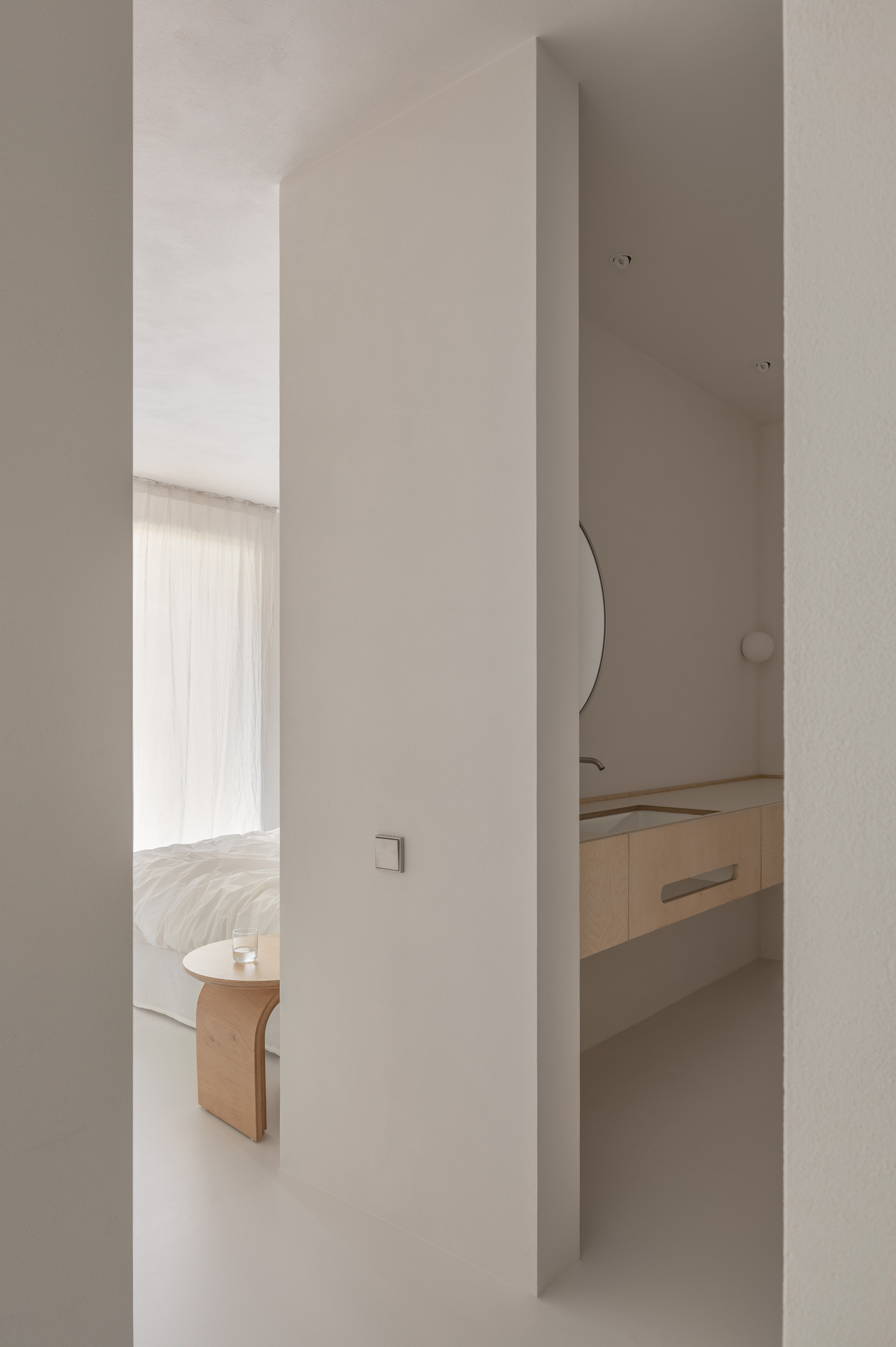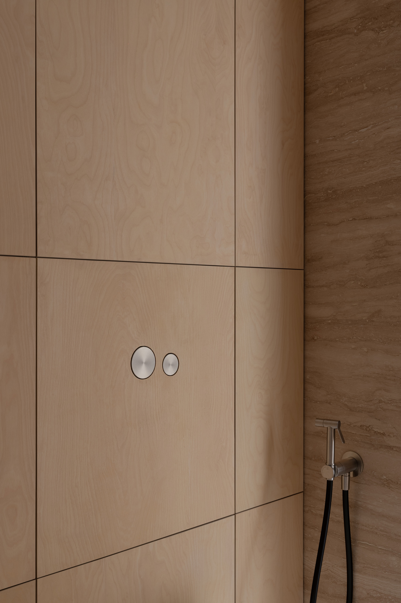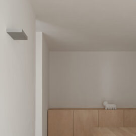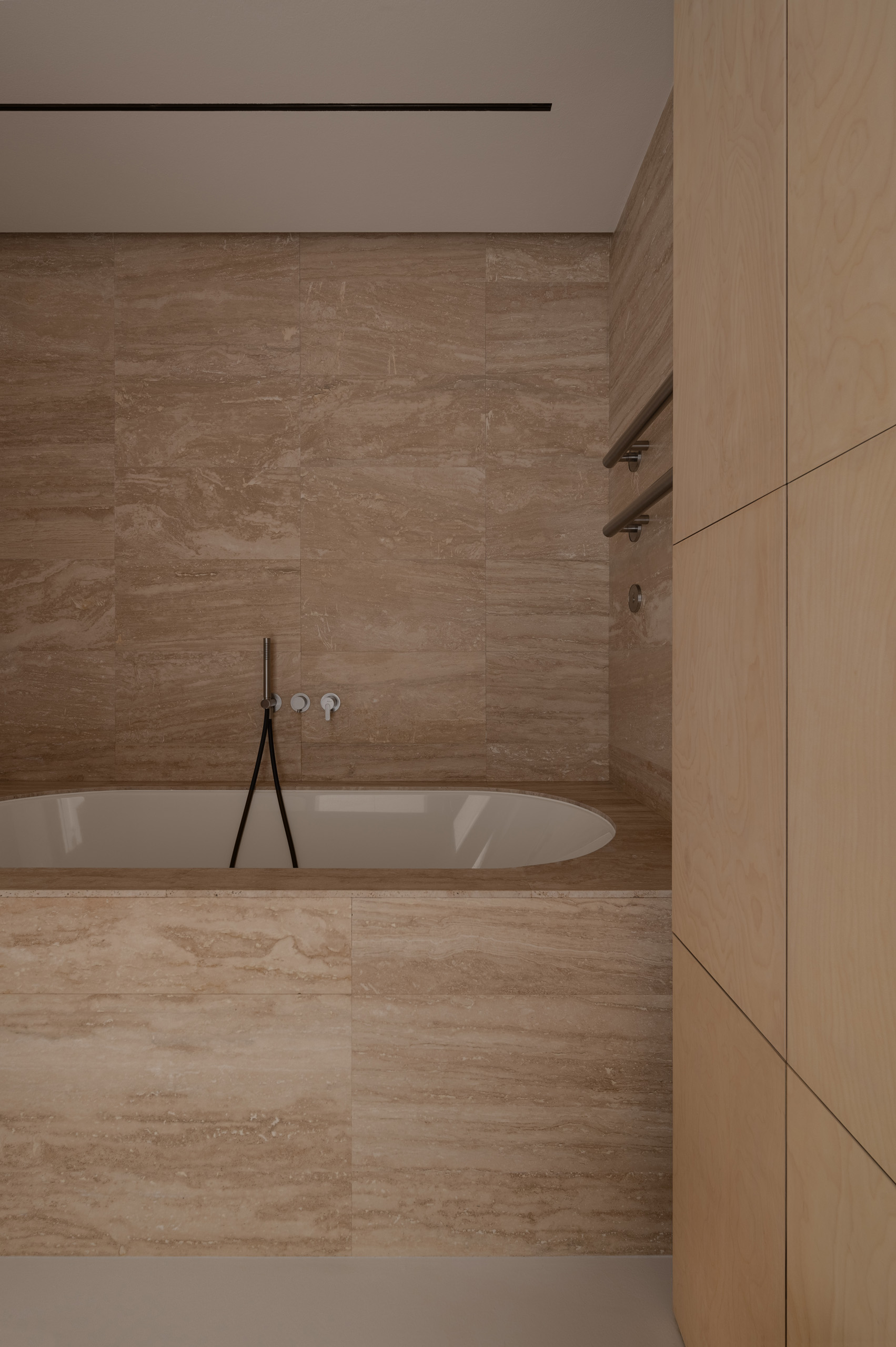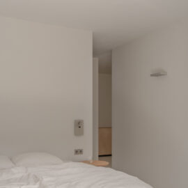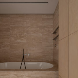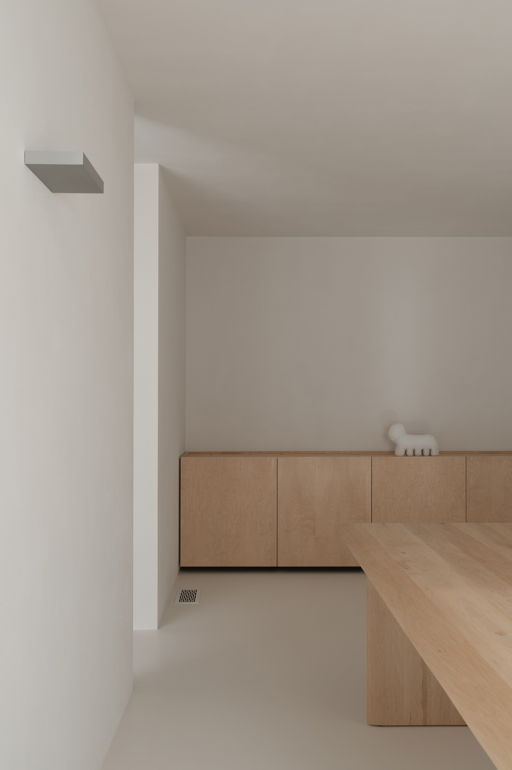 Основні матеріали проєкту – природні. Іграшка Puppi від Magis – чи не єдина річ із пластику в інтер’єрі. Та й загалом речей у просторі не багато, доречність та цінність кожного предмету ретельно зважена, щоб дотриматися мінімалістського способу життя. Стіни та стеля оздоблені натуральним вапняним штуком, підлога – фарбований бетон. Меблі виконані з березового шпону та нержавіючої сталі, а санвузли – з плитки травертину. Весь текстиль – з бавовни та льону.