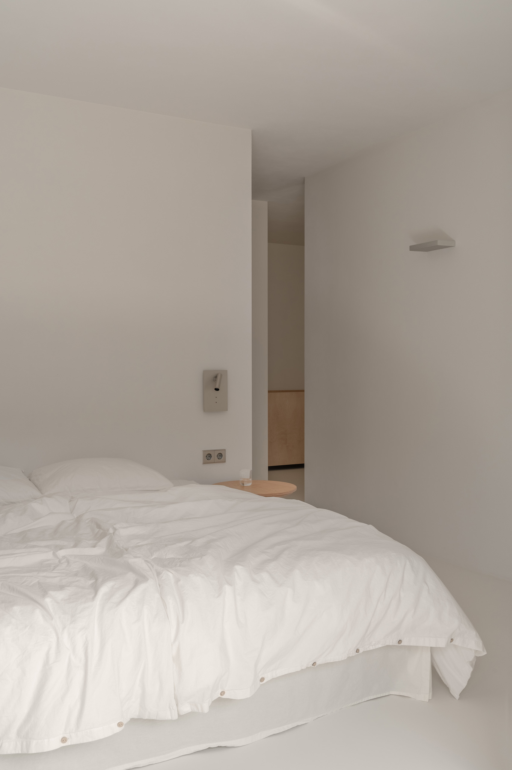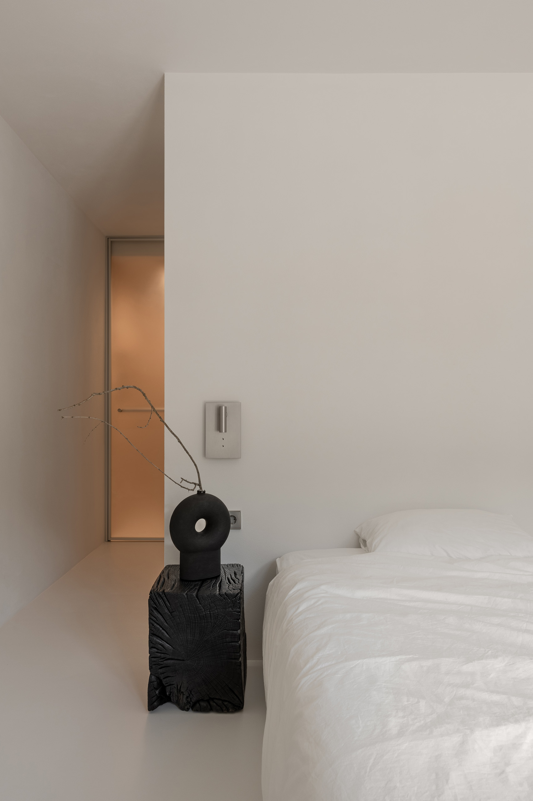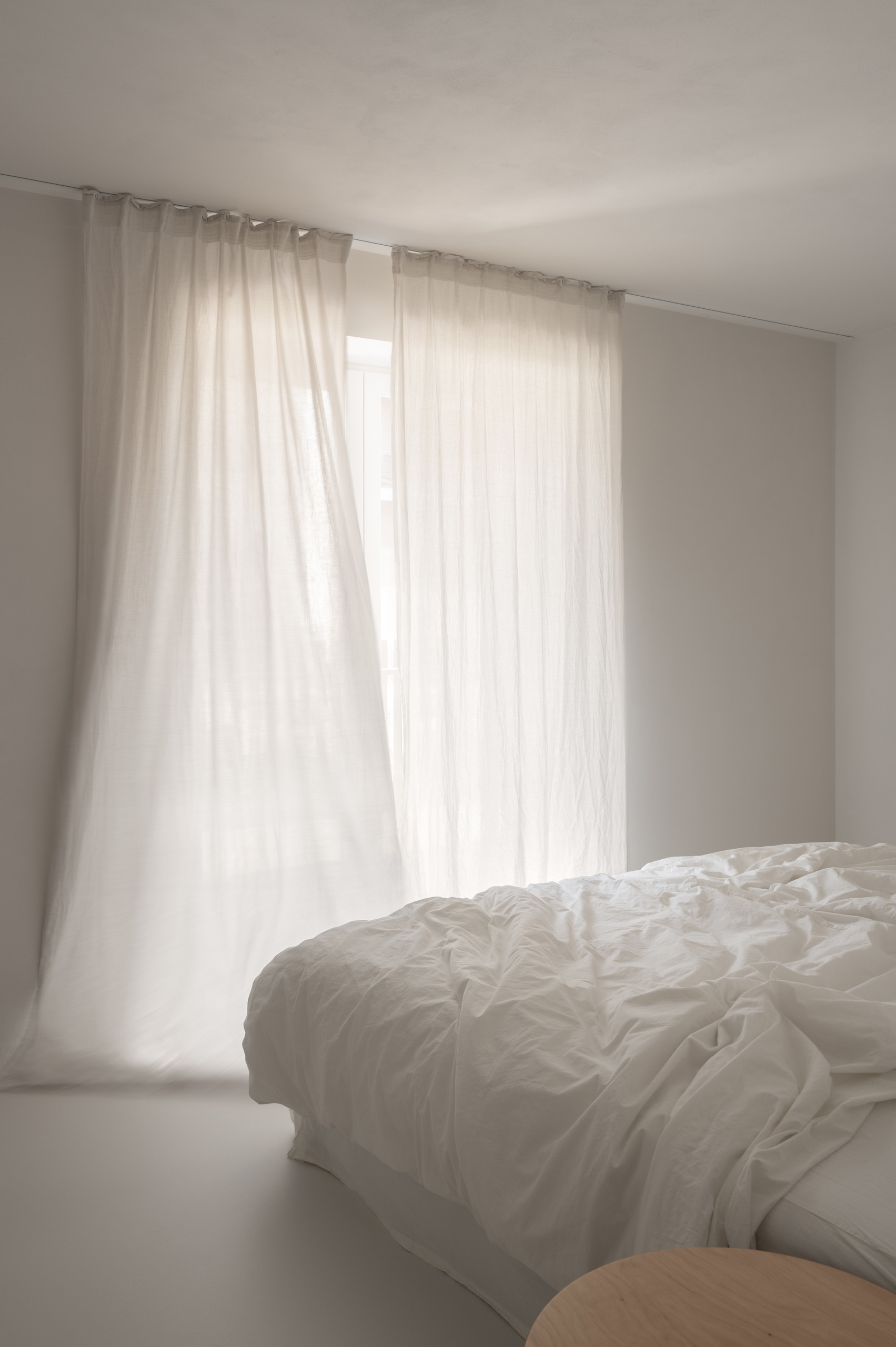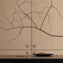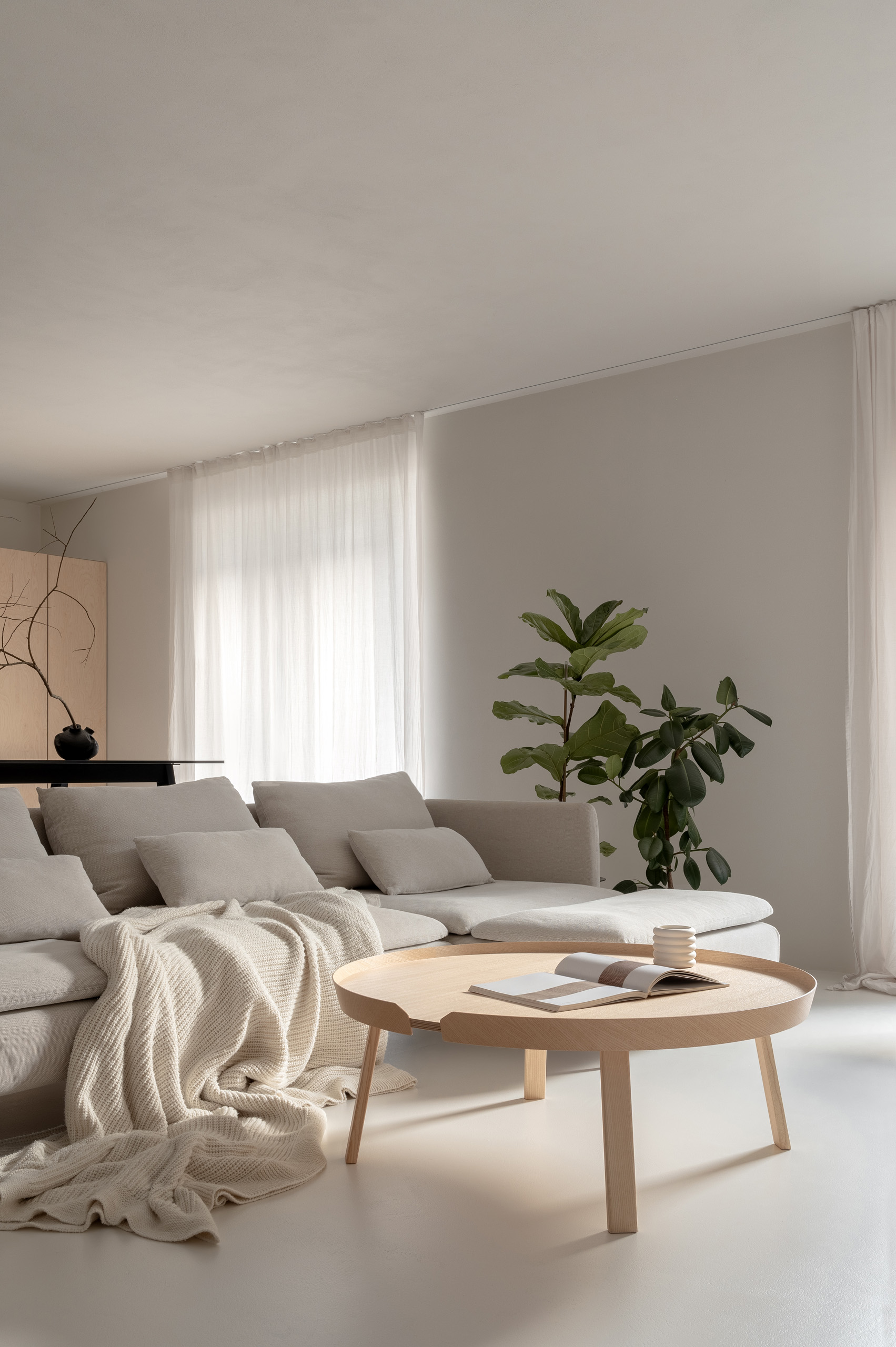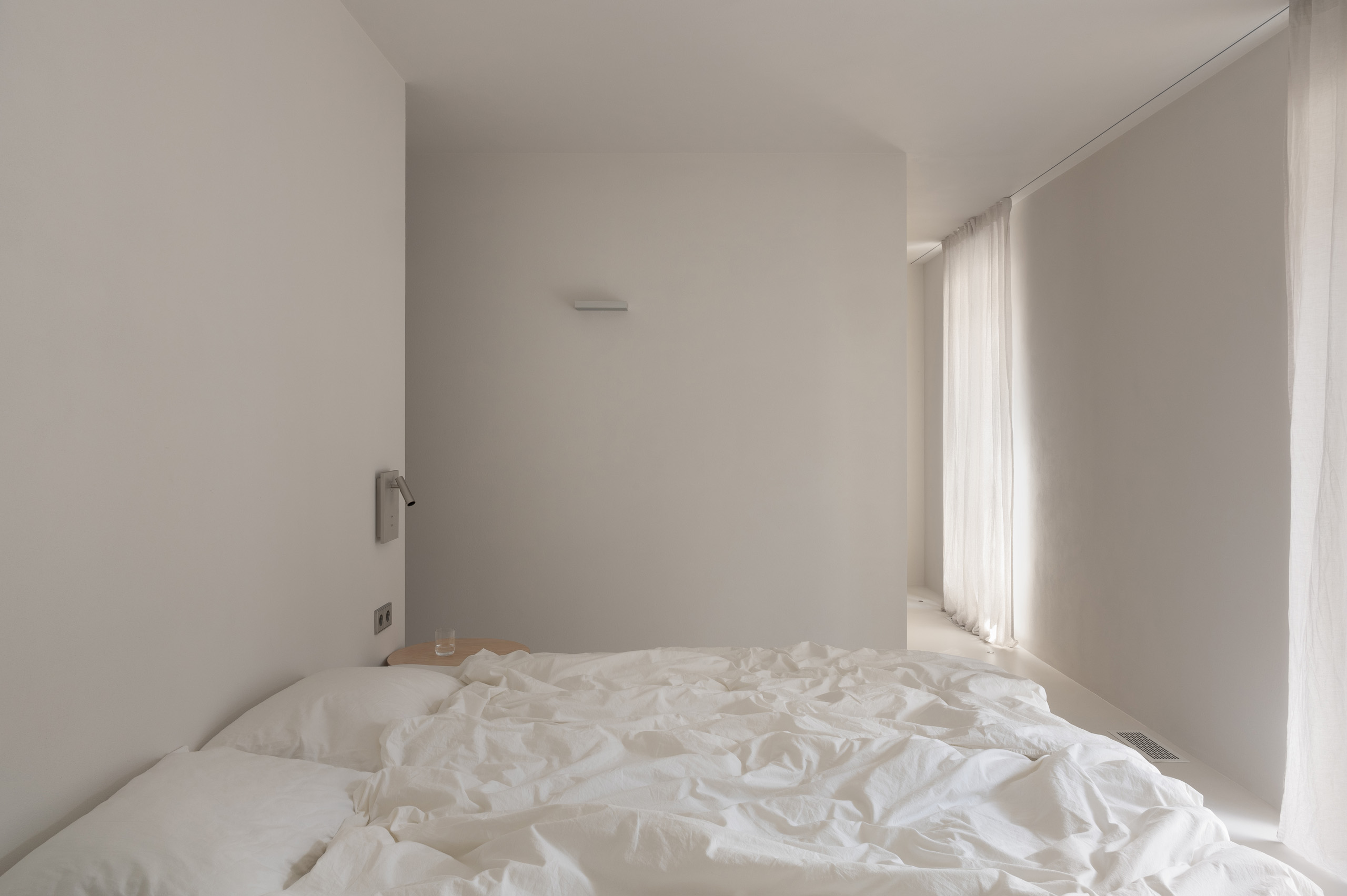 Основні матеріали проєкту – природні. Іграшка Puppi від Magis – чи не єдина річ із пластику в інтер’єрі. Та й загалом речей у просторі не багато, доречність та цінність кожного предмету ретельно зважена, щоб дотриматися мінімалістського способу життя. Стіни та стеля оздоблені натуральним вапняним штуком, підлога – фарбований бетон. Меблі виконані з березового шпону та нержавіючої сталі, а санвузли – з плитки травертину. Весь текстиль – з бавовни та льону.