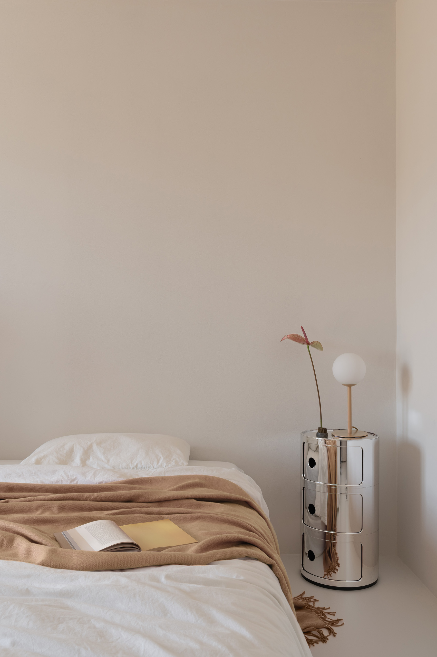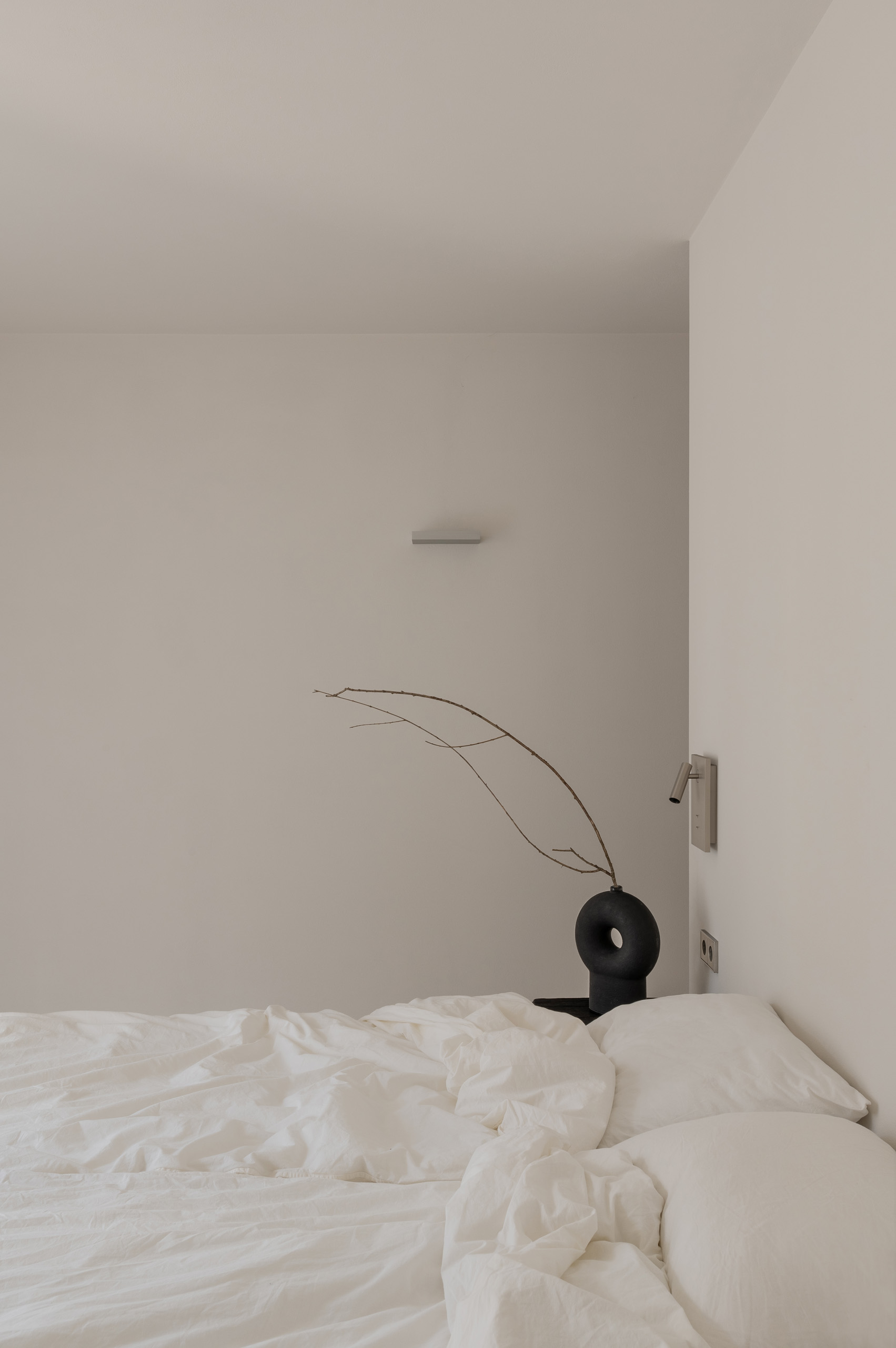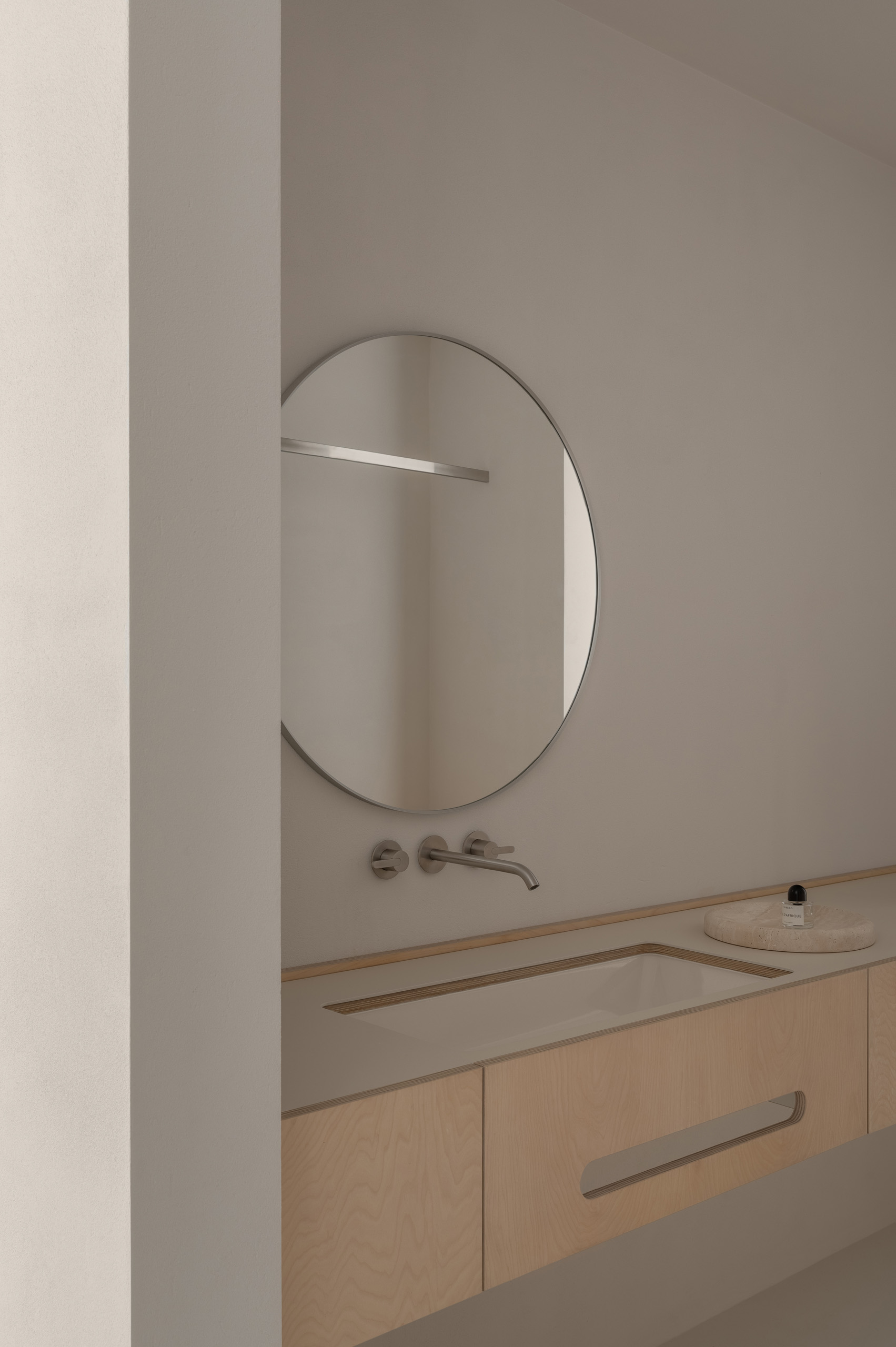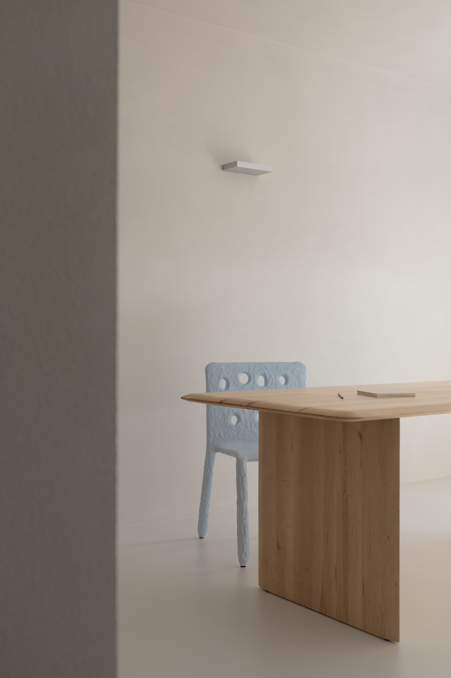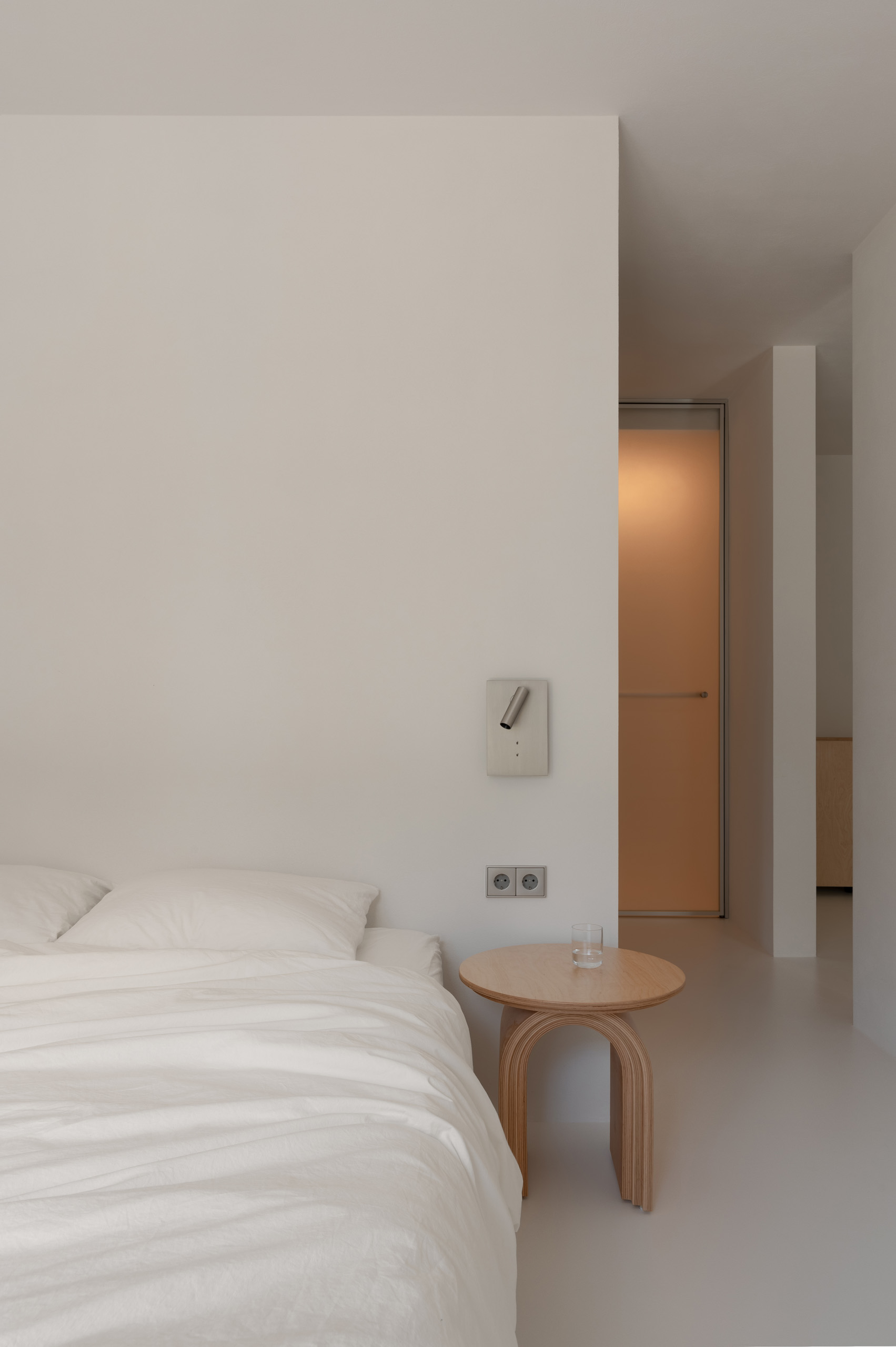 Основні матеріали проєкту – природні. Іграшка Puppi від Magis – чи не єдина річ із пластику в інтер’єрі. Та й загалом речей у просторі не багато, доречність та цінність кожного предмету ретельно зважена, щоб дотриматися мінімалістського способу життя. Стіни та стеля оздоблені натуральним вапняним штуком, підлога – фарбований бетон. Меблі виконані з березового шпону та нержавіючої сталі, а санвузли – з плитки травертину. Весь текстиль – з бавовни та льону.