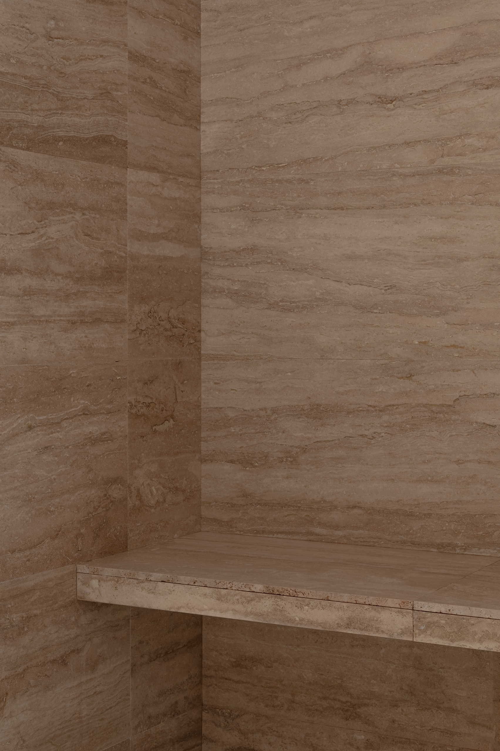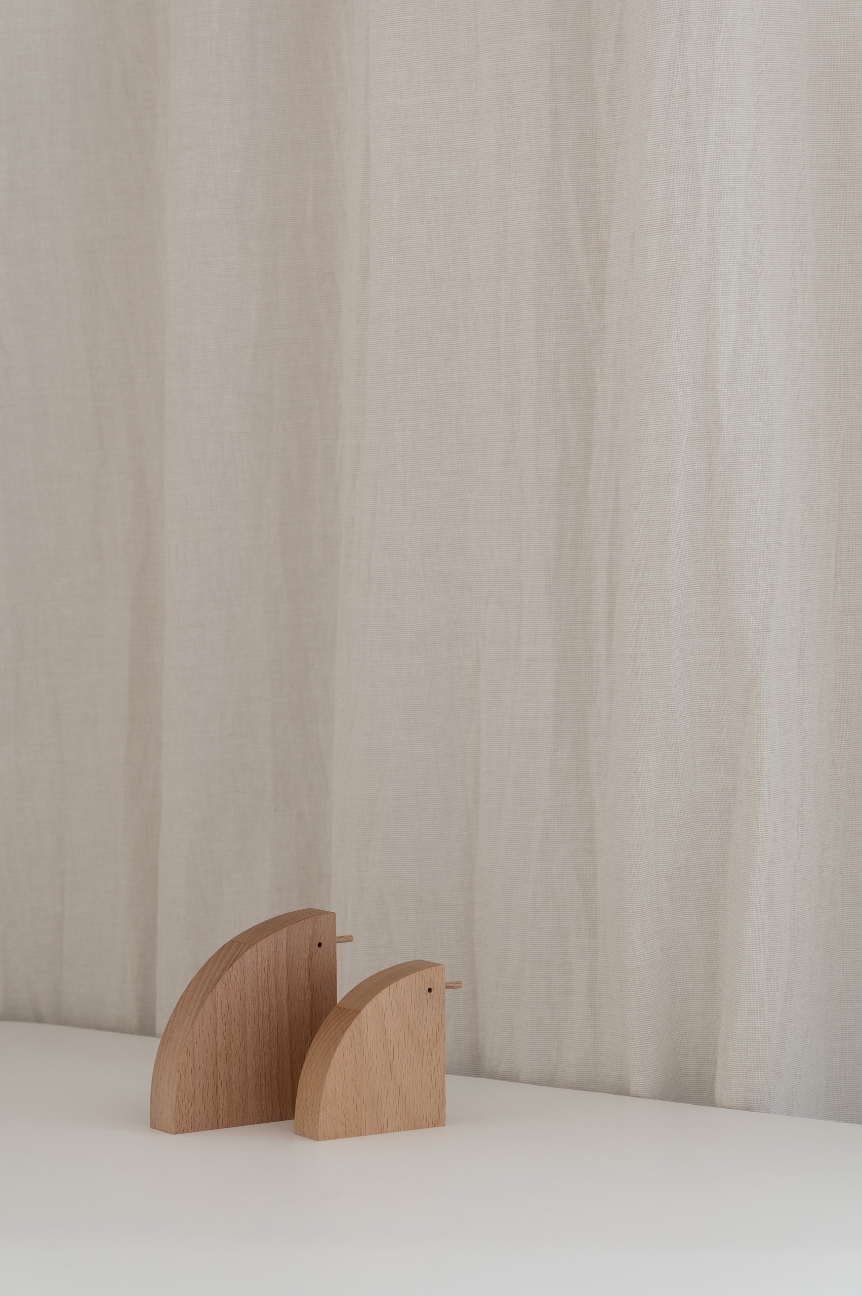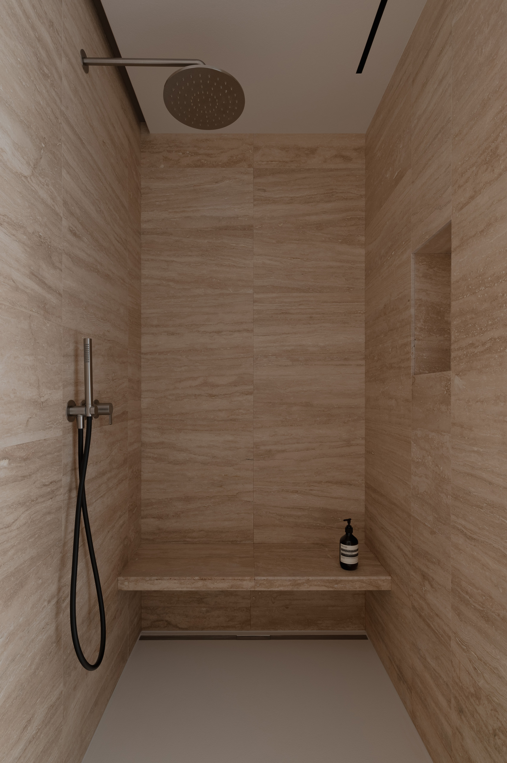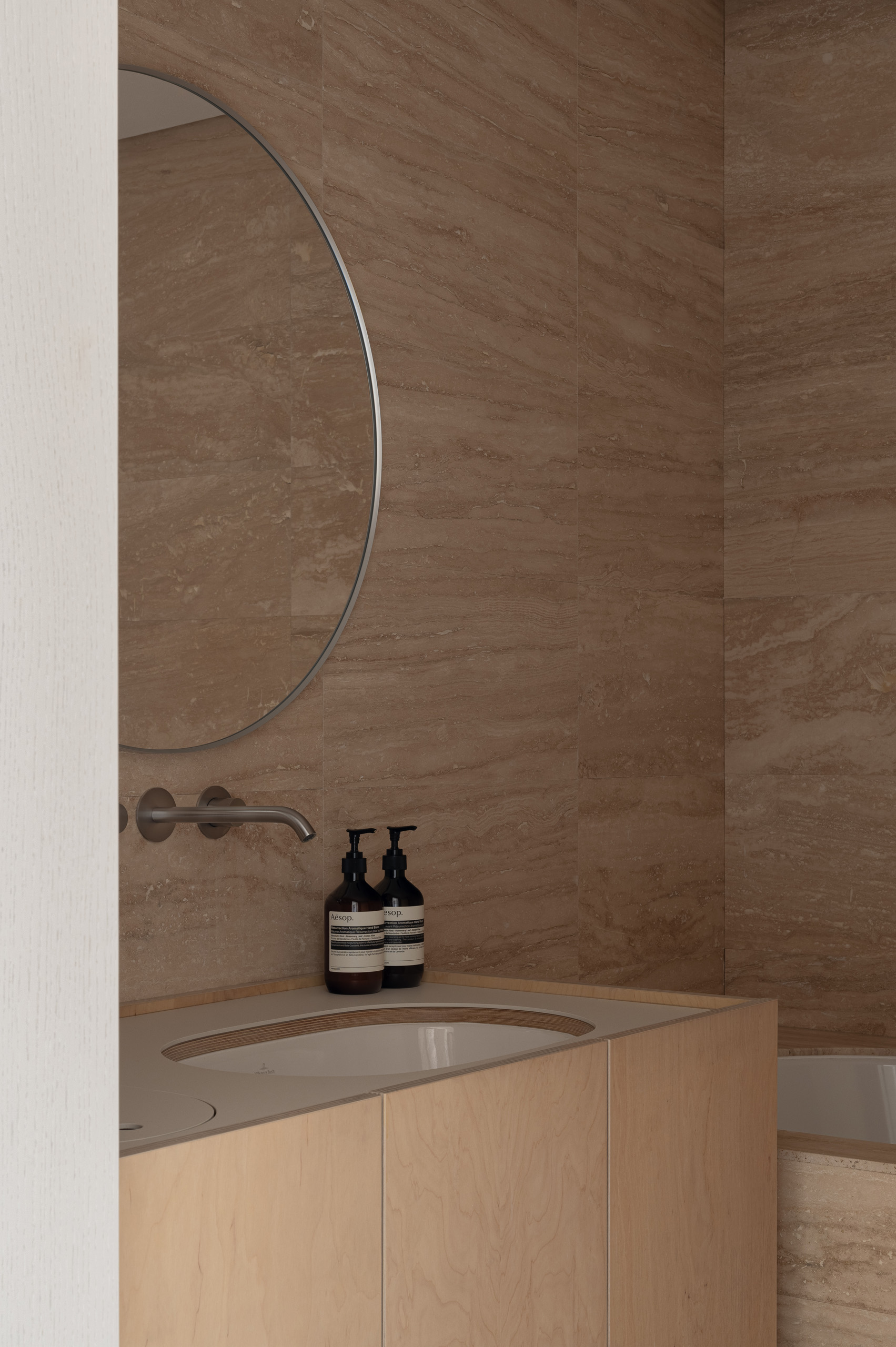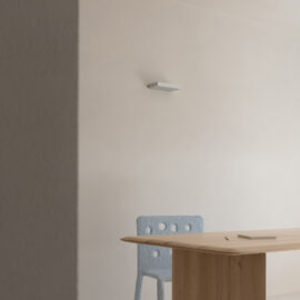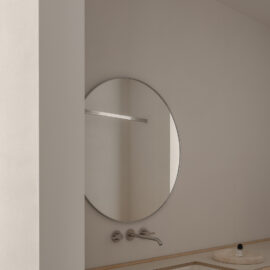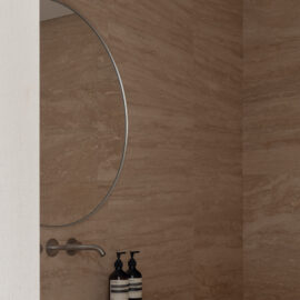 Основні матеріали проєкту – природні. Іграшка Puppi від Magis – чи не єдина річ із пластику в інтер’єрі. Та й загалом речей у просторі не багато, доречність та цінність кожного предмету ретельно зважена, щоб дотриматися мінімалістського способу життя. Стіни та стеля оздоблені натуральним вапняним штуком, підлога – фарбований бетон. Меблі виконані з березового шпону та нержавіючої сталі, а санвузли – з плитки травертину. Весь текстиль – з бавовни та льону.