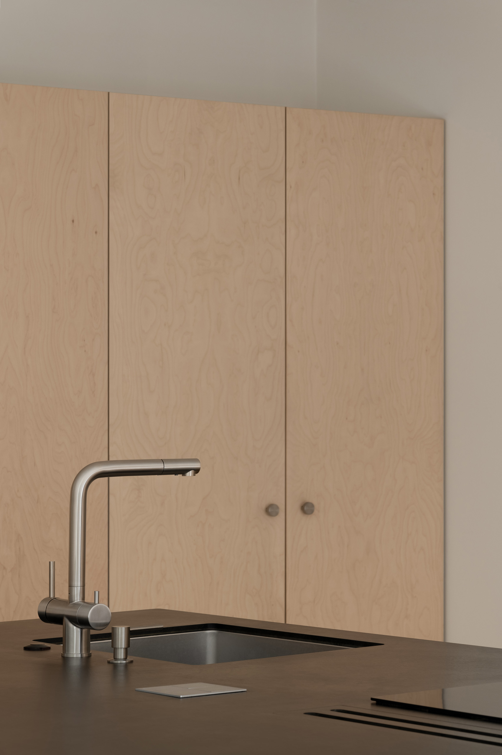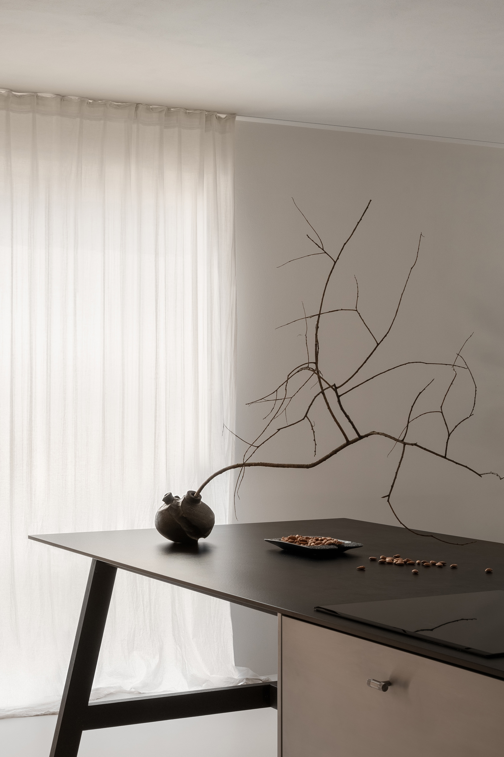 Метою дизайнерки було створити простір без візуального а також звукового шуму. Цю задачу довелося вирішувати за допомогою технічних рішень. Одним з них стала вбудована у кухонну стільницю безшумна витяжка. Двигун її вентилятора винесений в шафу за кухонним островом. Двигун обладнано шумоглушником та під‘єднано до індивідуального вентиляційного каналу. Біля