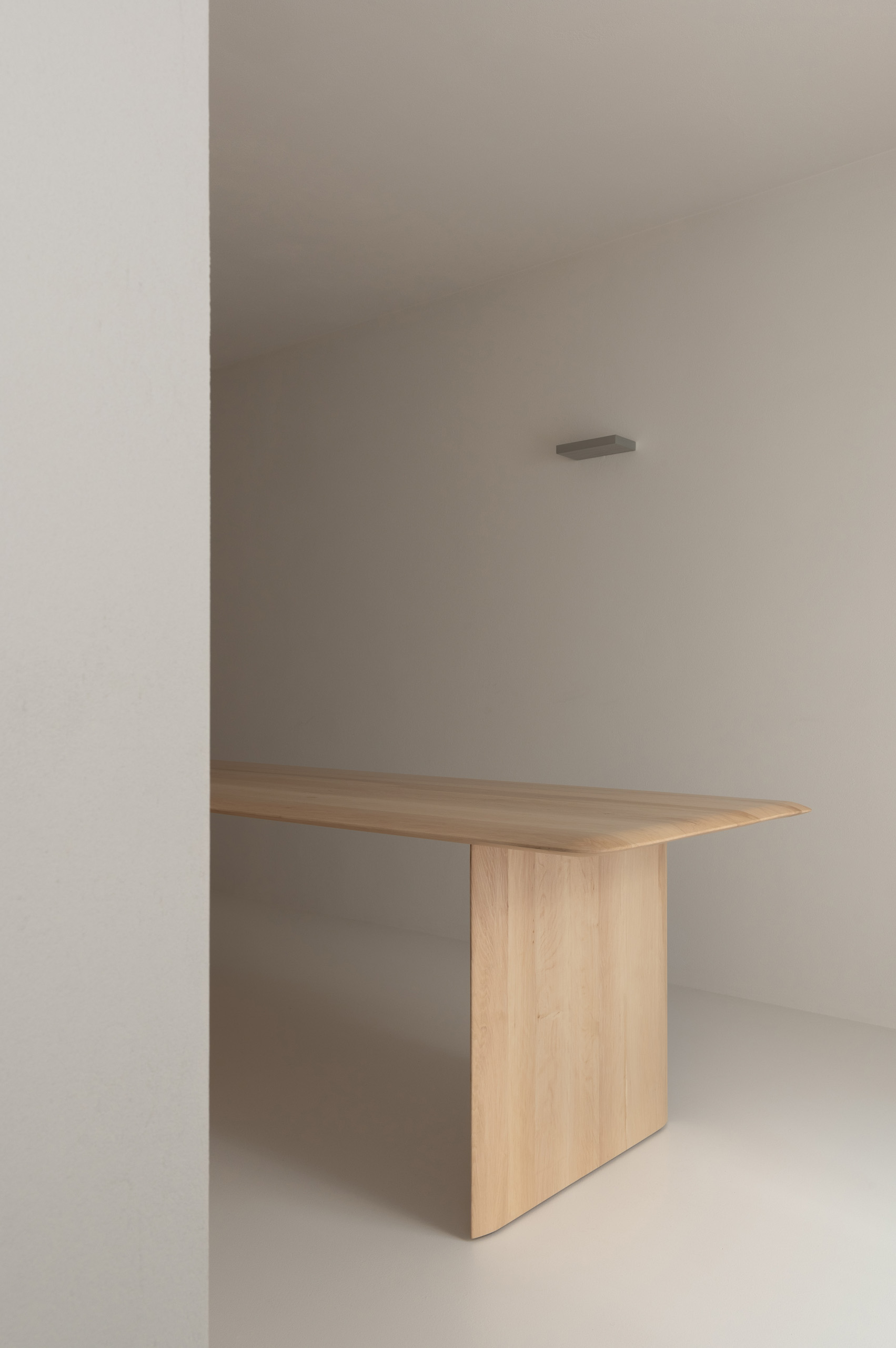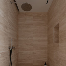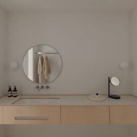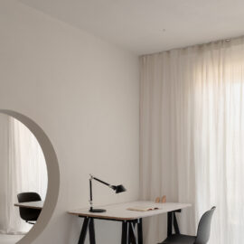 Стіл у кабінеті створений українськими майстрами з місцевого граба. «Улюбленим місцем у проєкті є душова з вбудованим стільчиком. Загалом дім став місцем, куди повертаєшся та видихаєш. Мінімалістичний кабінет сприяє творчій роботі. Я відмовилася від комп’ютера, і користуюся лише лаптопом, коли закриваю його стіл залишається чистий. Моя свідомість також», – ділиться дизайнерка.