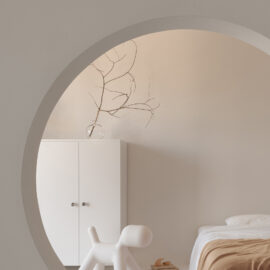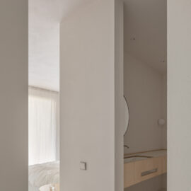 У плануванні квартири застосували галерейний метод, що дозволяє обійти перегородки, створюючи відчуття лабіринту. Це допомогло об‘єднати головну спальню, санвузол, відкритий гардероб та домашній офіс у єдиний простір, а також дало відчуття більшої свободи, коли приміщення перетікають одне в інше.