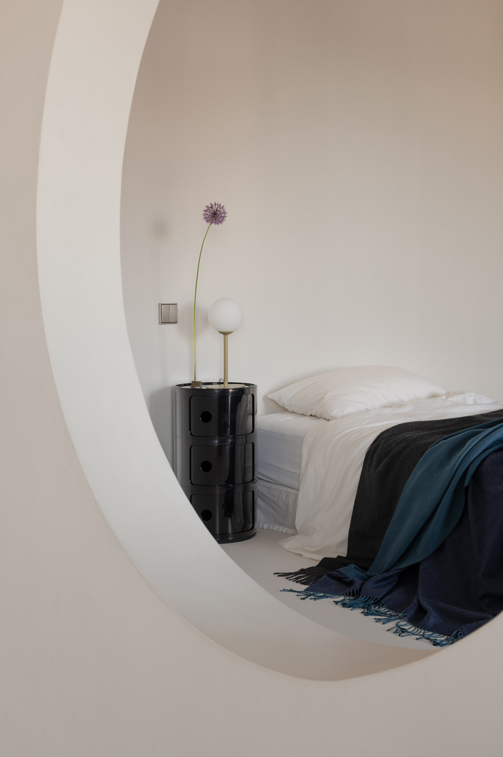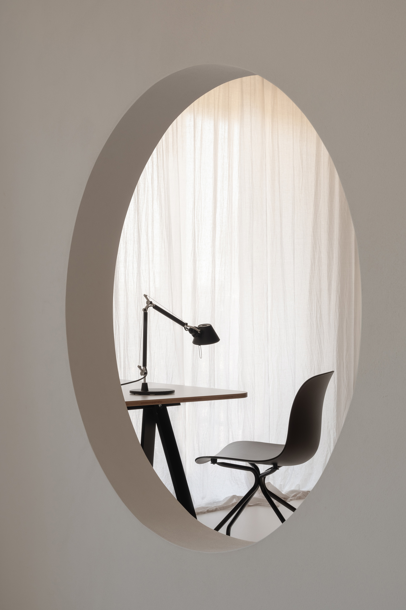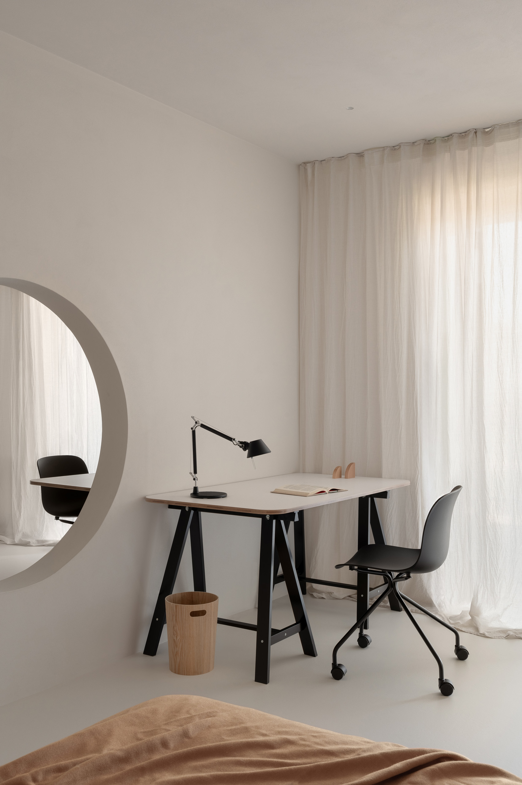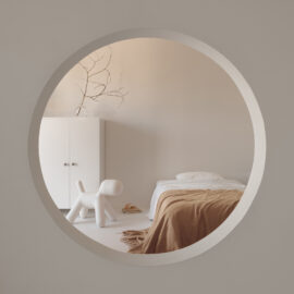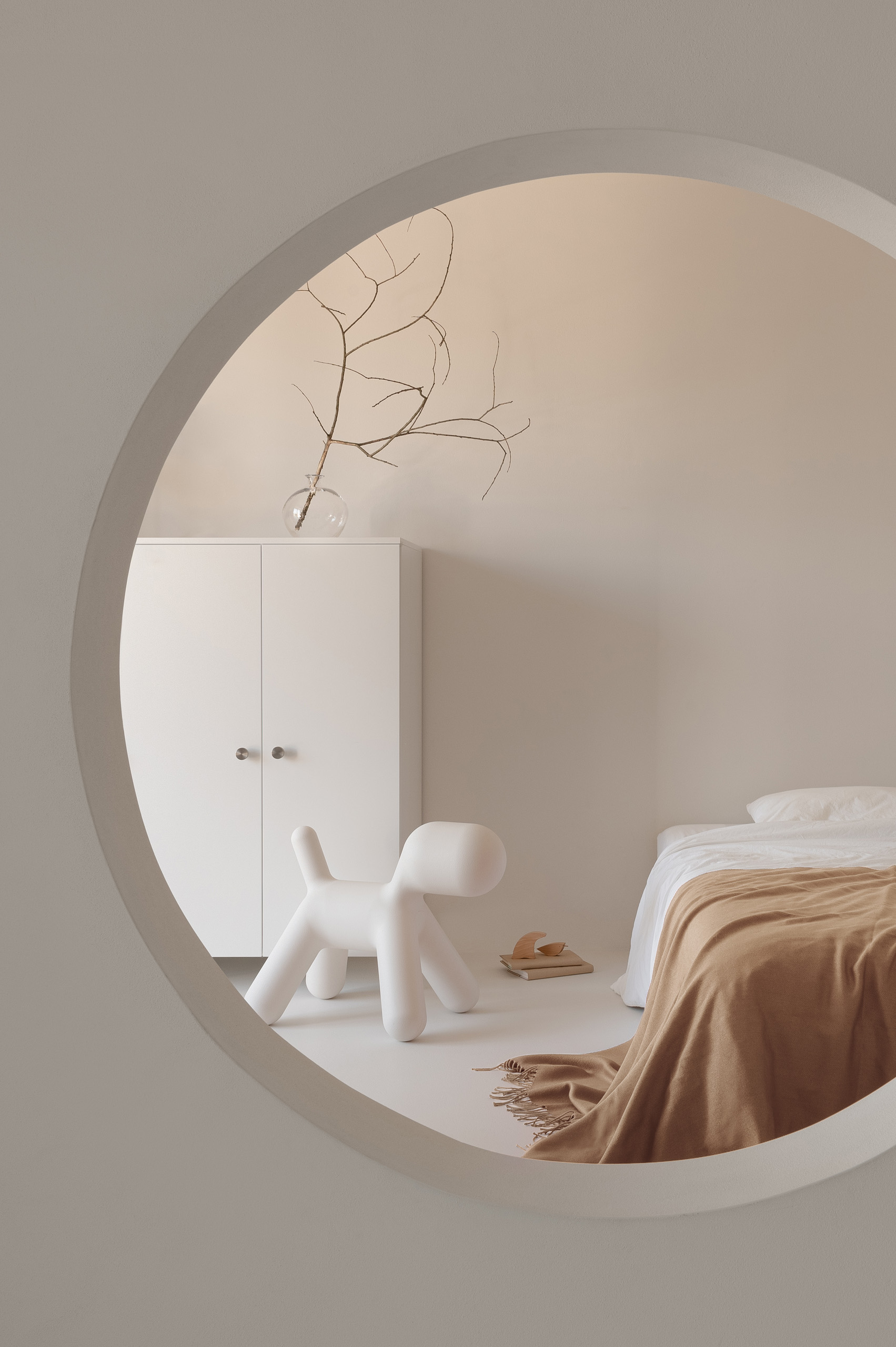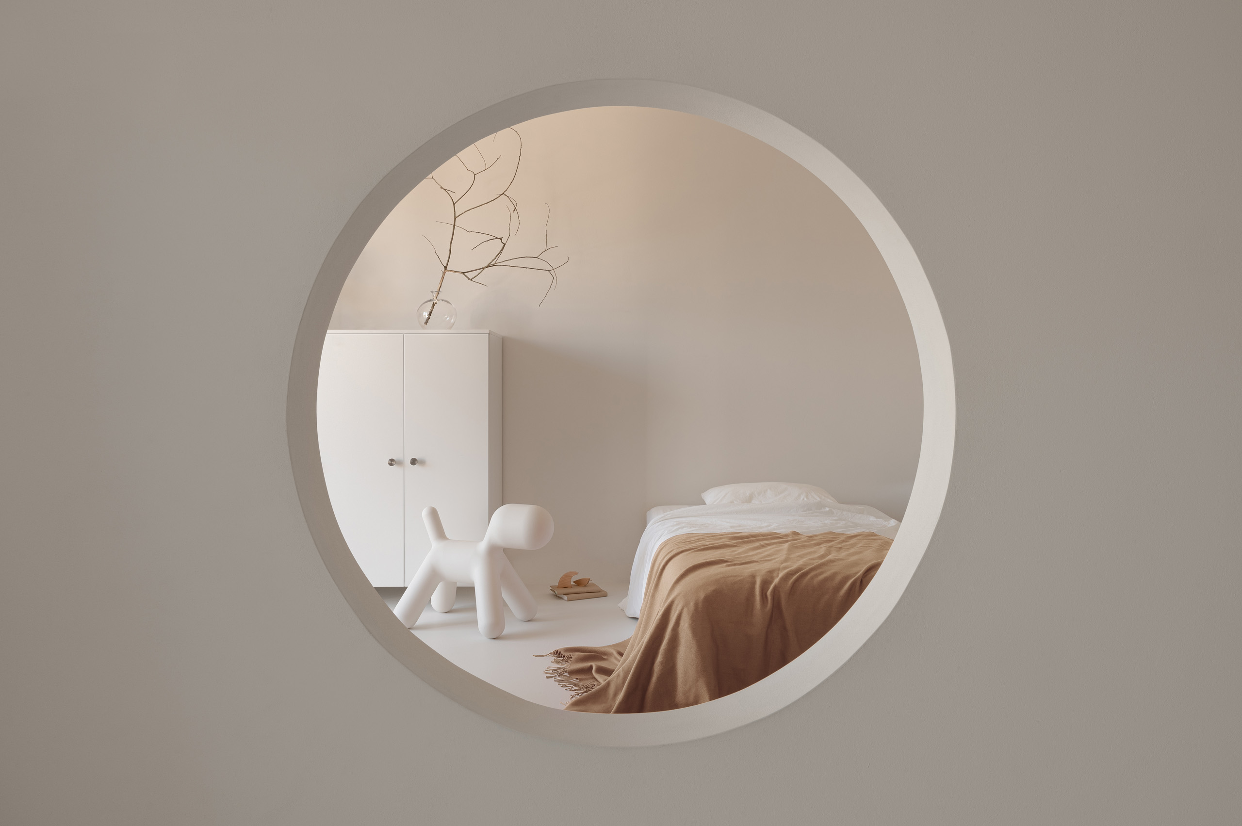 Ще один оригінальний елемент планування – круглий отвір між двома дзеркально симетричними дитячими спальнями, що об’єднує їх у спільний простір для гри та взаємодії. У майбутньому, коли діти виростуть і з’явиться потреба в приватності, цей отвір легко закрити.