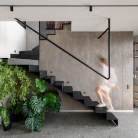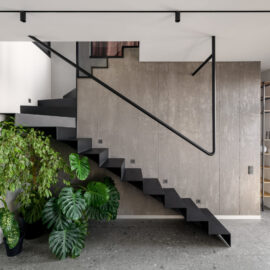 Нижній рівень – “житловий“. Тут розмістилися спальня та кухня-їдальня. Ядром простору є сходова клітка з оригінальним поручнем, що кріпиться до перекриття, а не як зазвичай до самої конструкції сходів.
