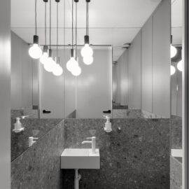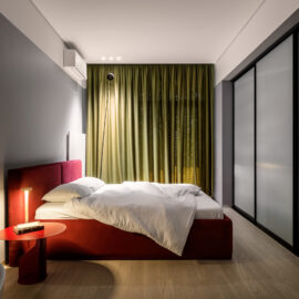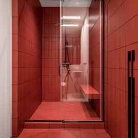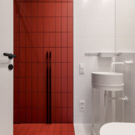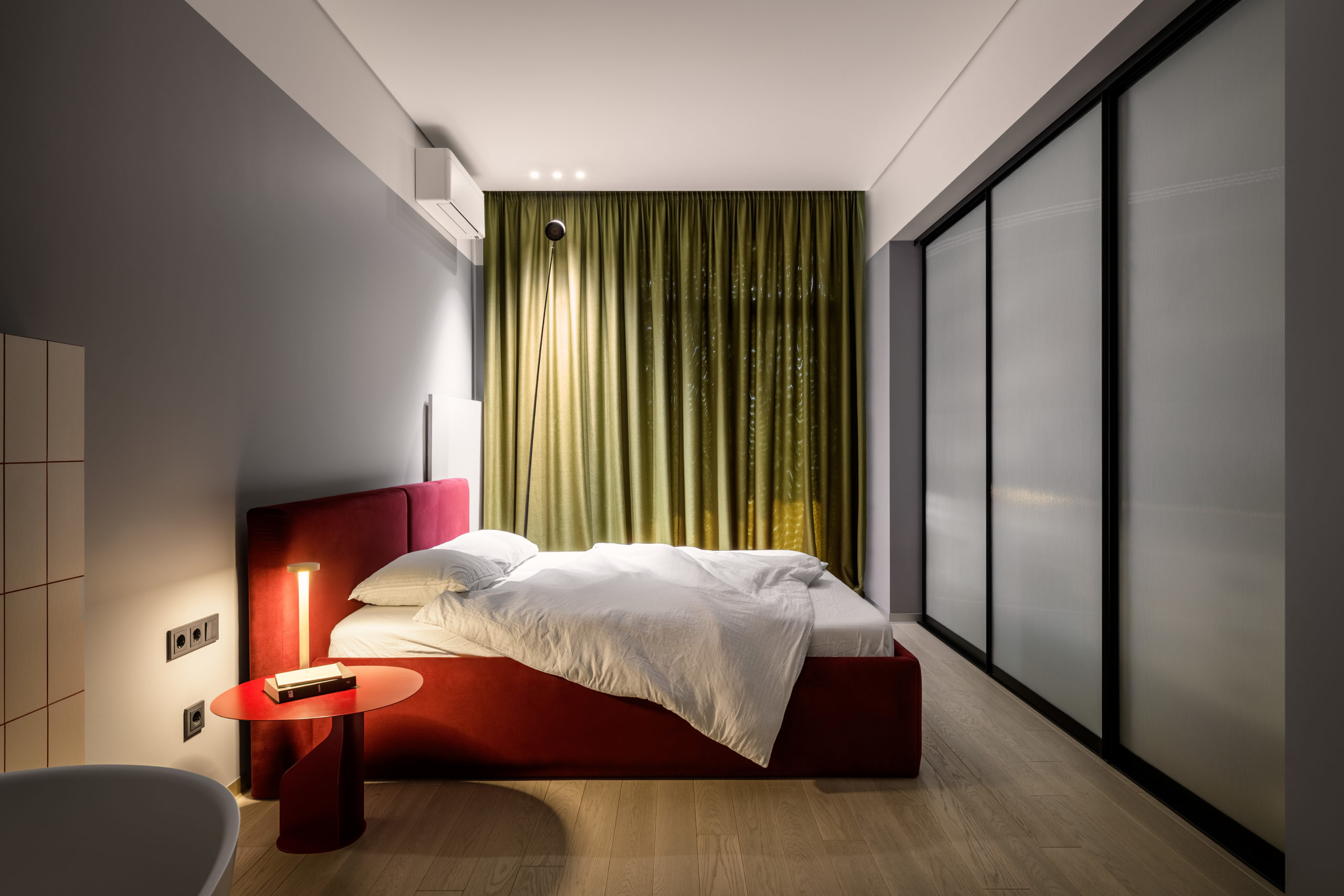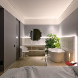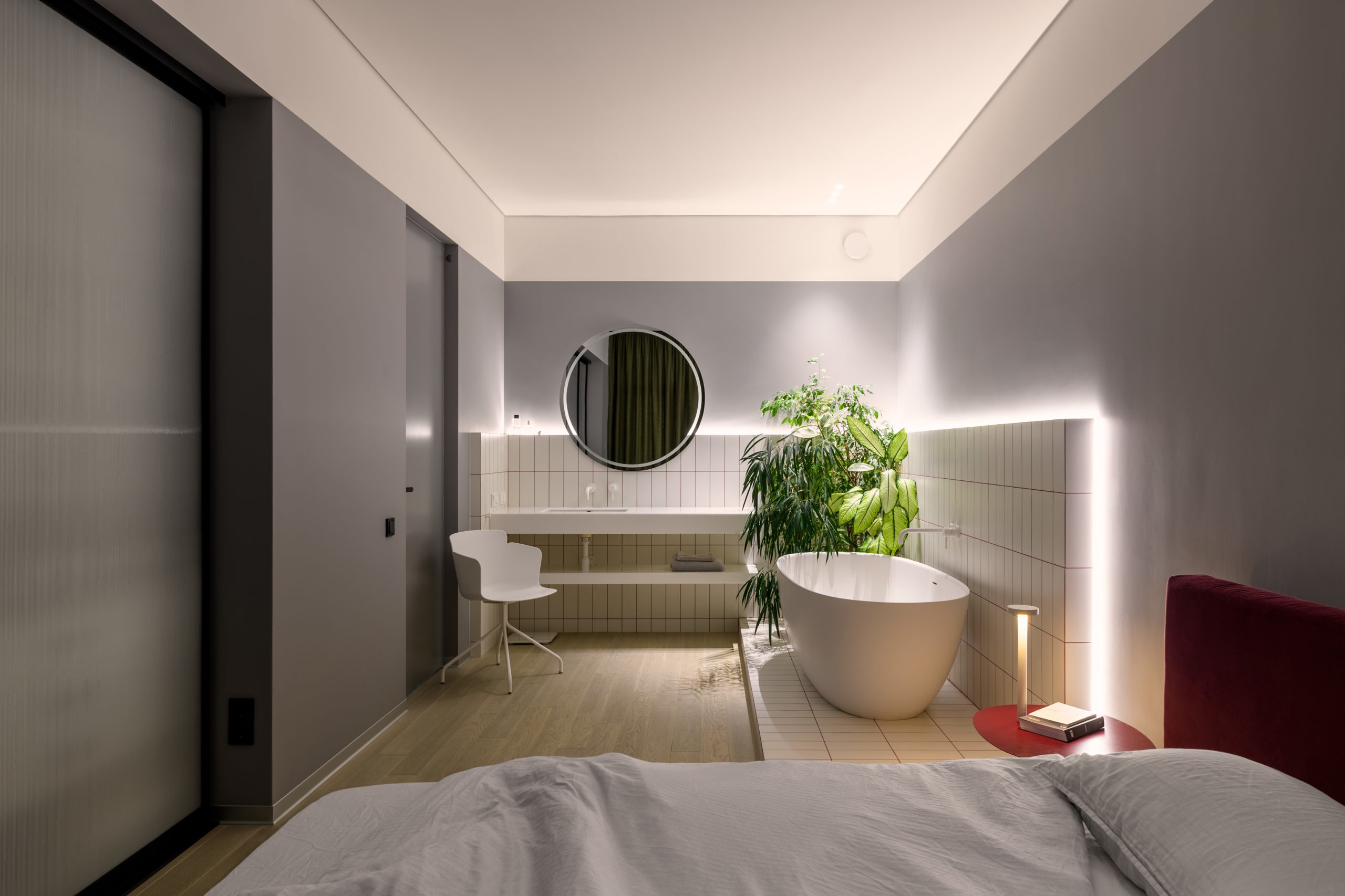 Родзинкою квартири є спальня. Зона санвузла розмита, ванна та основний умивальник розміщено безпосередньо у спальні, а шумні процеси – душ, унітаз та ще один умивальник розміщені у окремому приміщенні за дверима.
