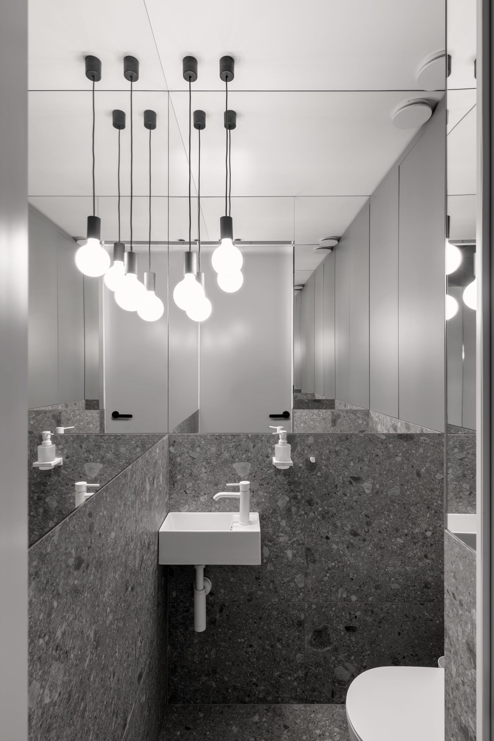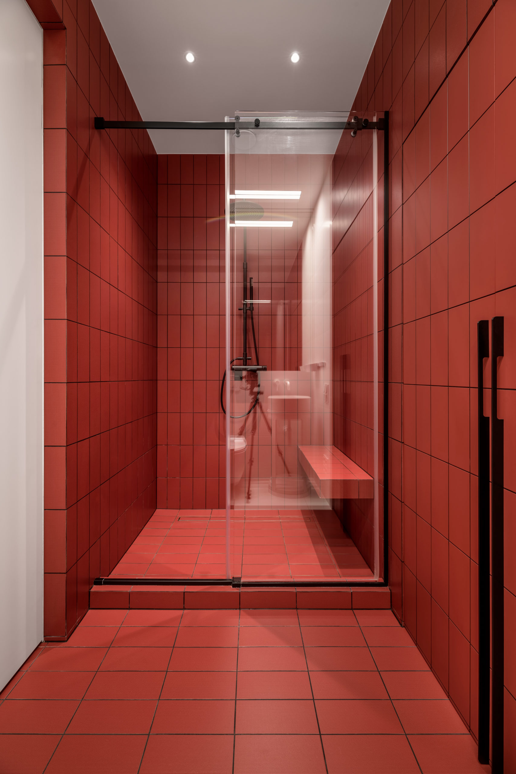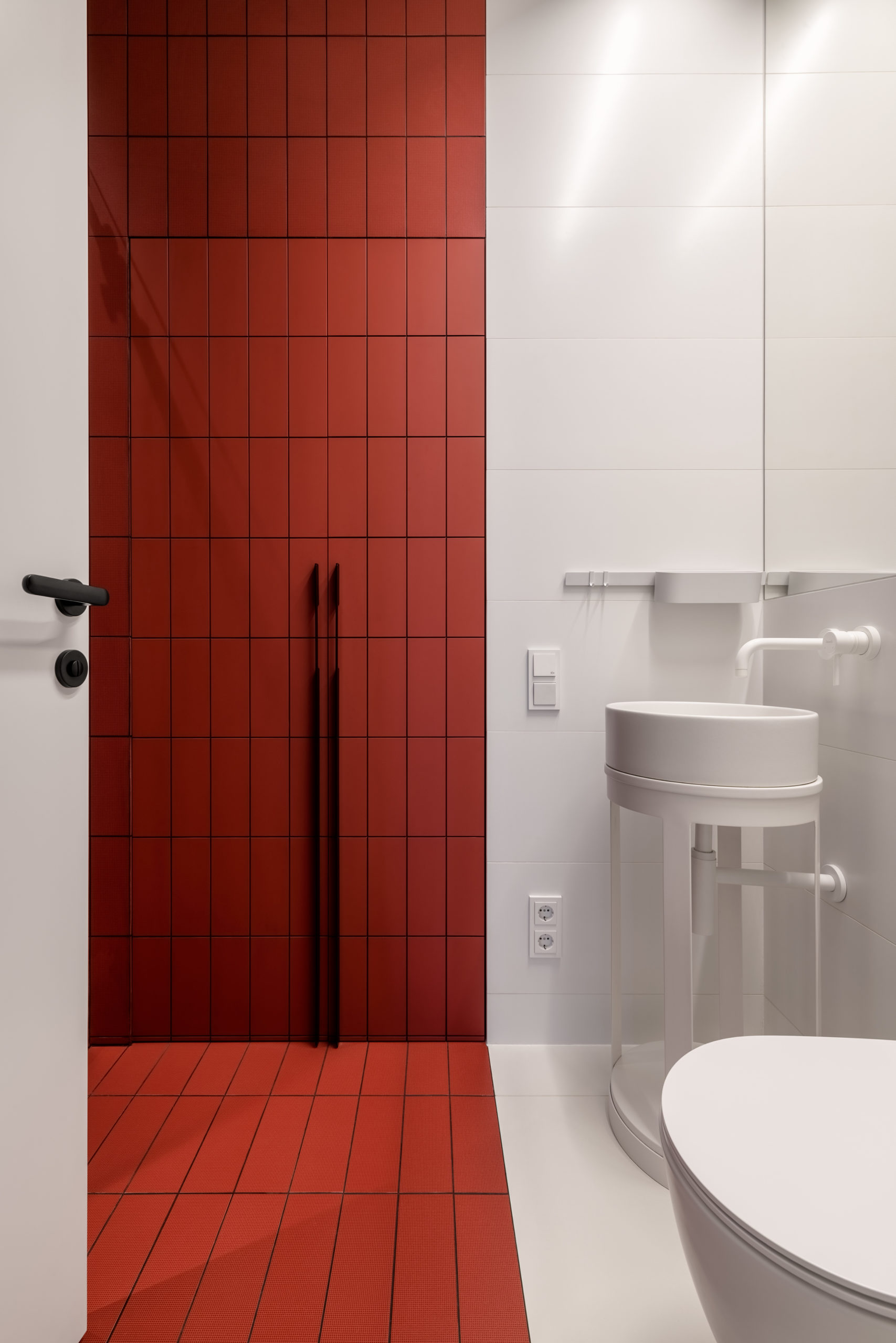 Родзинкою квартири є спальня. Зона санвузла розмита, ванна та основний умивальник розміщено безпосередньо у спальні, а шумні процеси – душ, унітаз та ще один умивальник розміщені у окремому приміщенні за дверима.