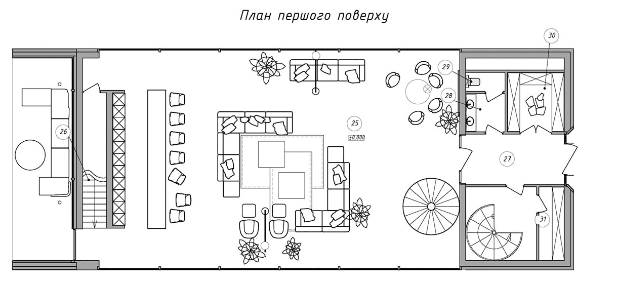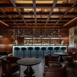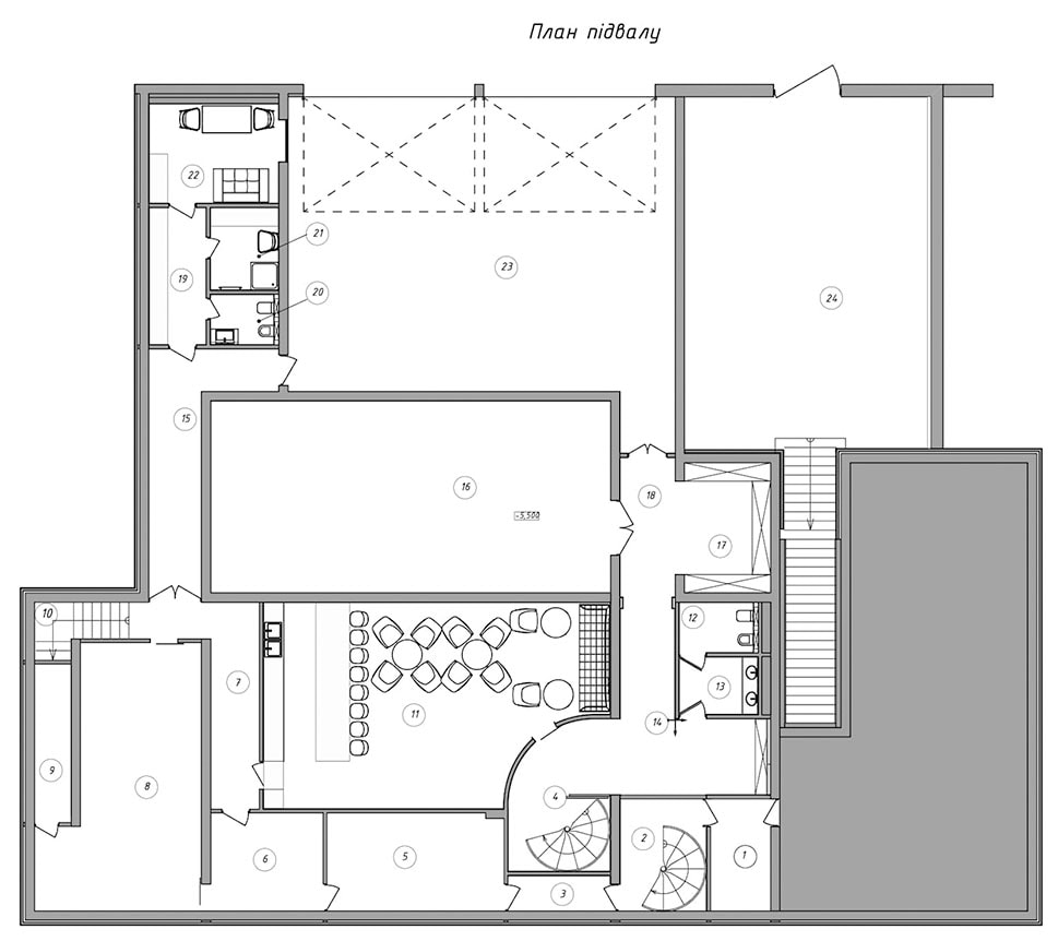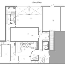 Все технические помещения — от гаража и постирочных комнат до технической кухни — располагаются в цокольном этаже. Есть здесь и особое место — скрытый от посторонних глаз американский бар, где хозяева дома могут уединиться, забыв ненадолго о повседневных заботах, гаджетах, мессенджерах и срочных встречах. Деревянные столы с круглыми столешницами, кожаные кресла и барные стулья, панели из дерева, кессонный потолок с зеркальными вставками — атмосфера здесь напоминает обстановку нью-йоркских или чикагских баров 40—50 гг. с их явно мужским характером и живой джазовой музыкой на фоне клубов сигарного дыма и гула низких голосов, но в современном прочтении. А завершают визуальный образ пинап-постеры.