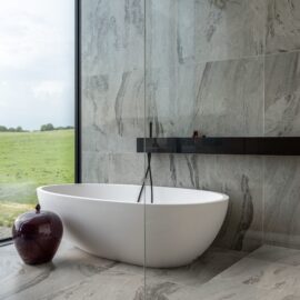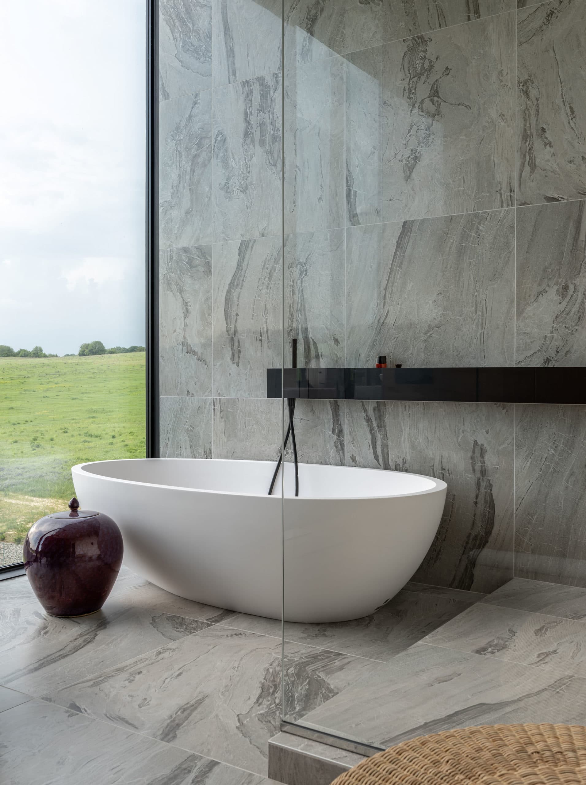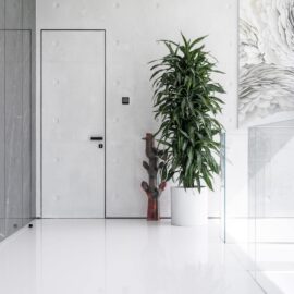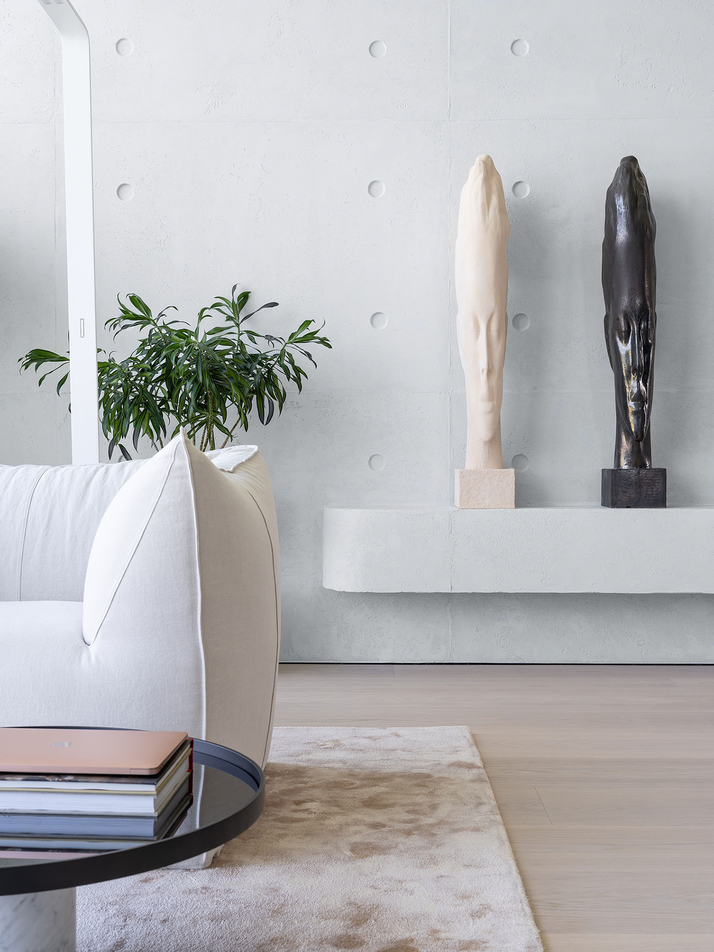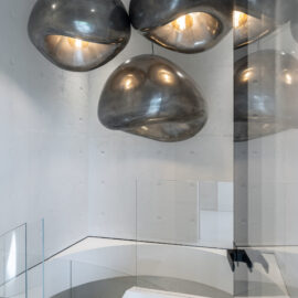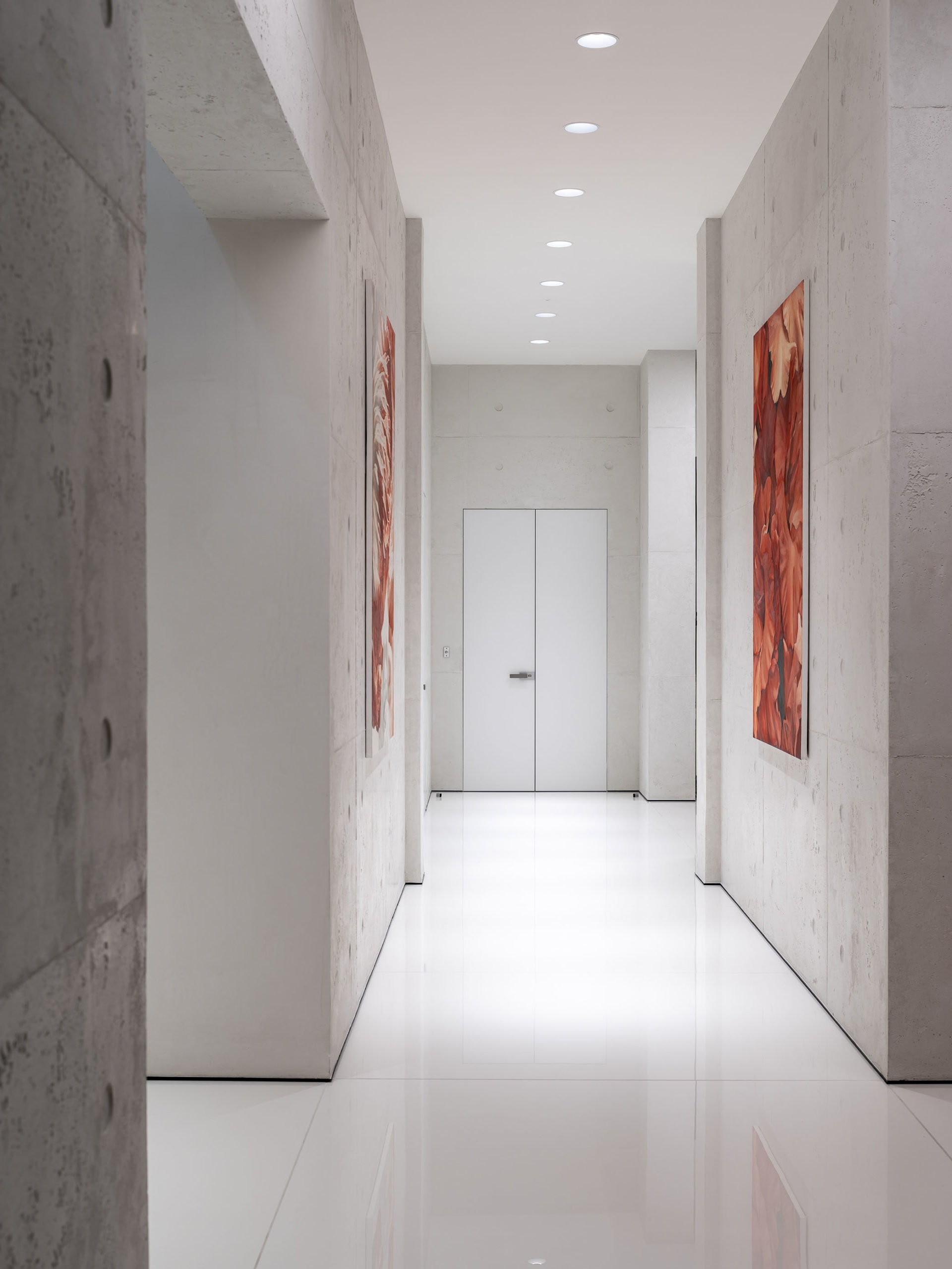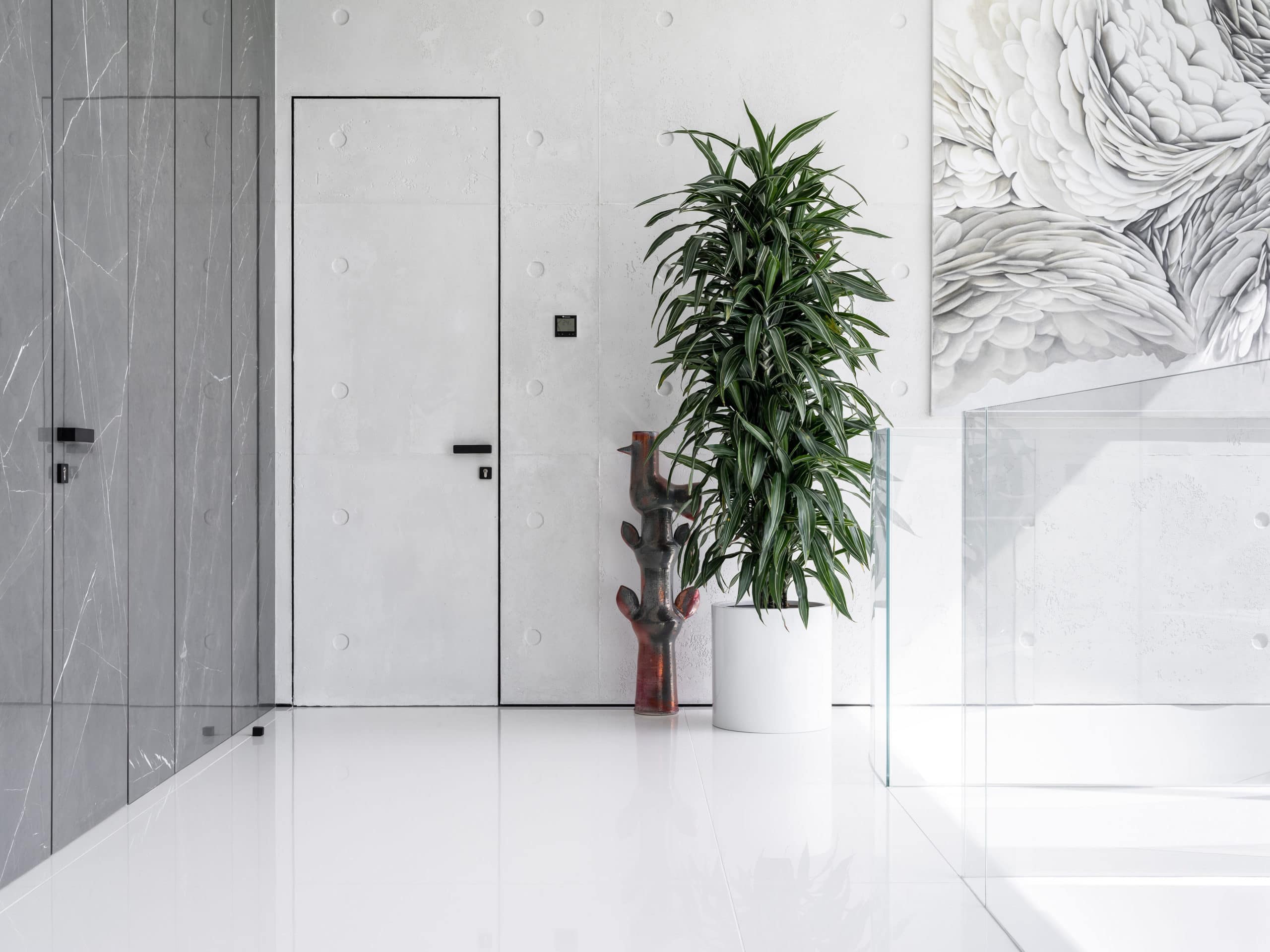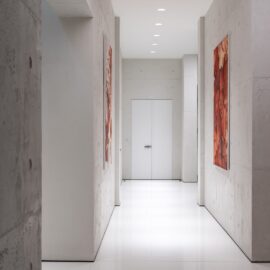 Мощная система вентиляции с фильтрацией воздуха и технологией сбора пыли, терморегуляция, подогрев пола и стекла — эти и другие высокотехнологичные вещи скрыты за вуалью литого бетона и управляются системой «умный дом».