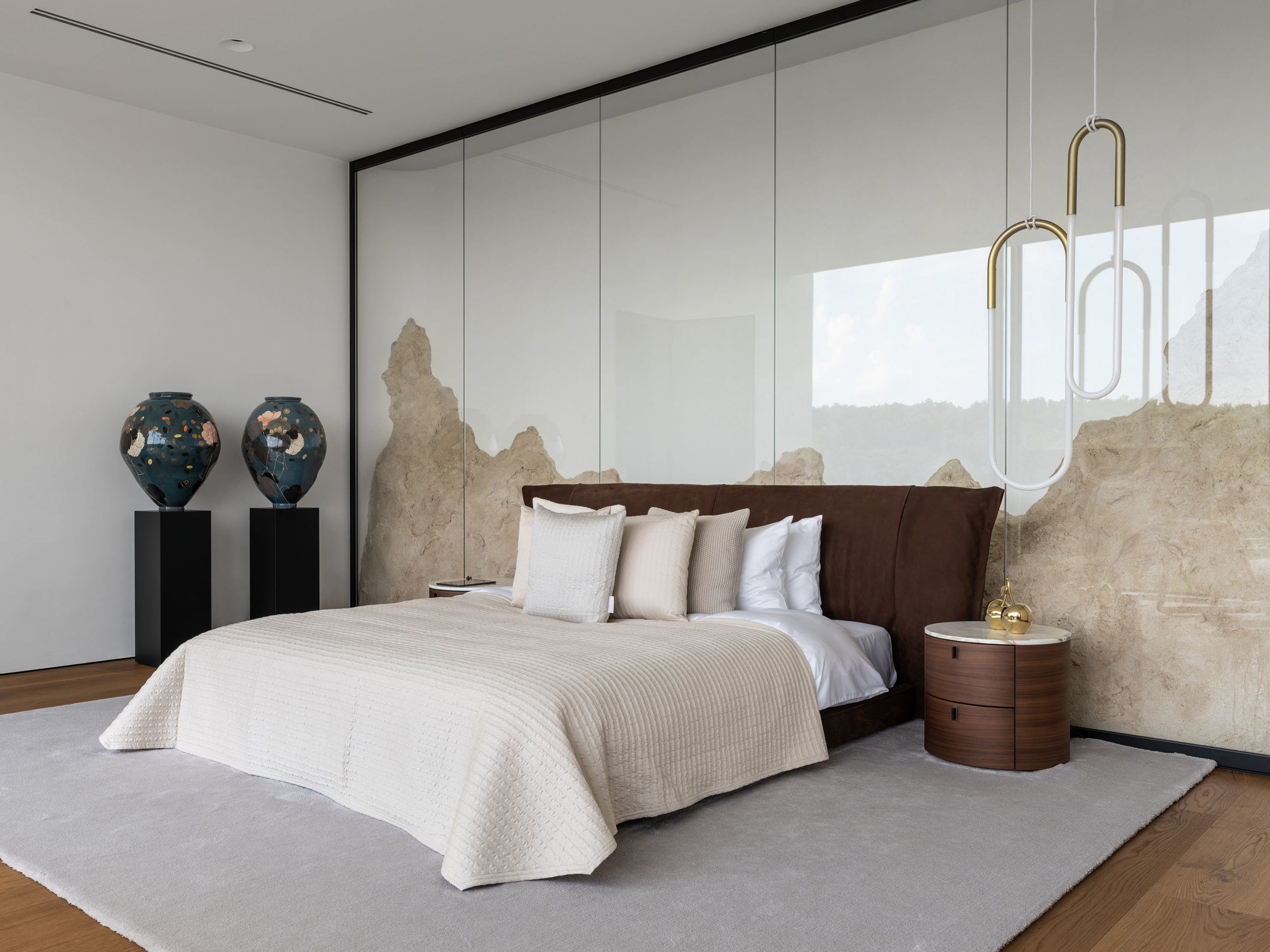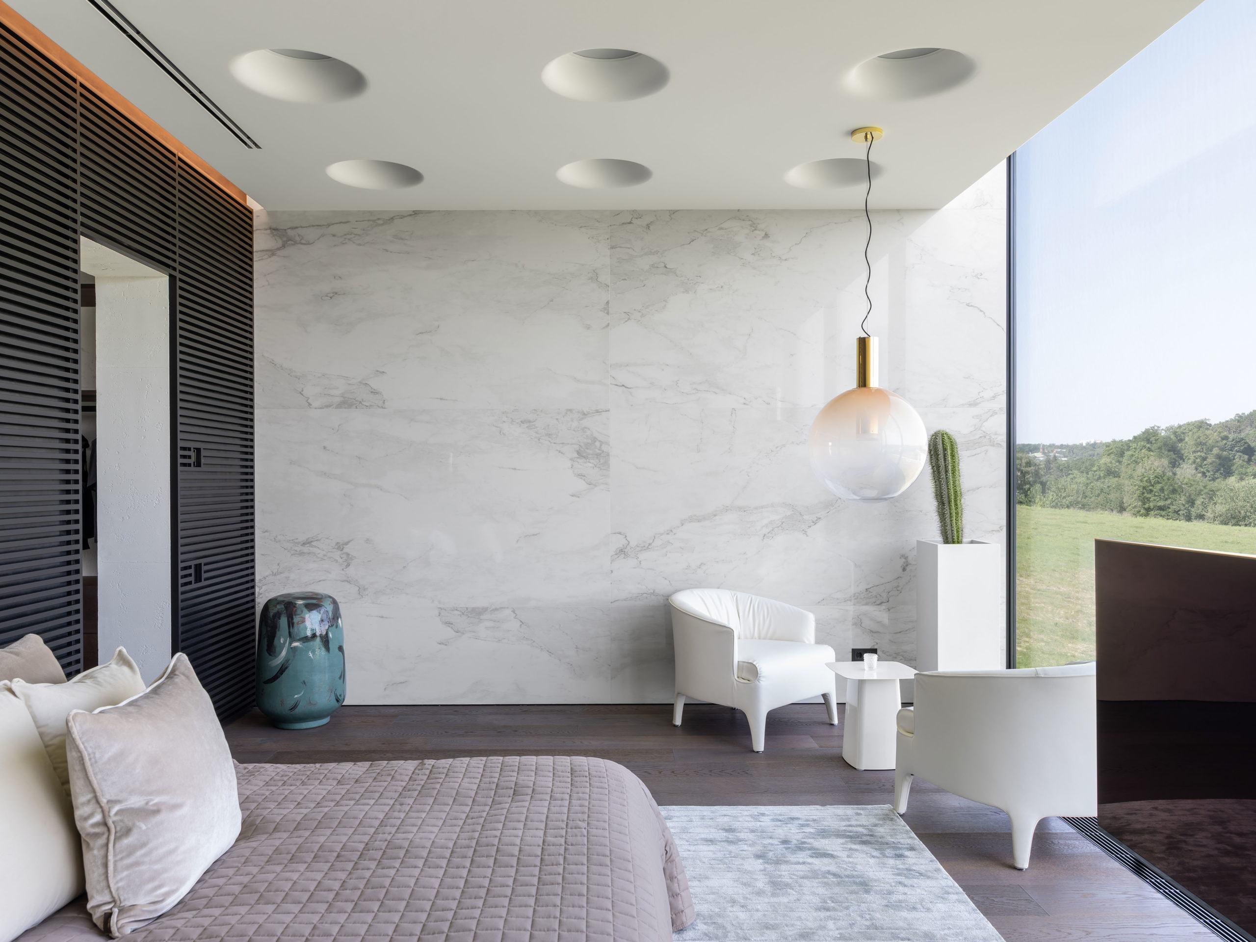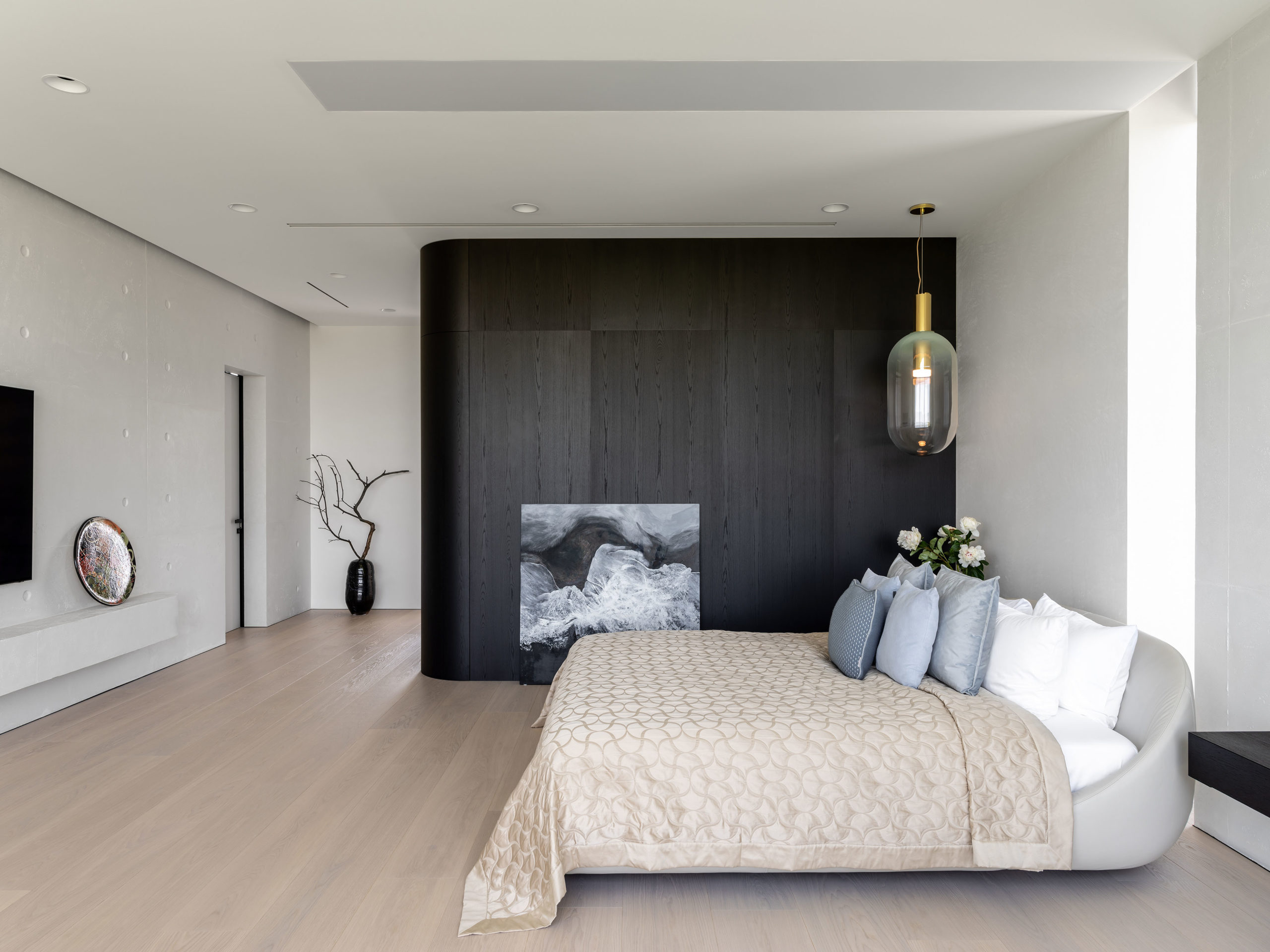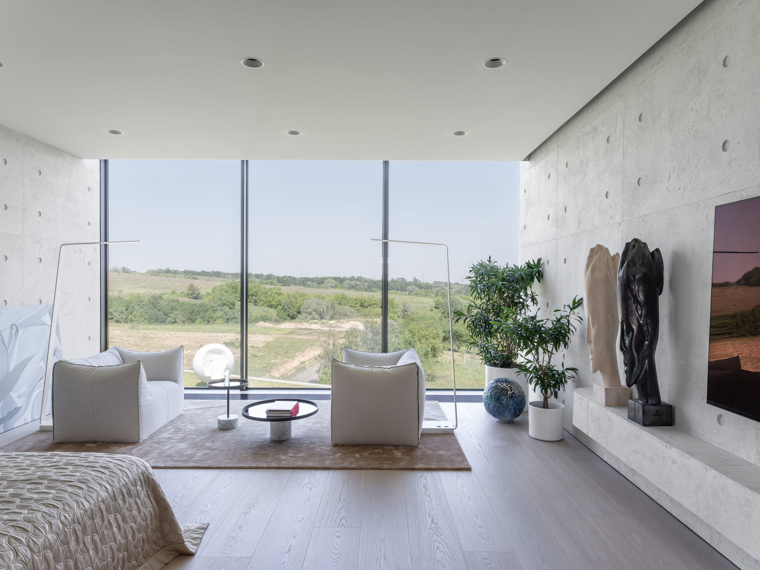 Верхний объем дома отведен под спальни. В каждой имеется отдельный санузел и гардеробная комната, а вместо одной из стен — стекло, чтобы, просыпаясь, можно было наслаждаться видом природы из окна. При этом помещения отличаются по колористике — от карамельно-пшеничного до темного медового. К слову, все они носят имена. Например, спальня «Скала» называется так из‑за объемной скалистой поверхности, изображенной на стене за изголовьем кровати. Теплые оттенки карамели этой «Скалы» гармонично сочетаются с цветом дерева прикроватных тумб и паркетной доски в палубной раскладке. Светлые бетонные стены, молочные оттенки, предметы современного украинского искусства — интерьер хозяйской спальни «День и ночь» построен на контрастном сочетании черного и белого как символ выбора между светом и тьмой. В «Сумерках» преобладают оттенки черного и меди. В круглых отверстиях в потолке, напоминающих то ли сыр маасдам, то ли лунные кратеры, спрятаны светильники.