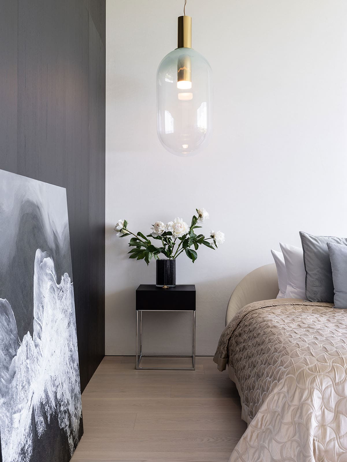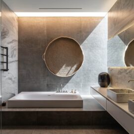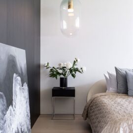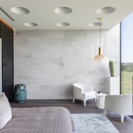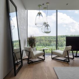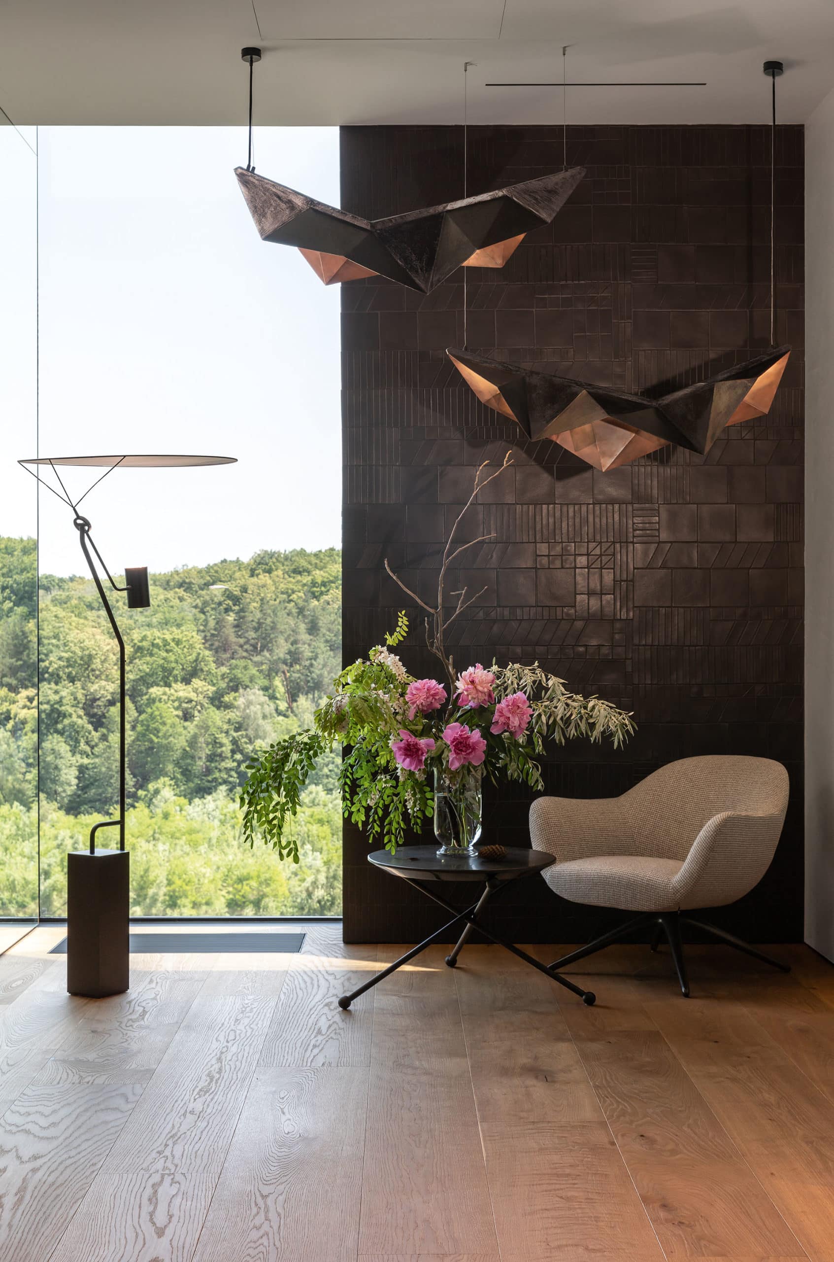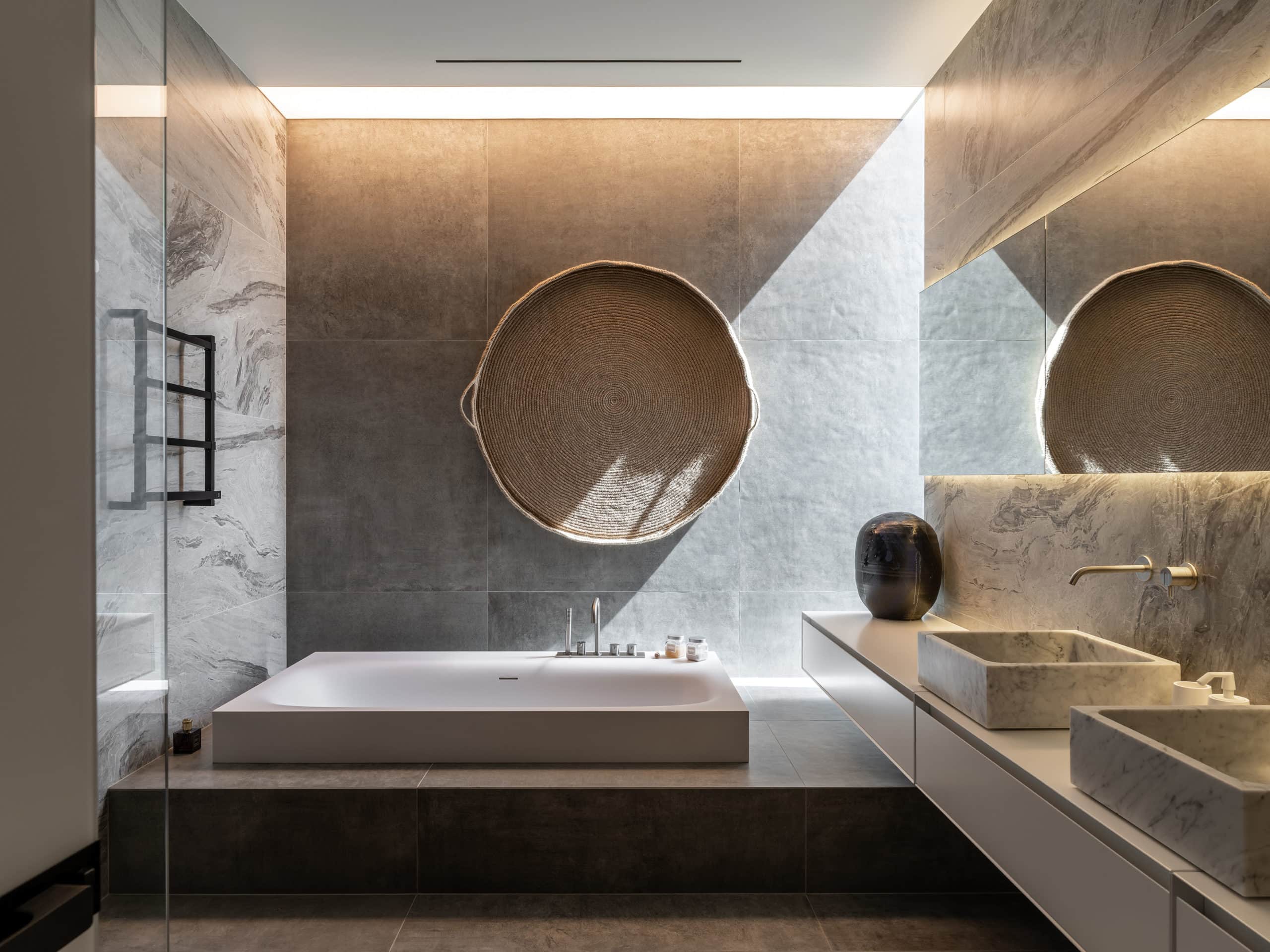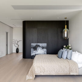 Верхний объем дома отведен под спальни. В каждой имеется отдельный санузел и гардеробная комната, а вместо одной из стен — стекло, чтобы, просыпаясь, можно было наслаждаться видом природы из окна. При этом помещения отличаются по колористике — от карамельно-пшеничного до темного медового. К слову, все они носят имена. Например, спальня «Скала» называется так из‑за объемной скалистой поверхности, изображенной на стене за изголовьем кровати. Теплые оттенки карамели этой «Скалы» гармонично сочетаются с цветом дерева прикроватных тумб и паркетной доски в палубной раскладке. Светлые бетонные стены, молочные оттенки, предметы современного украинского искусства — интерьер хозяйской спальни «День и ночь» построен на контрастном сочетании черного и белого как символ выбора между светом и тьмой. В «Сумерках» преобладают оттенки черного и меди. В круглых отверстиях в потолке, напоминающих то ли сыр маасдам, то ли лунные кратеры, спрятаны светильники.