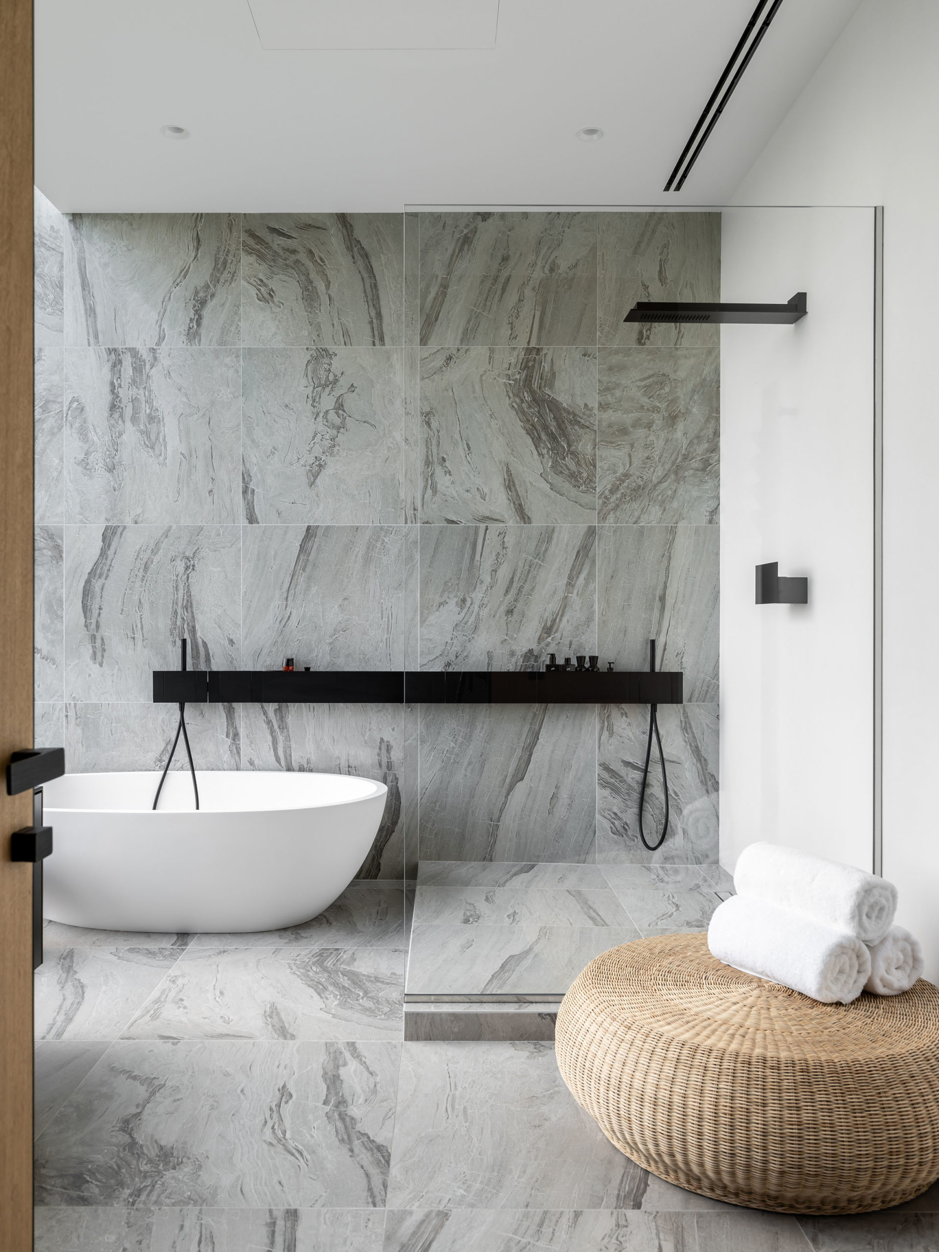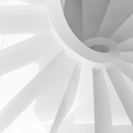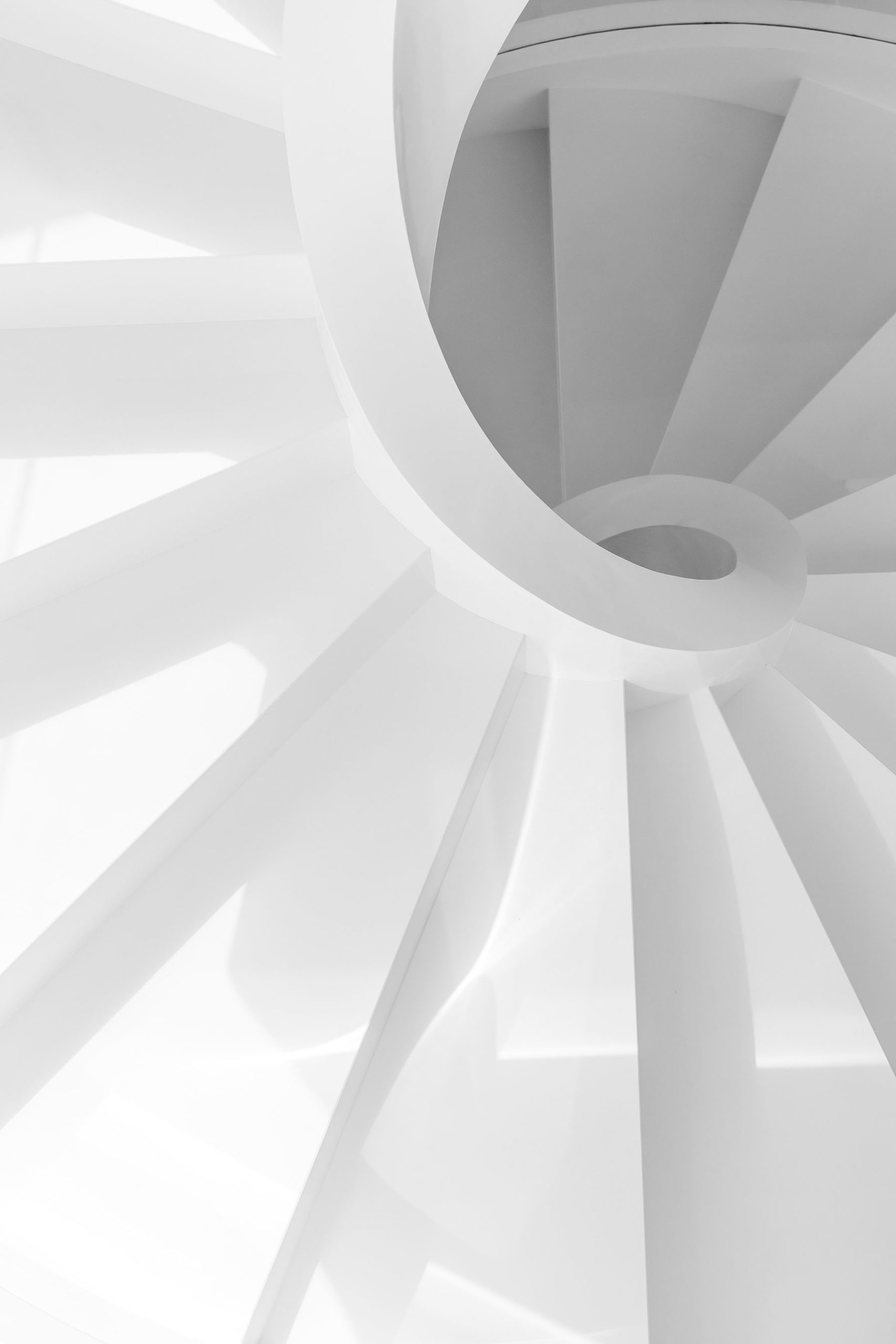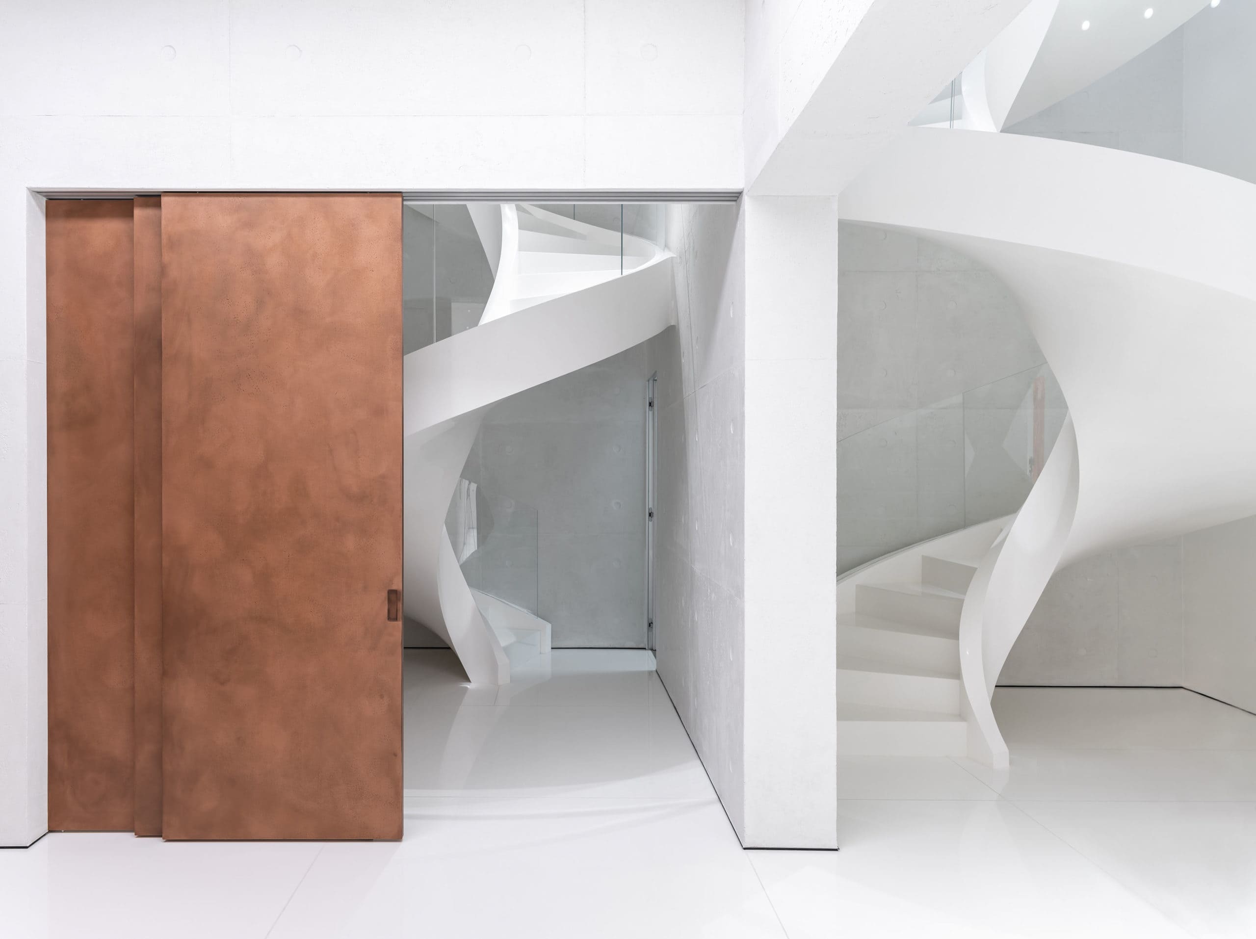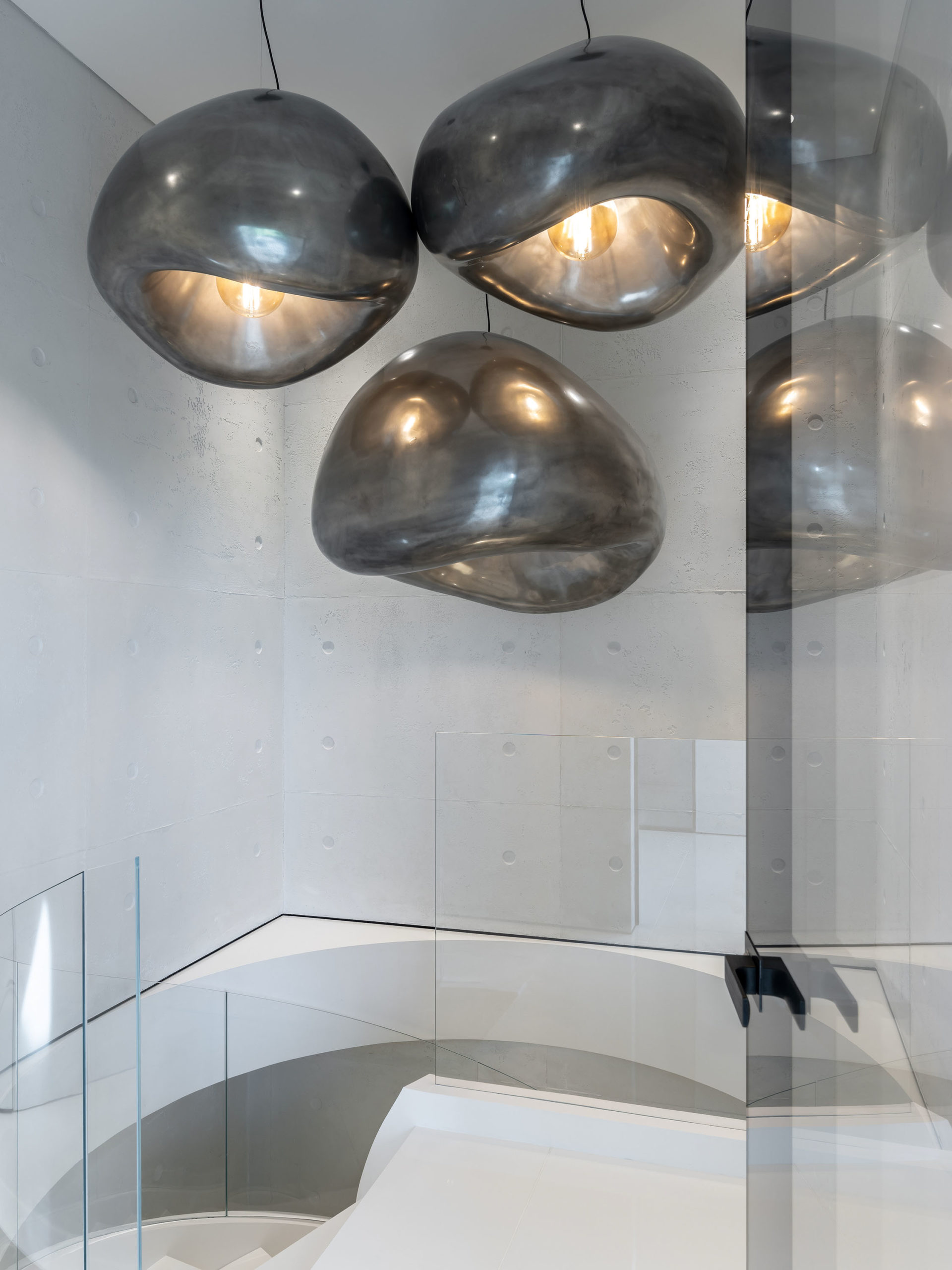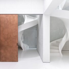 А соединяет все три уровня дома огромная белая винтовая лестница из бетона, тянущаяся до самых спален наверху. Своими мощными витками и изящной формой она больше напоминает скульптурную композицию в стеклянном обрамлении, чем архитектурный элемент.