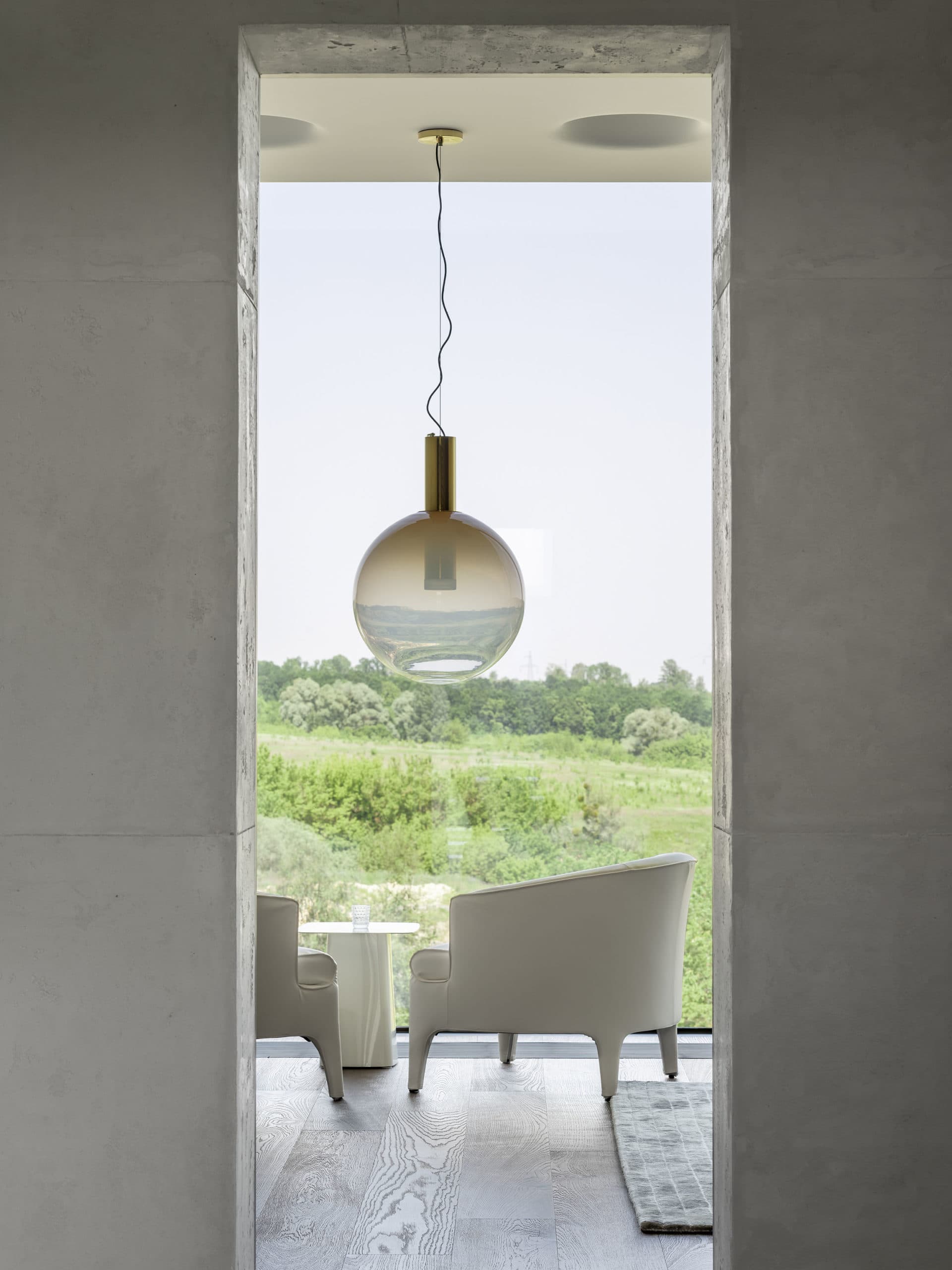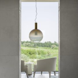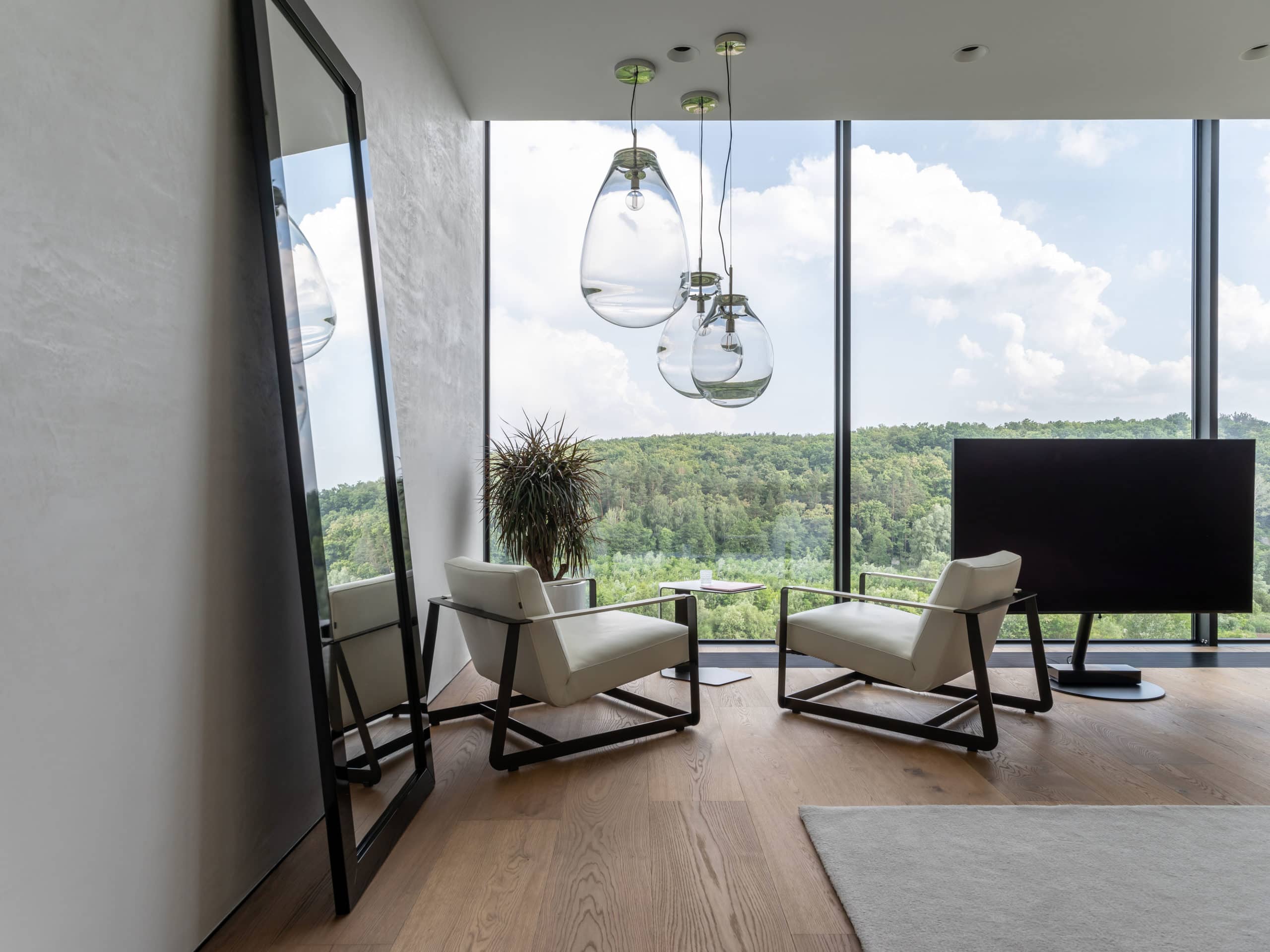 Нижний объем хозяйского дома занимает общая зона, которая представляет собой единое открытое пространство с абсолютно белой гостиной-кухней. Вместо стен — панорамные окна, а на потолке — огромный итальянский светильник весом в полторы (!) тонны, похожий на сотни раскрытых шляпок бумажных японских зонтов-вагаса. Кухня со стеклянными фасадами цвета индиго устроена так, что и готовить, и принимать пищу можно не отрываясь от созерцания природных красот вокруг.
