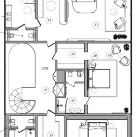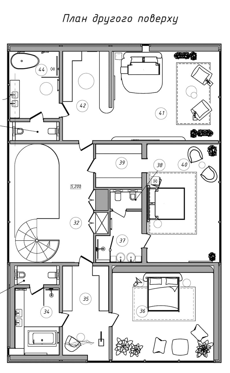 Пока готов интерьер того из «близнецов», который предназначен для владельцев. Он расположен слева от центрального входа на территорию. А смотрящий на него «брат» станет гостевым домом. У них схожая планировка и равная площадь — 2 500 кв. м.