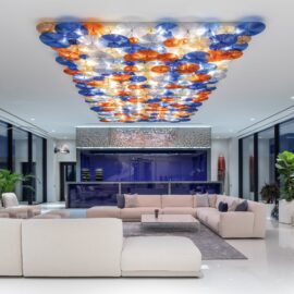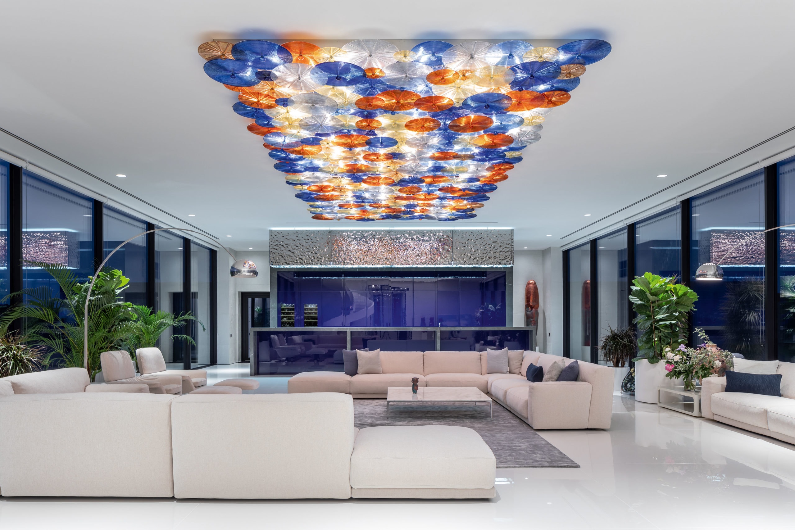 Барная стойка декорирована авторской плиткой Ripple по дизайну Сергея Махно. Сверху на ней — две керамические емкости для имбиря: дух Японии ощутим и в этом помещении. Потолочные подвесные светильники в индустриальном стиле — от Eichholtz, а если хочется праздничного настроения, то стоит сделать одно нажатие кнопки на пульте системы «умный дом» — и начнется настоящее светодиодное шоу.