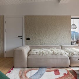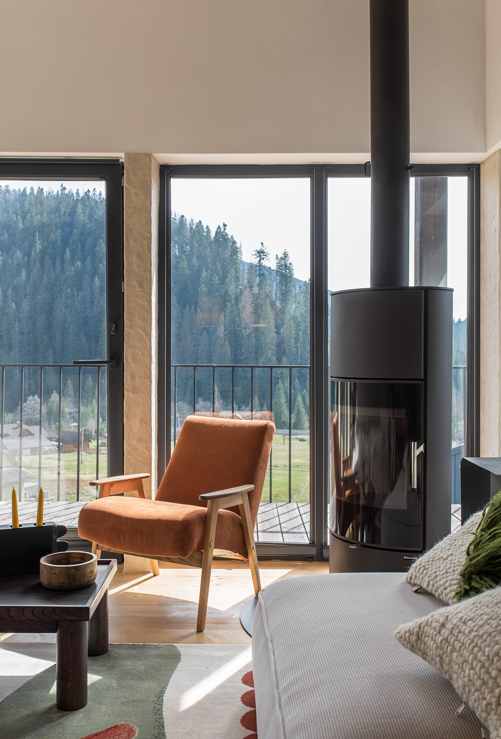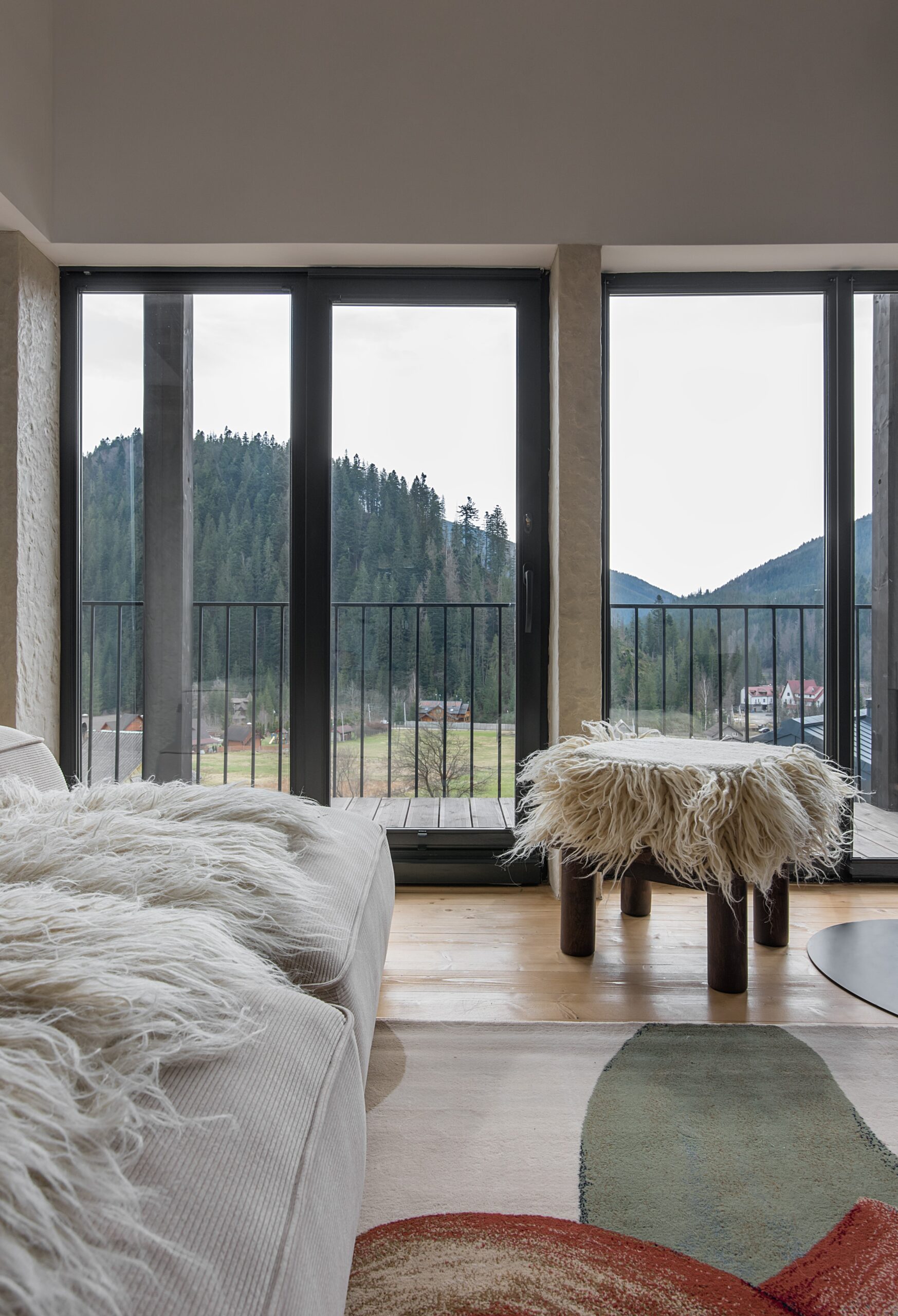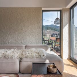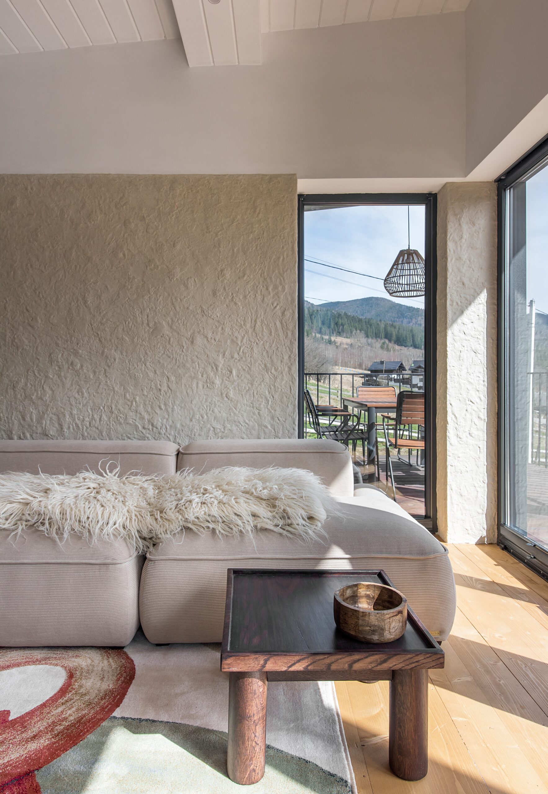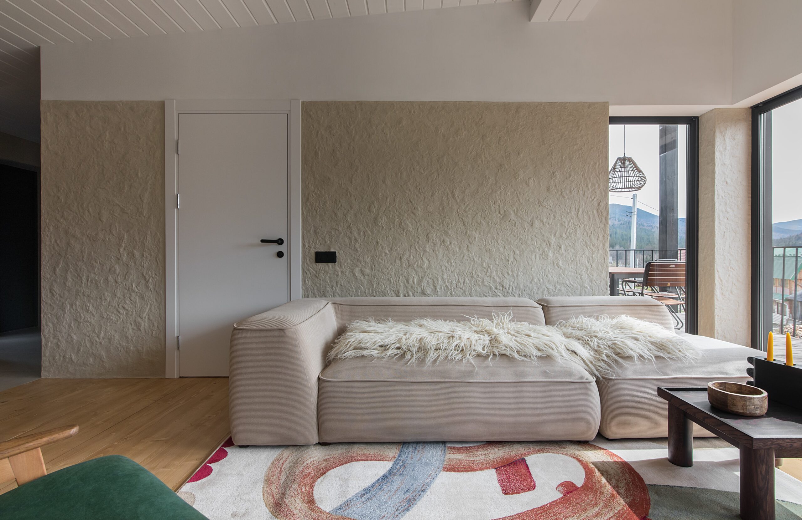 Вітальня Gont з великими вікнами, що відкривають вид на Карпати, модульним кутовим диваном, вінтажними кріслами та іншими елементами інтер’єру створює домашню атмосферу. Тут використовуються столик з натурального дуба, зроблений із пуфа від бренду GUSHKA, яким можна користуватися, знявши подушку, дерев’яні вази від Tvoї Studio та килим від KononenkoID.