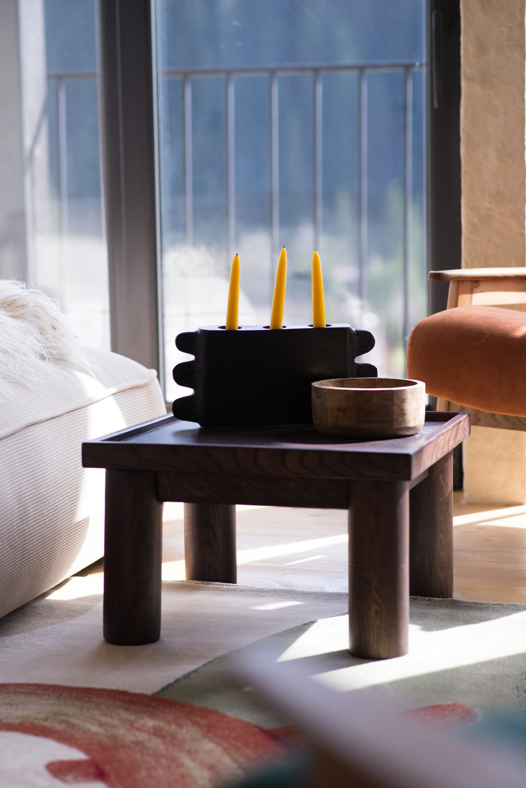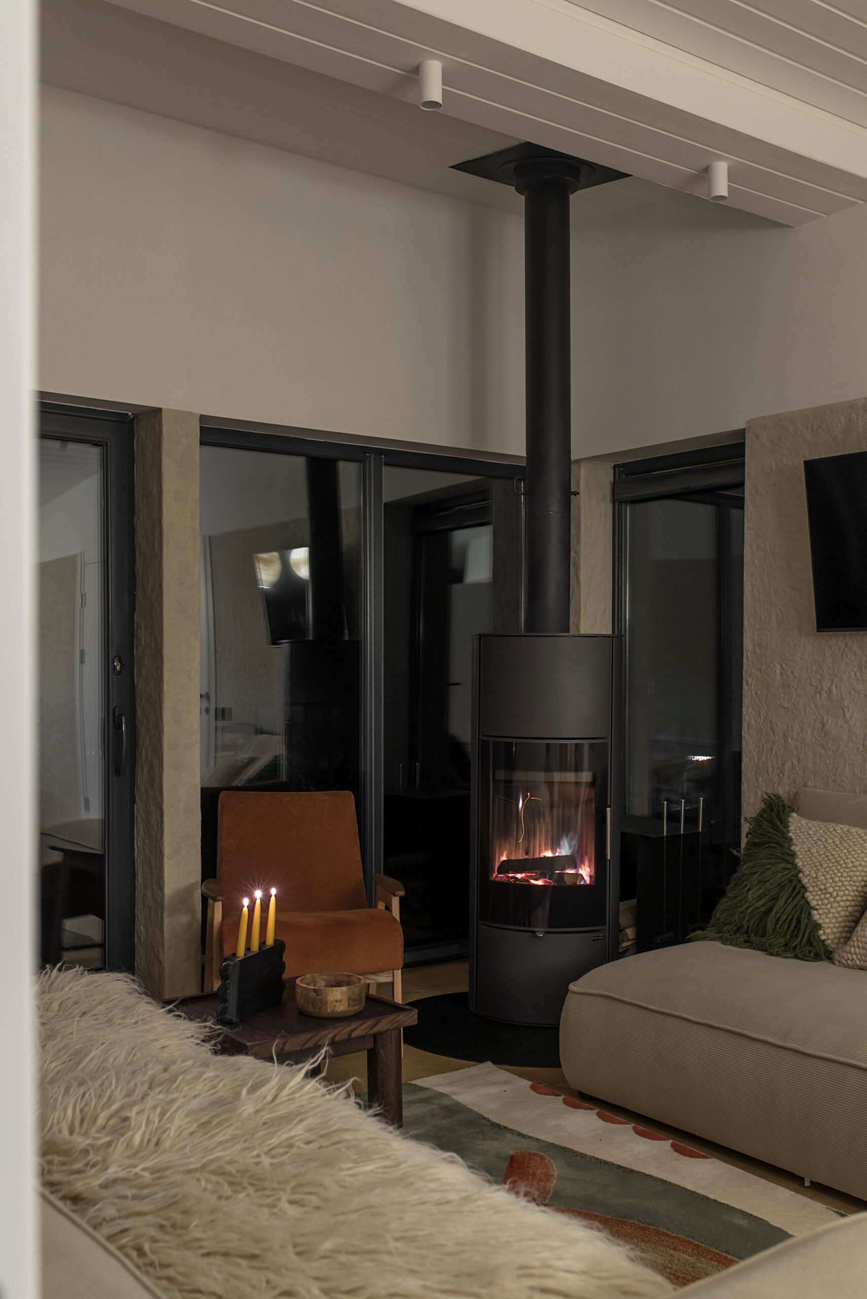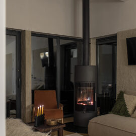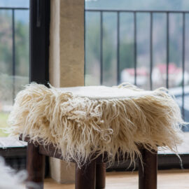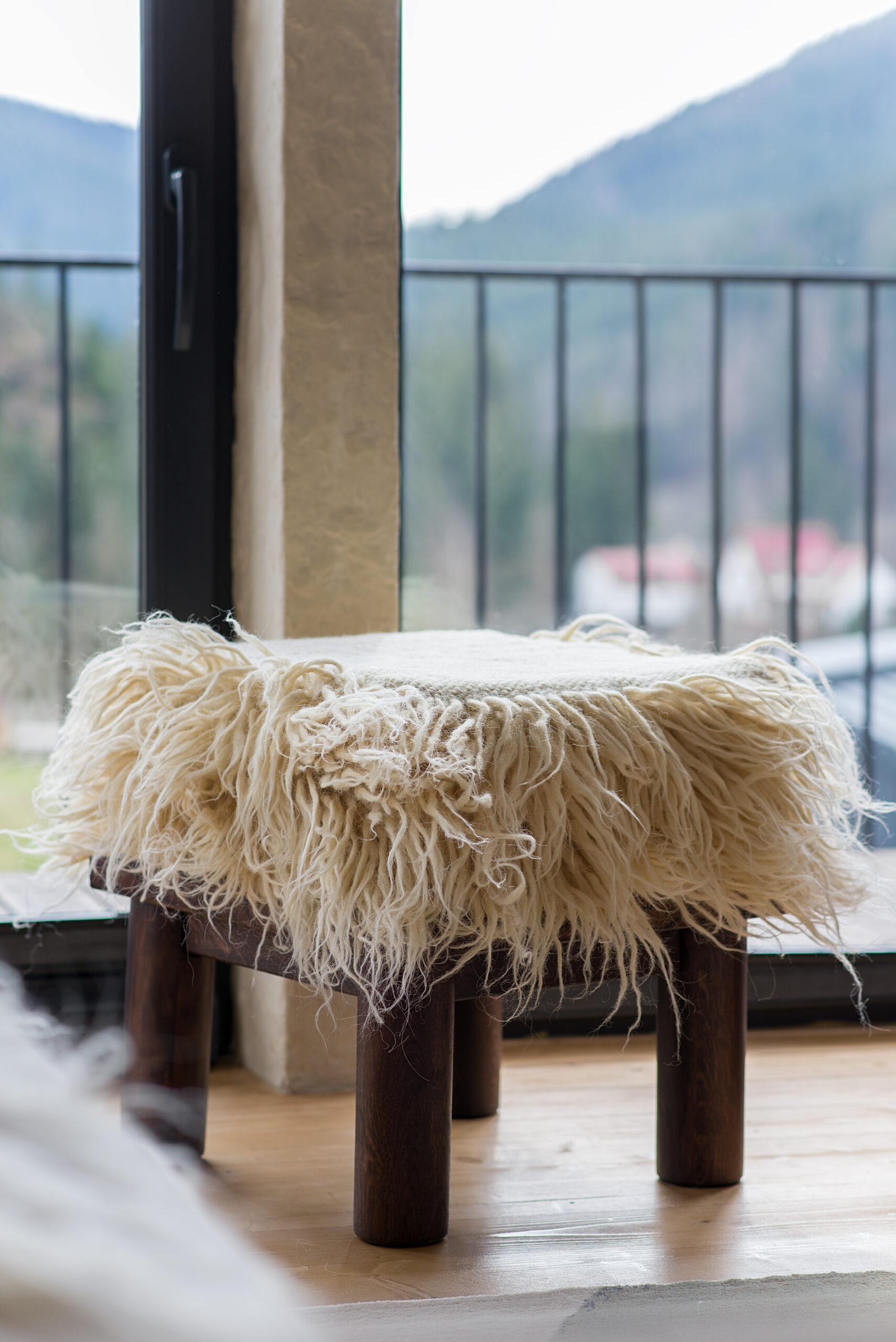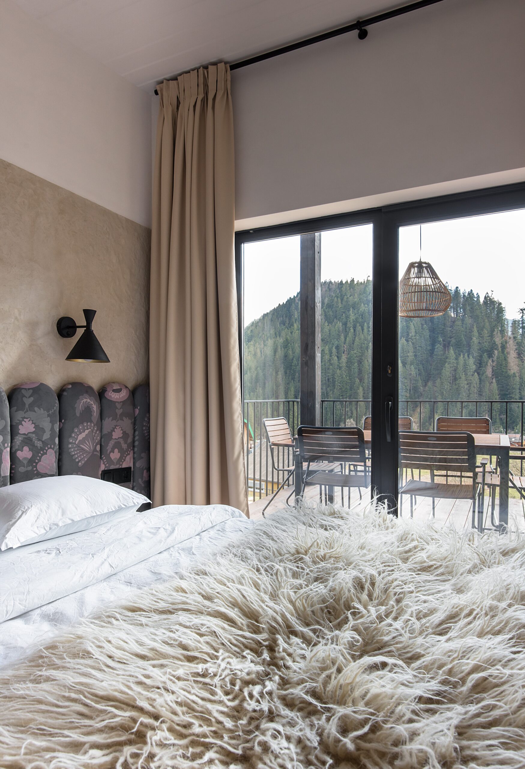 Вітальня Gont з великими вікнами, що відкривають вид на Карпати, модульним кутовим диваном, вінтажними кріслами та іншими елементами інтер’єру створює домашню атмосферу. Тут використовуються столик з натурального дуба, зроблений із пуфа від бренду GUSHKA, яким можна користуватися, знявши подушку, дерев’яні вази від Tvoї Studio та килим від KononenkoID.