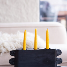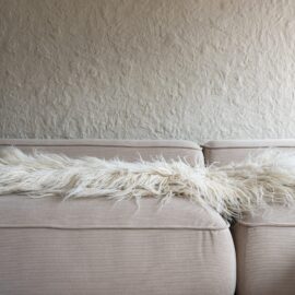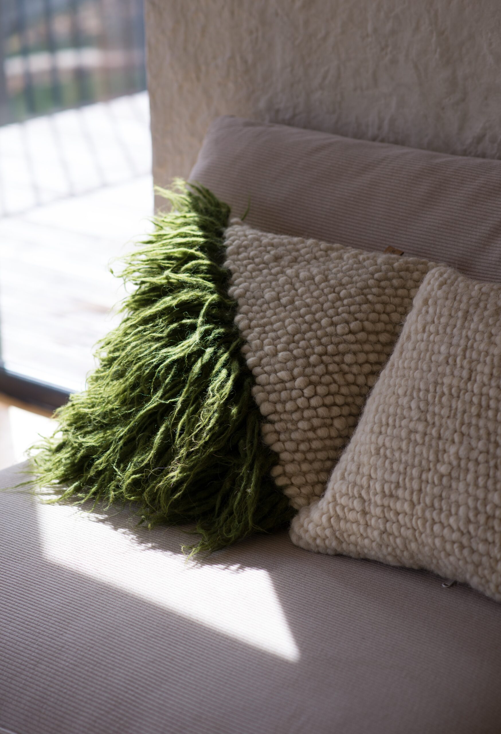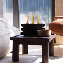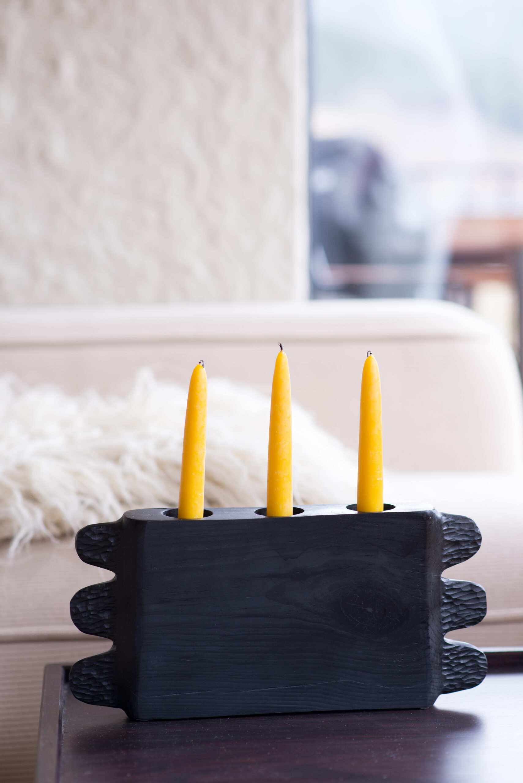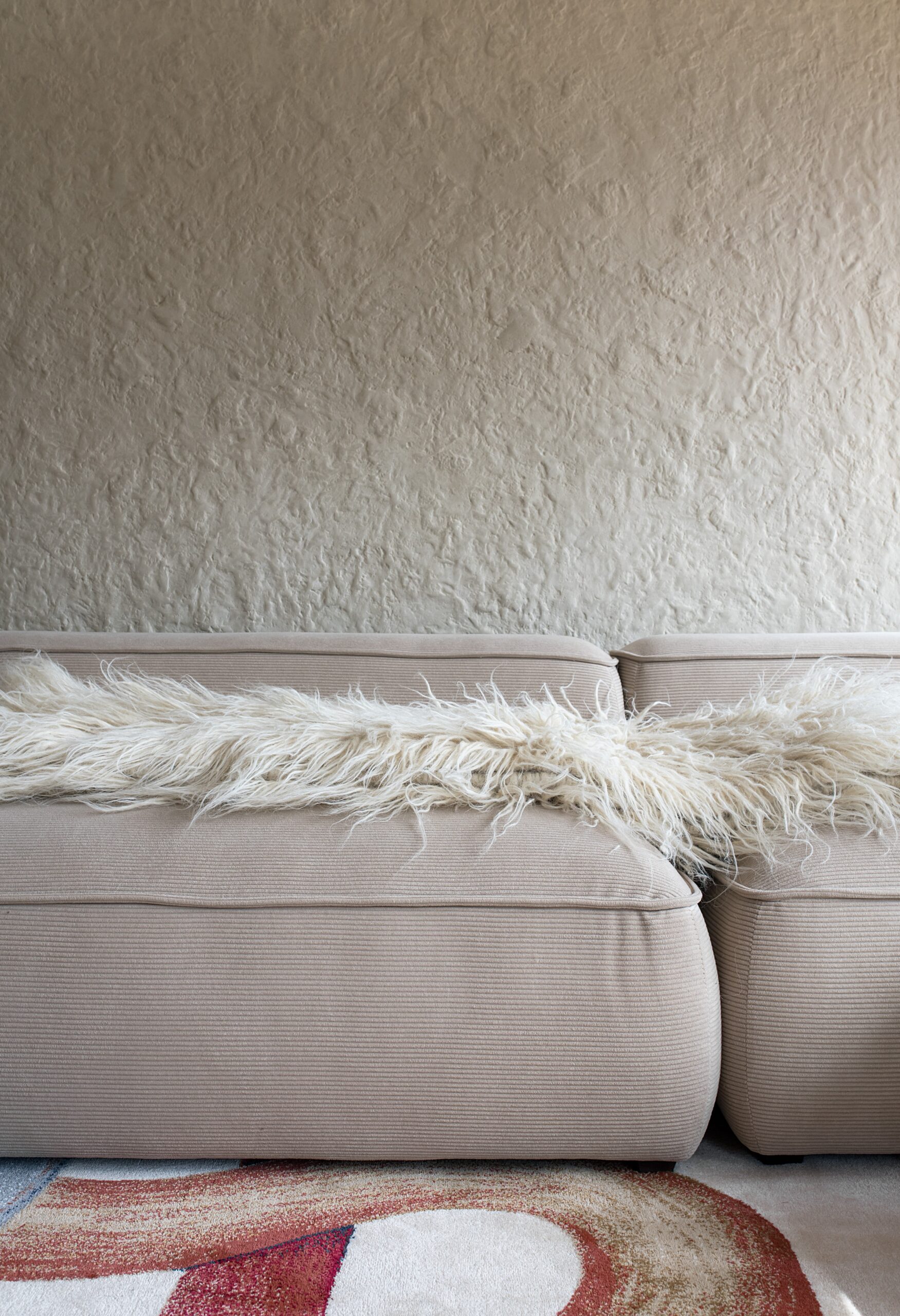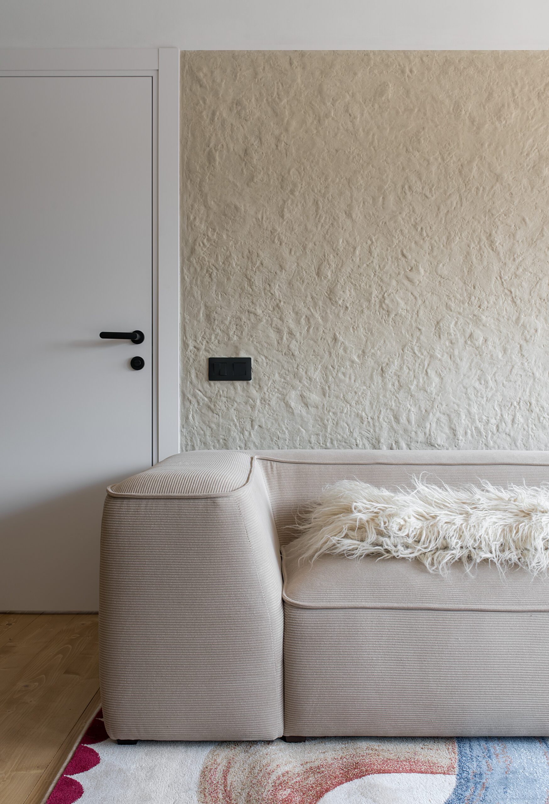 Вітальня Gont з великими вікнами, що відкривають вид на Карпати, модульним кутовим диваном, вінтажними кріслами та іншими елементами інтер’єру створює домашню атмосферу. Тут використовуються столик з натурального дуба, зроблений із пуфа від бренду GUSHKA, яким можна користуватися, знявши подушку, дерев’яні вази від Tvoї Studio та килим від KononenkoID.