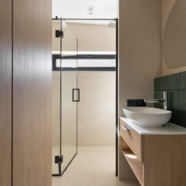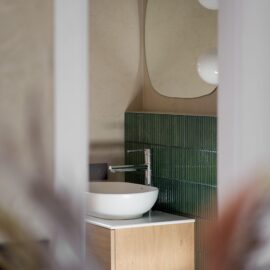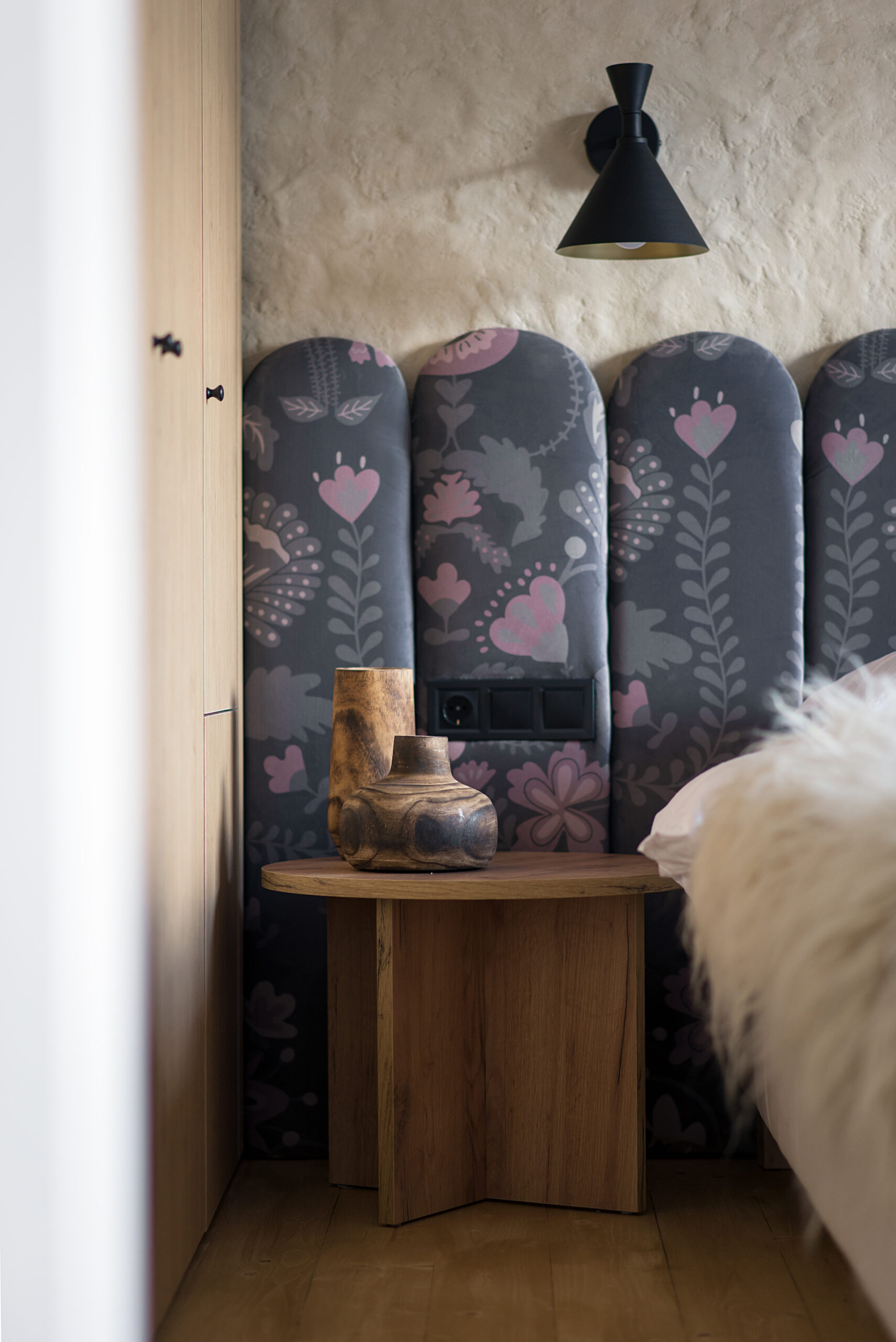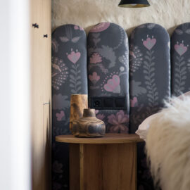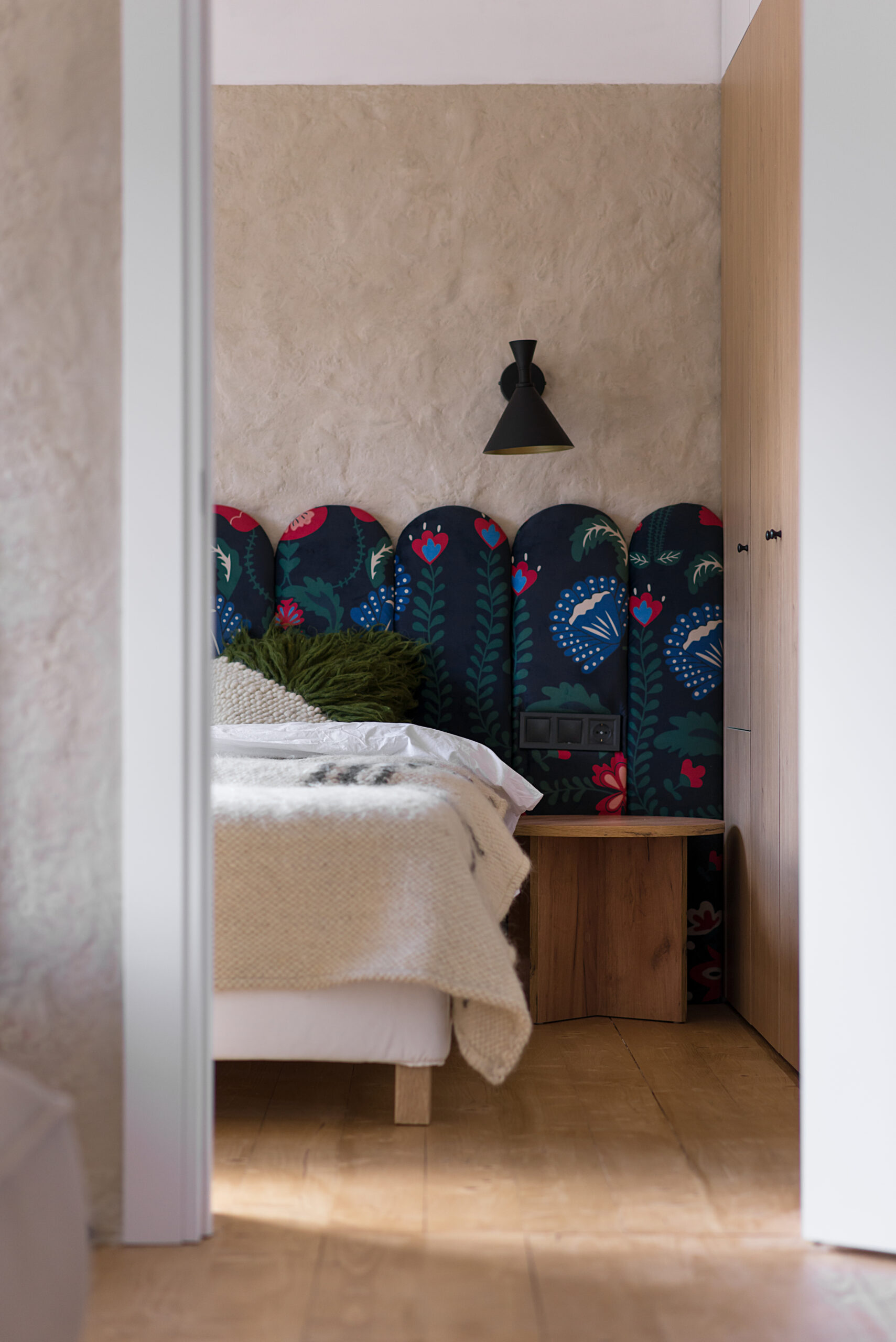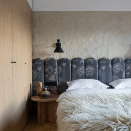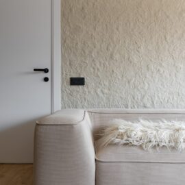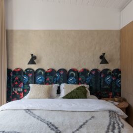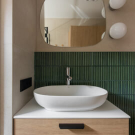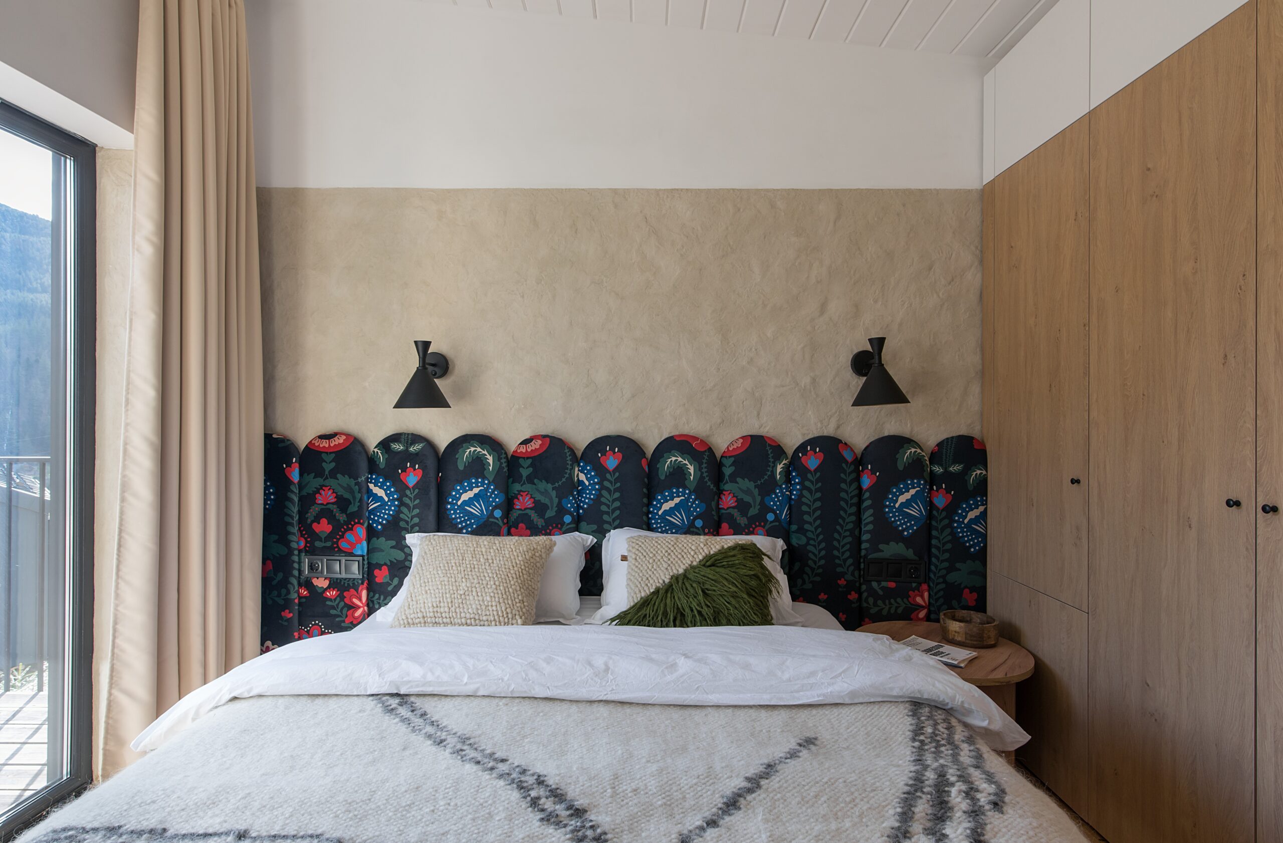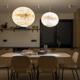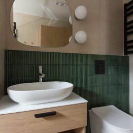 Спальня забезпечує відпочинок і відновлення завдяки використанню дизайнерських узголів’їв та декору від українських брендів, як-от подушки GUSHKA та килим Basny Rugs. Вбиральня з сучасними деталями та природним освітленням завершує гармонійний образ будинку, що відображає єдність з природою та українською культурою.