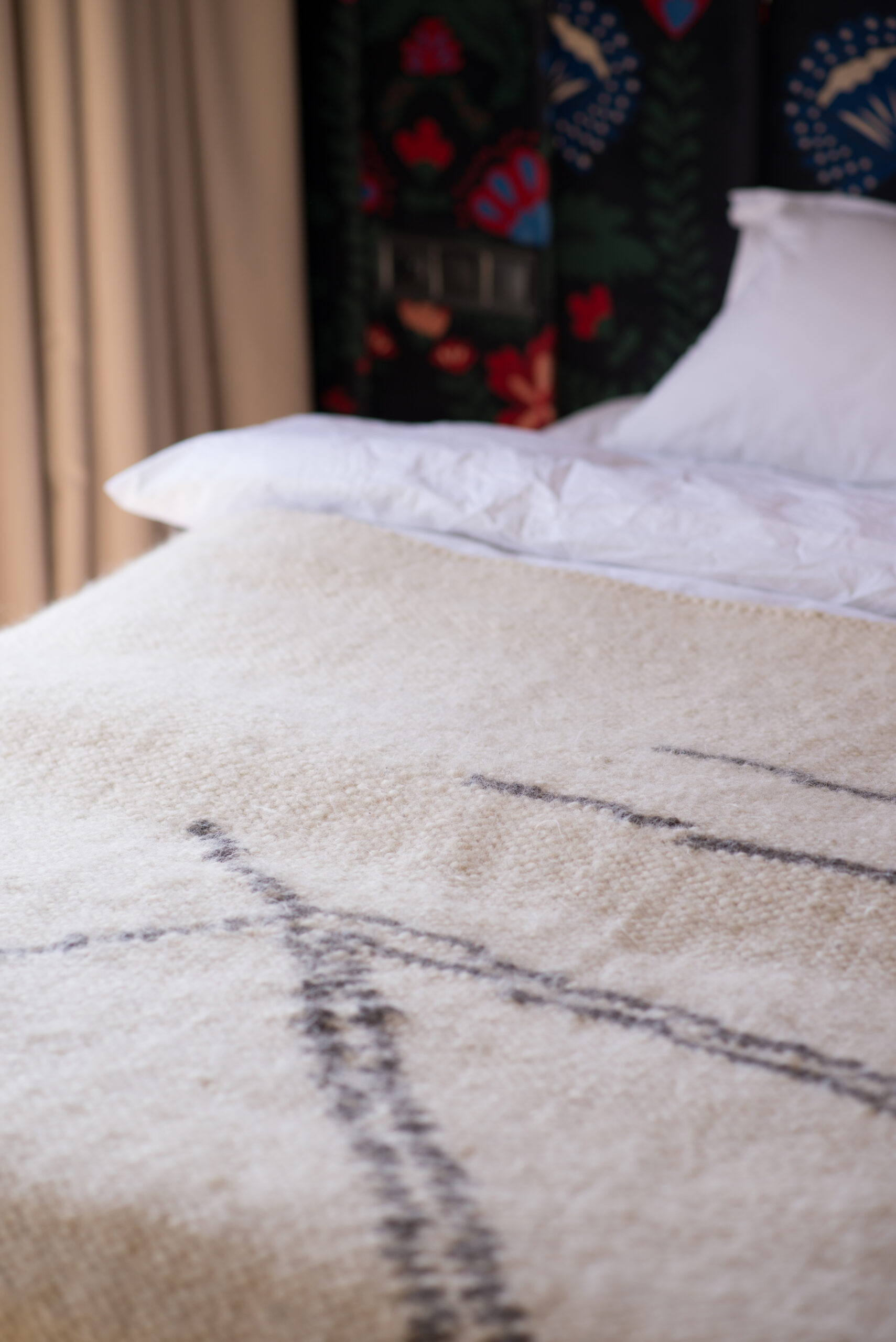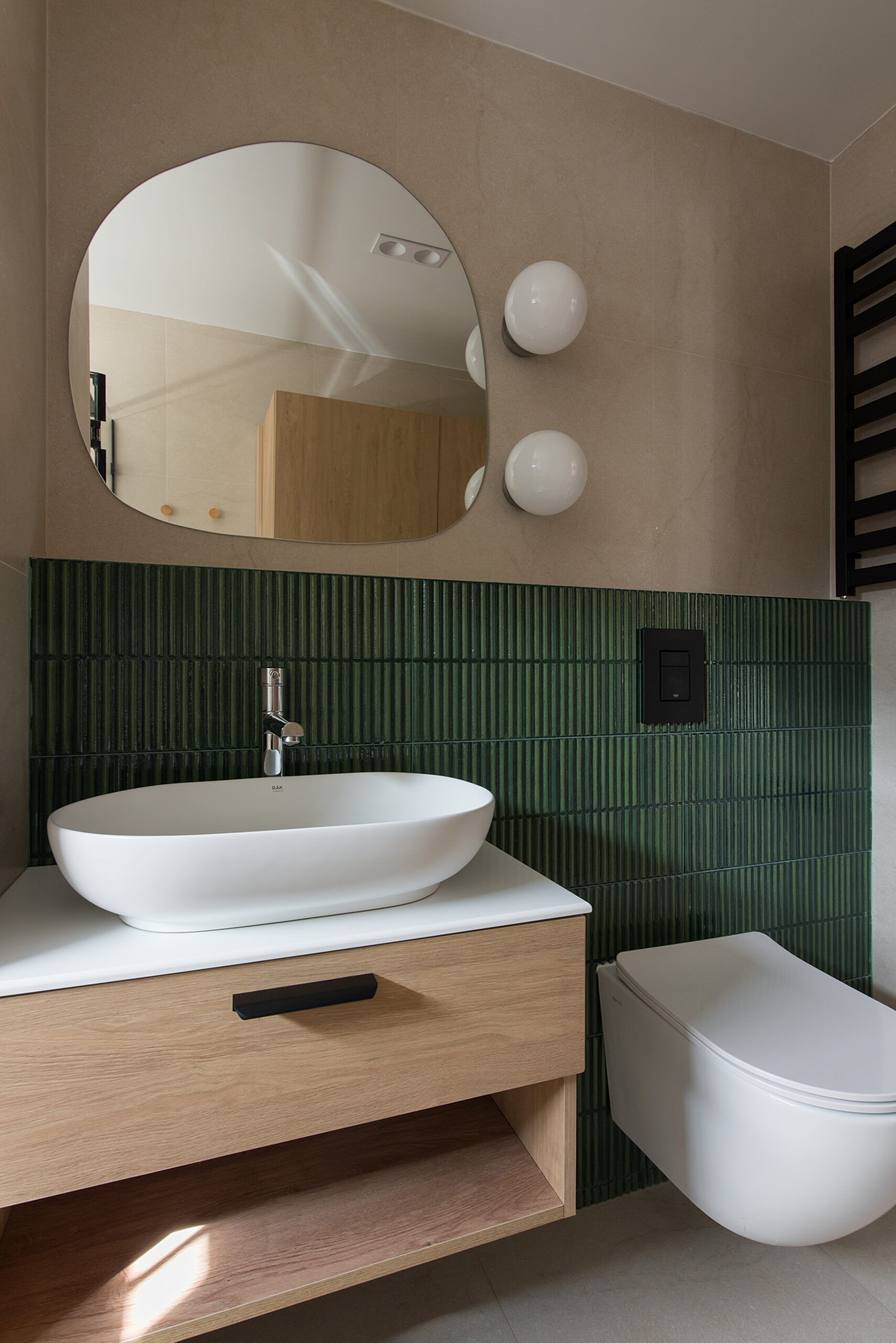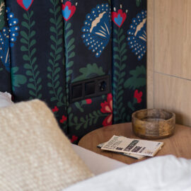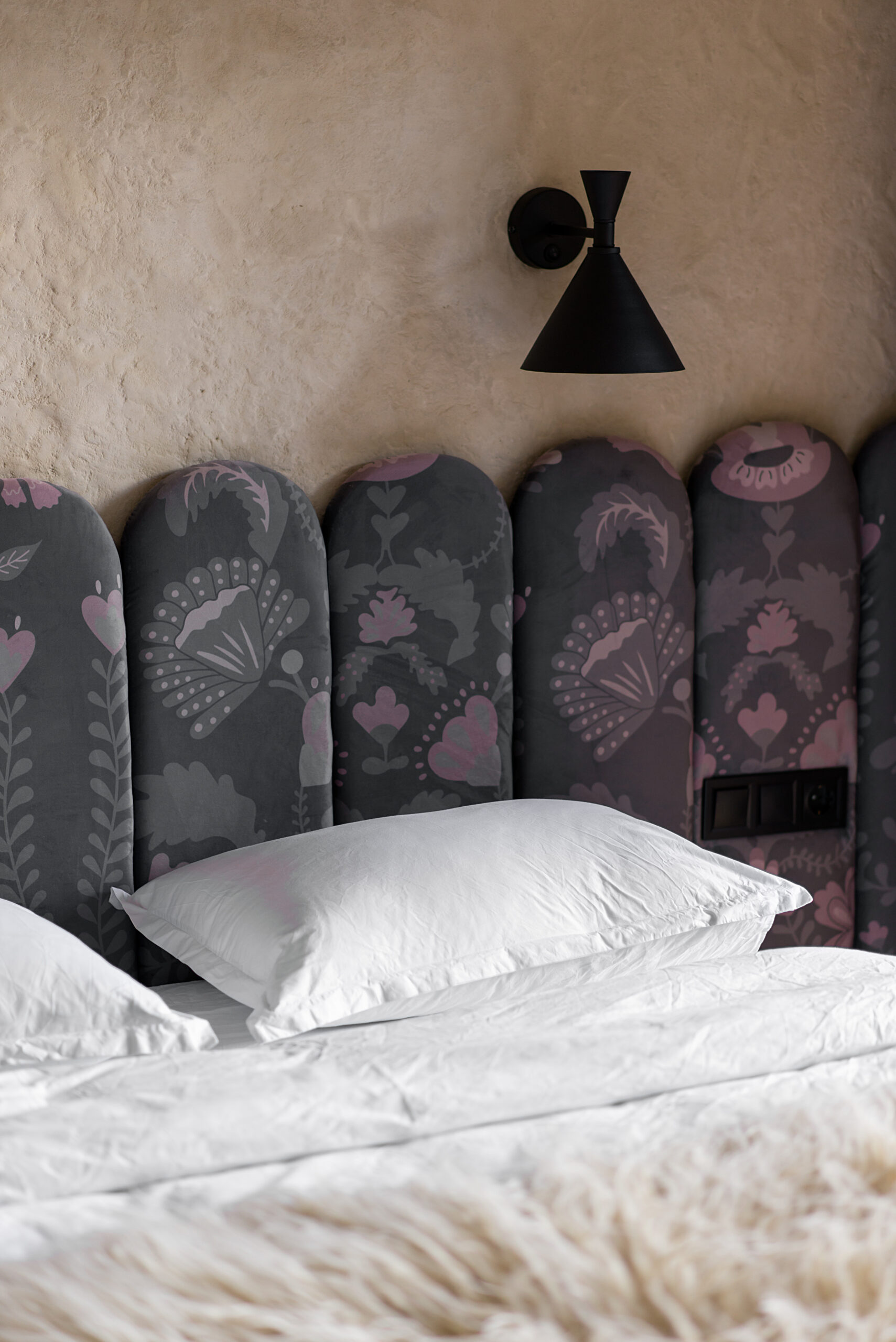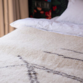 Спальня забезпечує відпочинок і відновлення завдяки використанню дизайнерських узголів’їв та декору від українських брендів, як-от подушки GUSHKA та килим Basny Rugs. Вбиральня з сучасними деталями та природним освітленням завершує гармонійний образ будинку, що відображає єдність з природою та українською культурою.