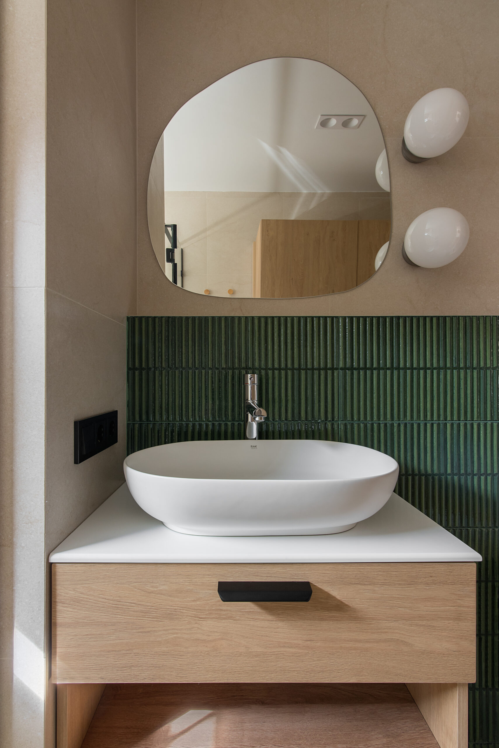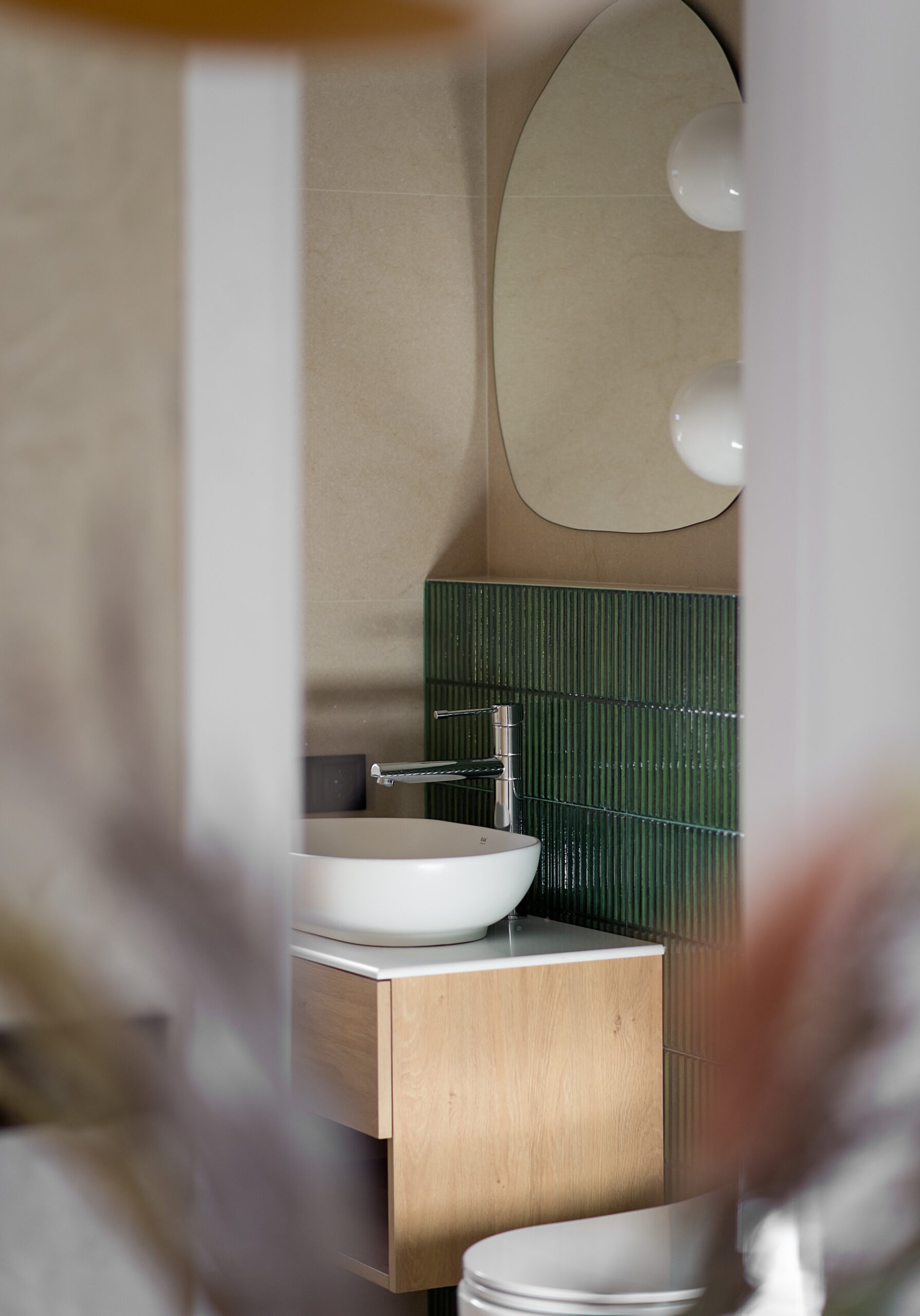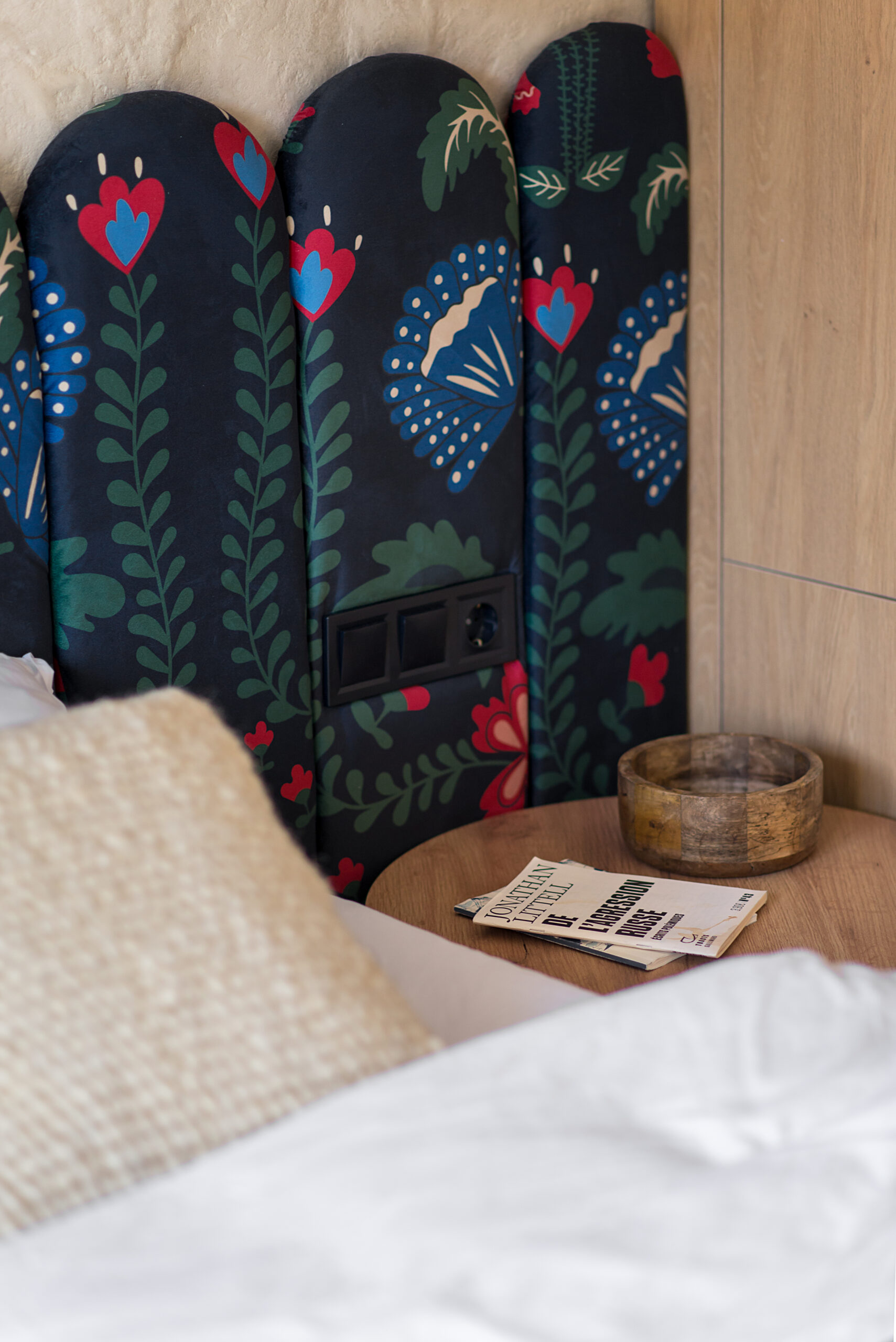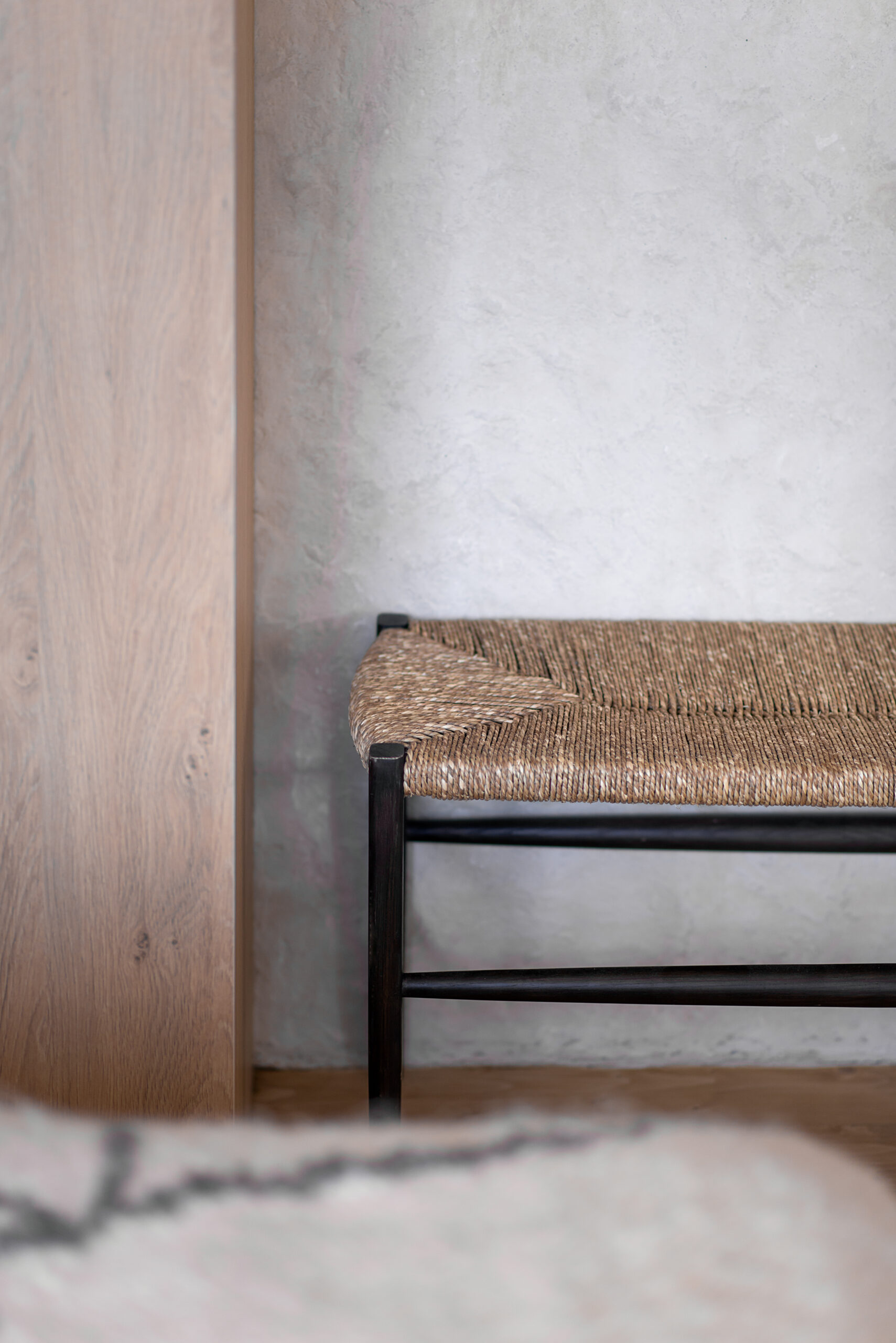 Спальня забезпечує відпочинок і відновлення завдяки використанню дизайнерських узголів’їв та декору від українських брендів, як-от подушки GUSHKA та килим Basny Rugs. Вбиральня з сучасними деталями та природним освітленням завершує гармонійний образ будинку, що відображає єдність з природою та українською культурою.