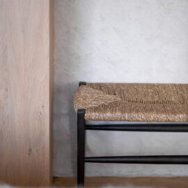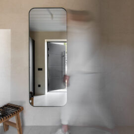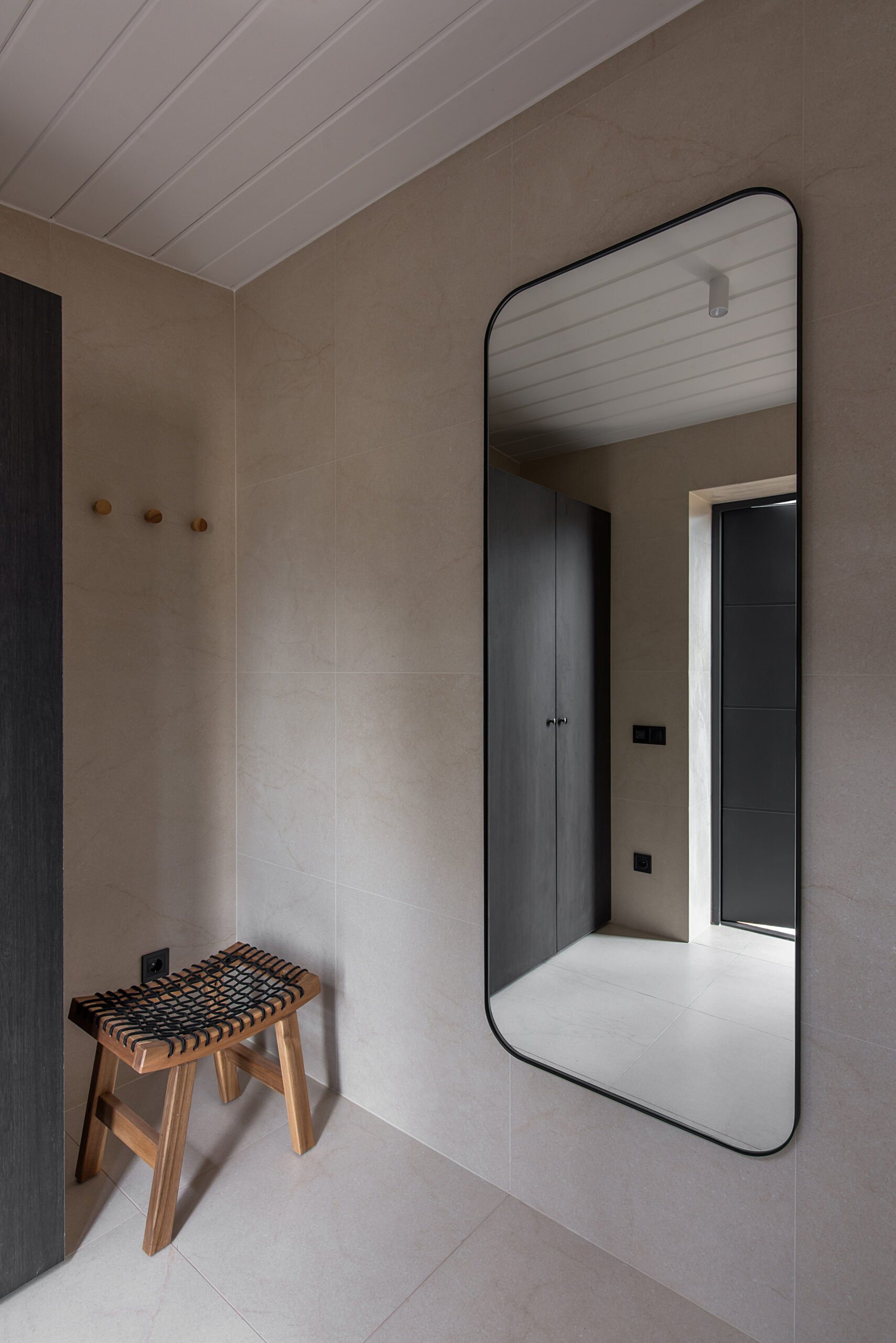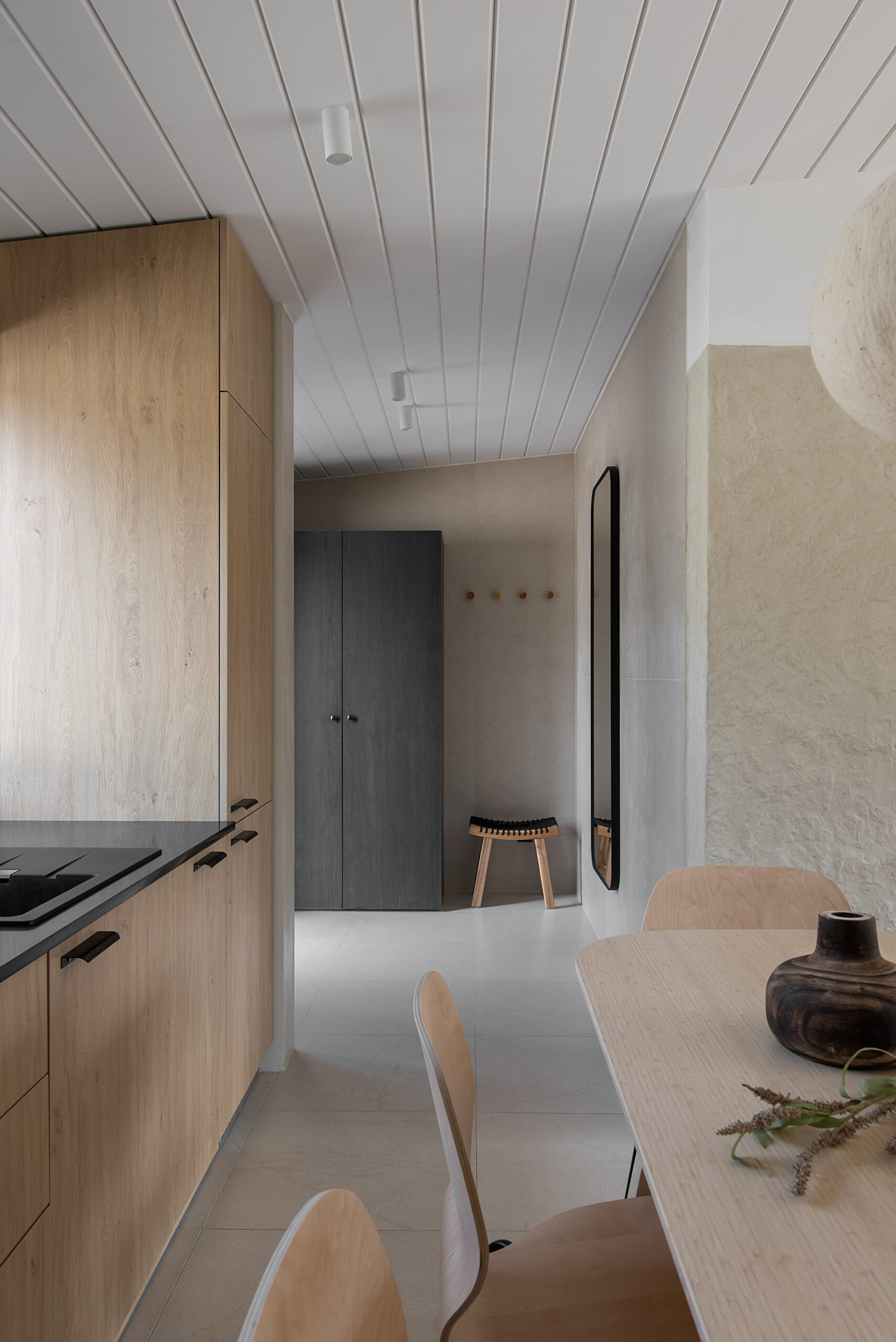 Вхідна зона вражає своєю практичністю та затишком: велике дзеркало в повний зріст та функціональні шафи для верхнього одягу забезпечують комфорт і порядок. Скляна вставка у вхідних дверях пропускає природне світло, створюючи відчуття простору. Керамічна плитка на підлозі та стінах додає довговічності, а дерев’яна фарбована вагонка на стелі підтримує теплу атмосферу. Коридор задає тон всьому інтер’єру, де натуральні матеріали та теплі відтінки створюють гостинну атмосферу.