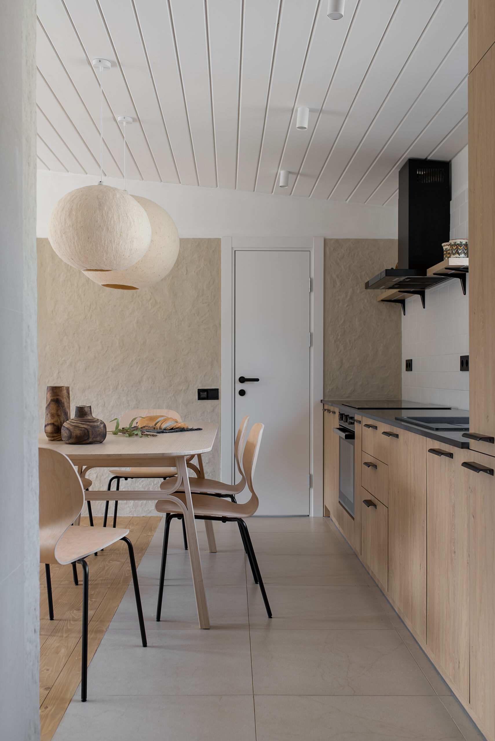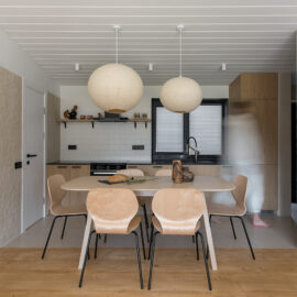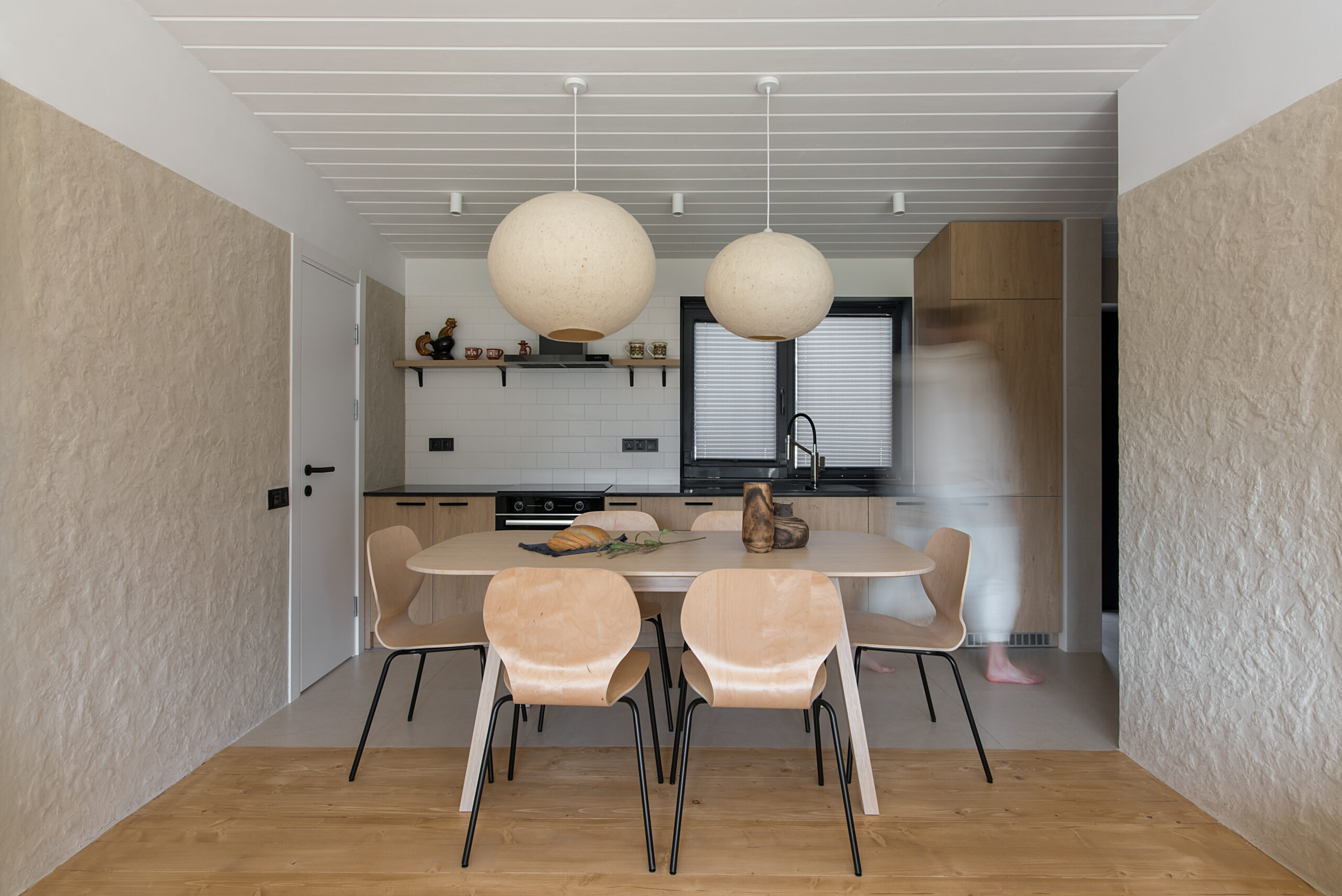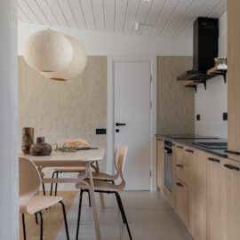 Кухня Gont поєднує в собі функціональність і затишок. Вона обладнана столом на шість осіб, вбудованою кухнею та широким вікном з видом на гори, що забезпечує простір для приємних моментів. Використані матеріали, як-от дерево для підлоги та стелі, місцевий кварцит для стільниць і декоративна штукатурка українського виробництва на стінах, підкреслюють національний колорит. Світильники з овечої шерсті додають простору унікальності.
