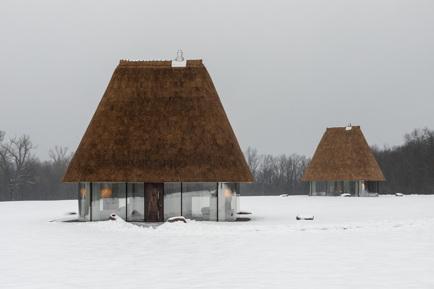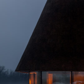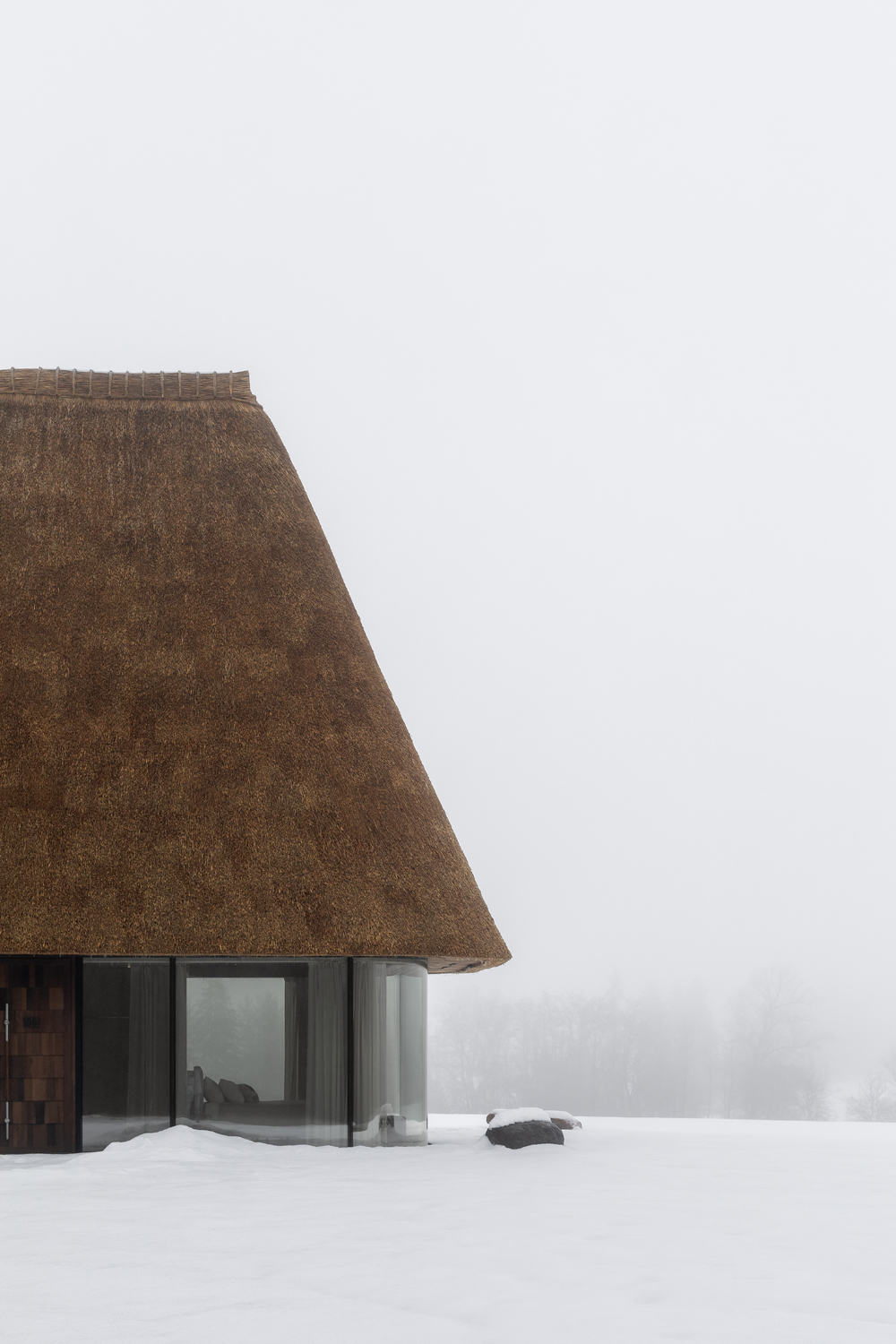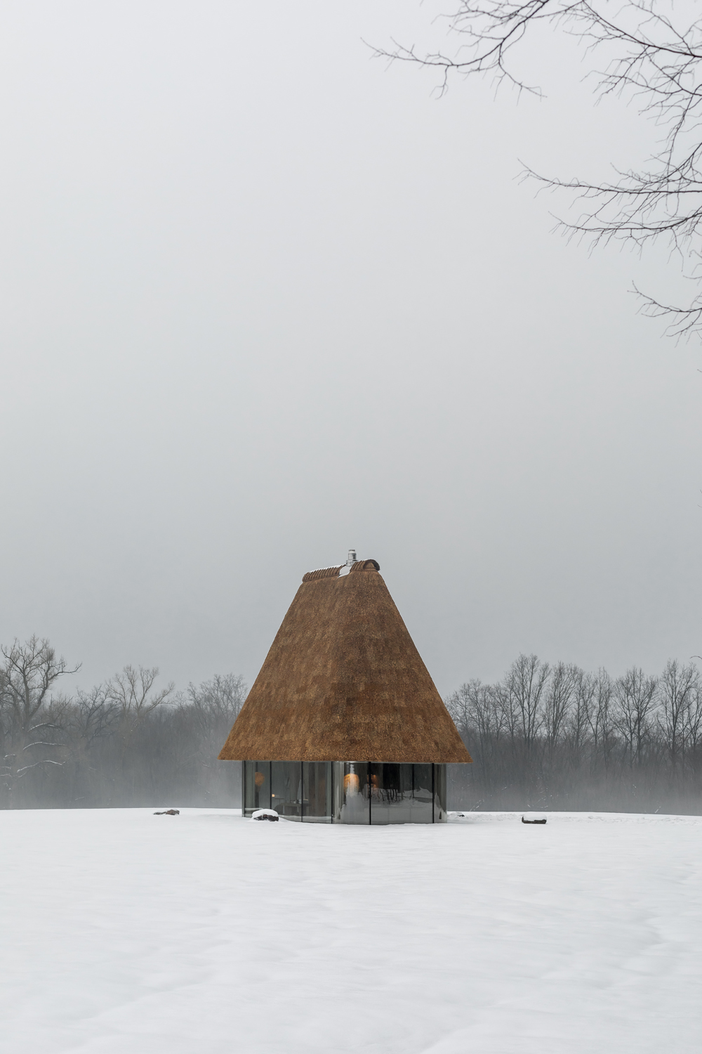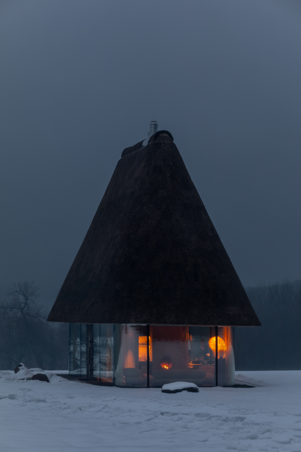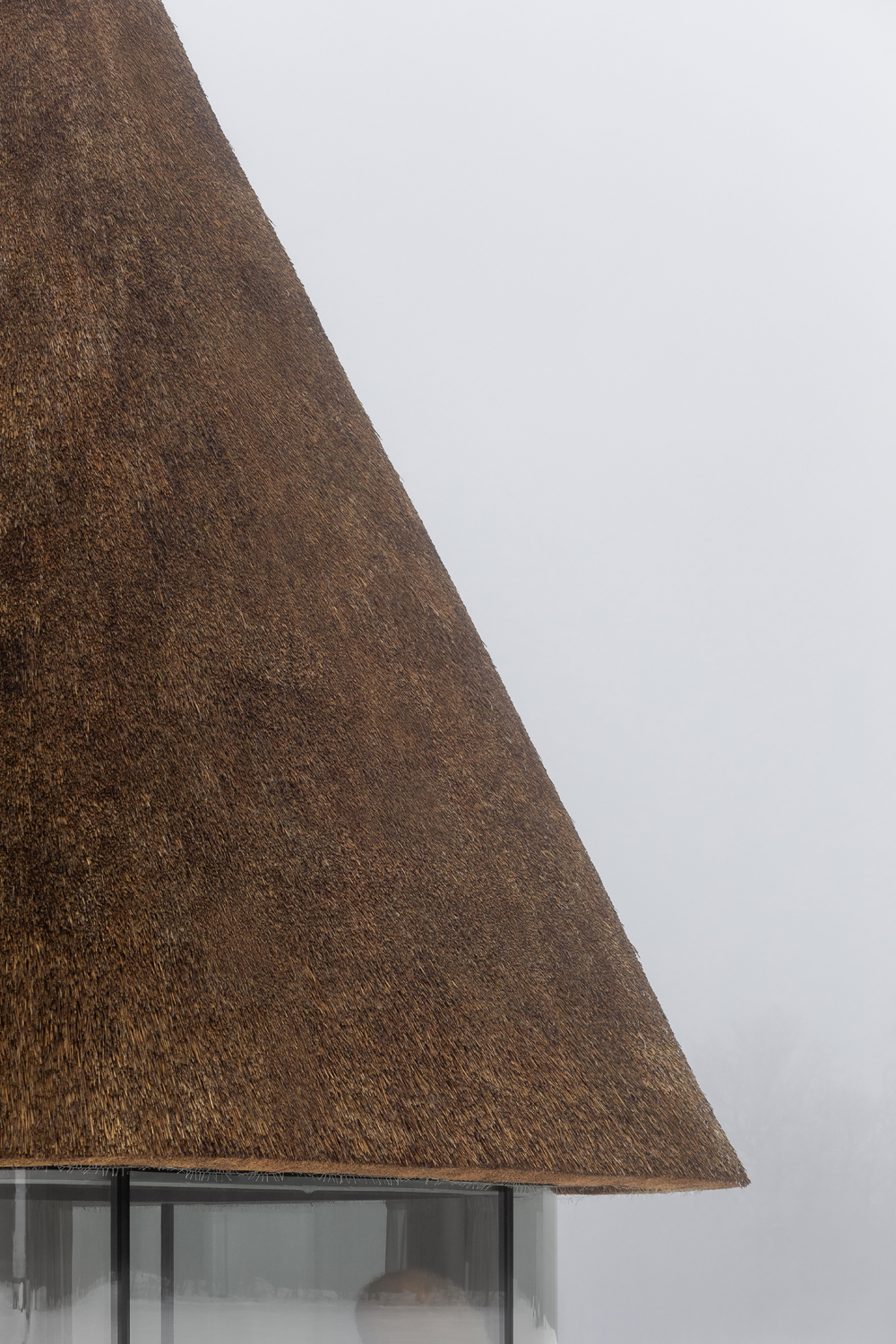 Народна сільська архітектура України історично формувалася навколо виразних та функціональних рішень: очеретяний дах, вибілені вапном стіни, регулярне оновлення тинькування як прояв турботи та прагнення до ошатності. У сучасній інтерпретації YOD Group бажання чистоти й світла трансформується у повністю прозорі фасади зі скла, а гіперболізований за пропорціями дах стає ключовим акцентом архітектури. Його форма створюючи виразний та впізнаваний силует, що водночас нагадує традиційну високу шапку «кучму» та велетенський гриб.