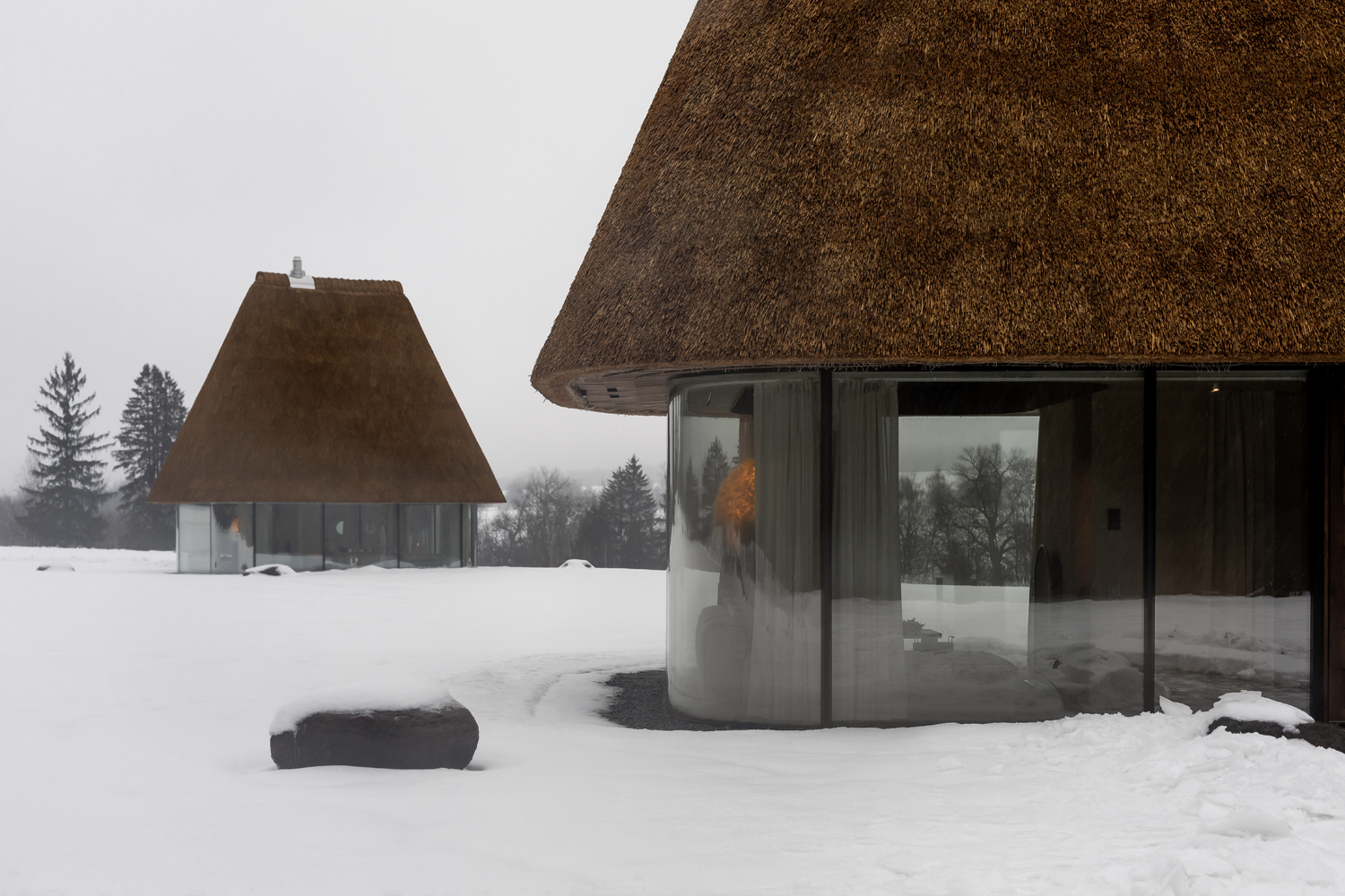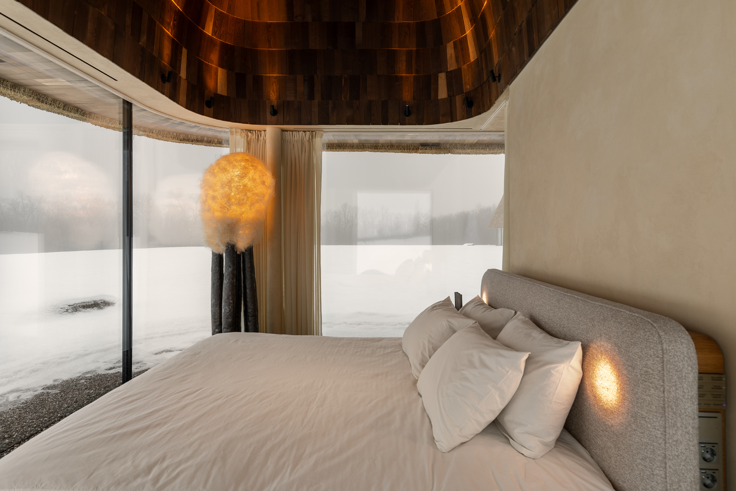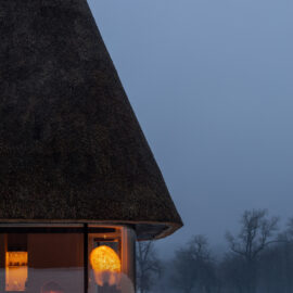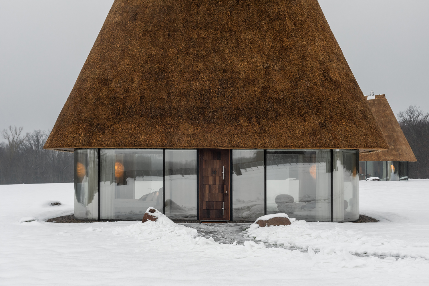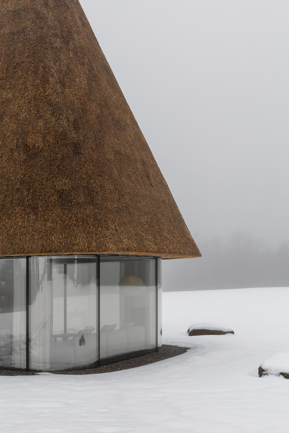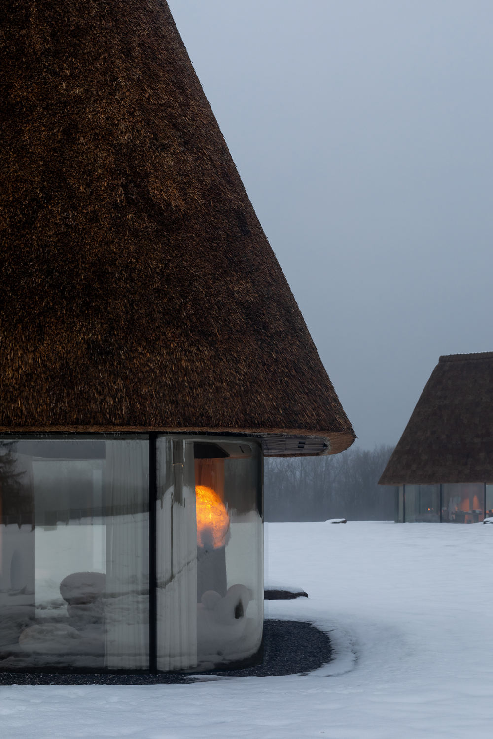 У денний час прозорі зовнішні стіни практично зникають, створюючи ілюзію левітації масивного очеретяного даху. Підлога всередині та зовні будинку виконана з однорідного кам’яно-килимового покриття, яке є приємним на дотик і створює легкий масажний ефект під час ходіння босоніж. Суцільне скління підсилює відчуття повного занурення в природу, де краєвид стає частиною емоційного досвіду. За потреби гості можуть відокремитися від зовнішнього світу за допомогою щільних, але візуально легких штор, керування якими відбувається автоматично – кнопка розташована в узголів’ї ліжка.