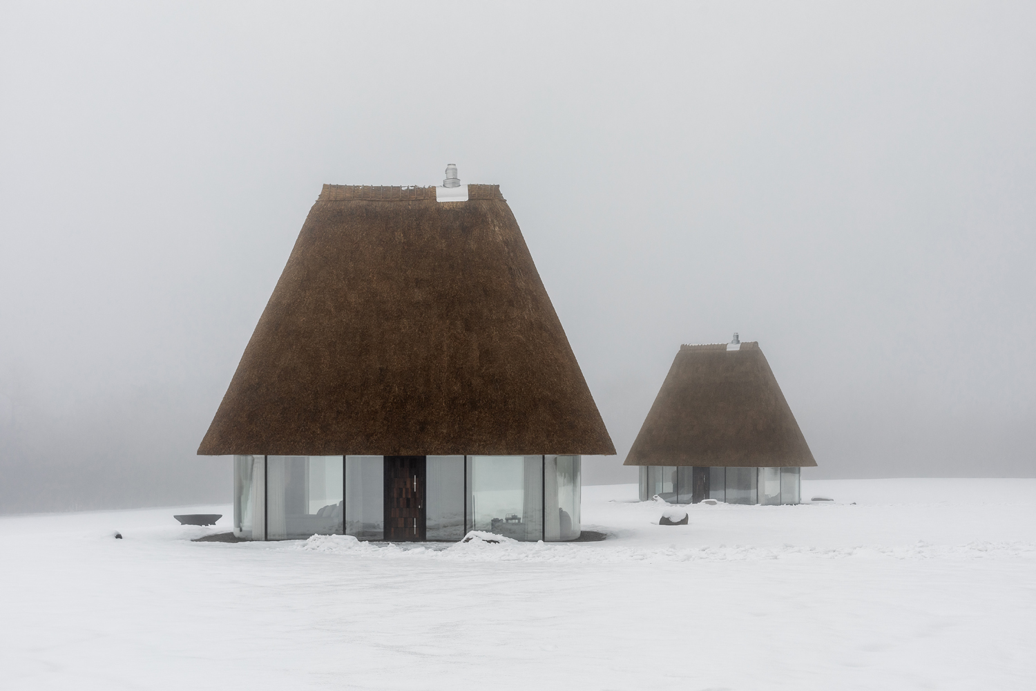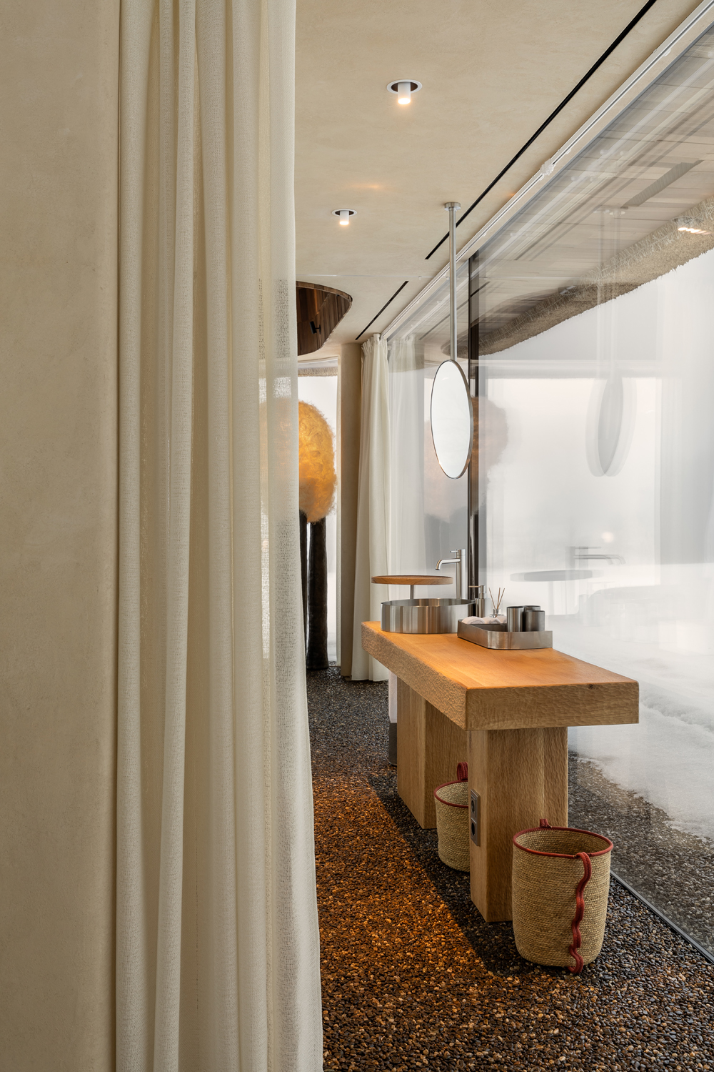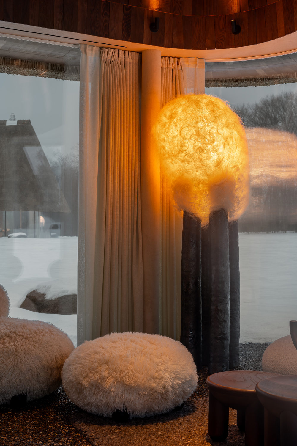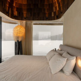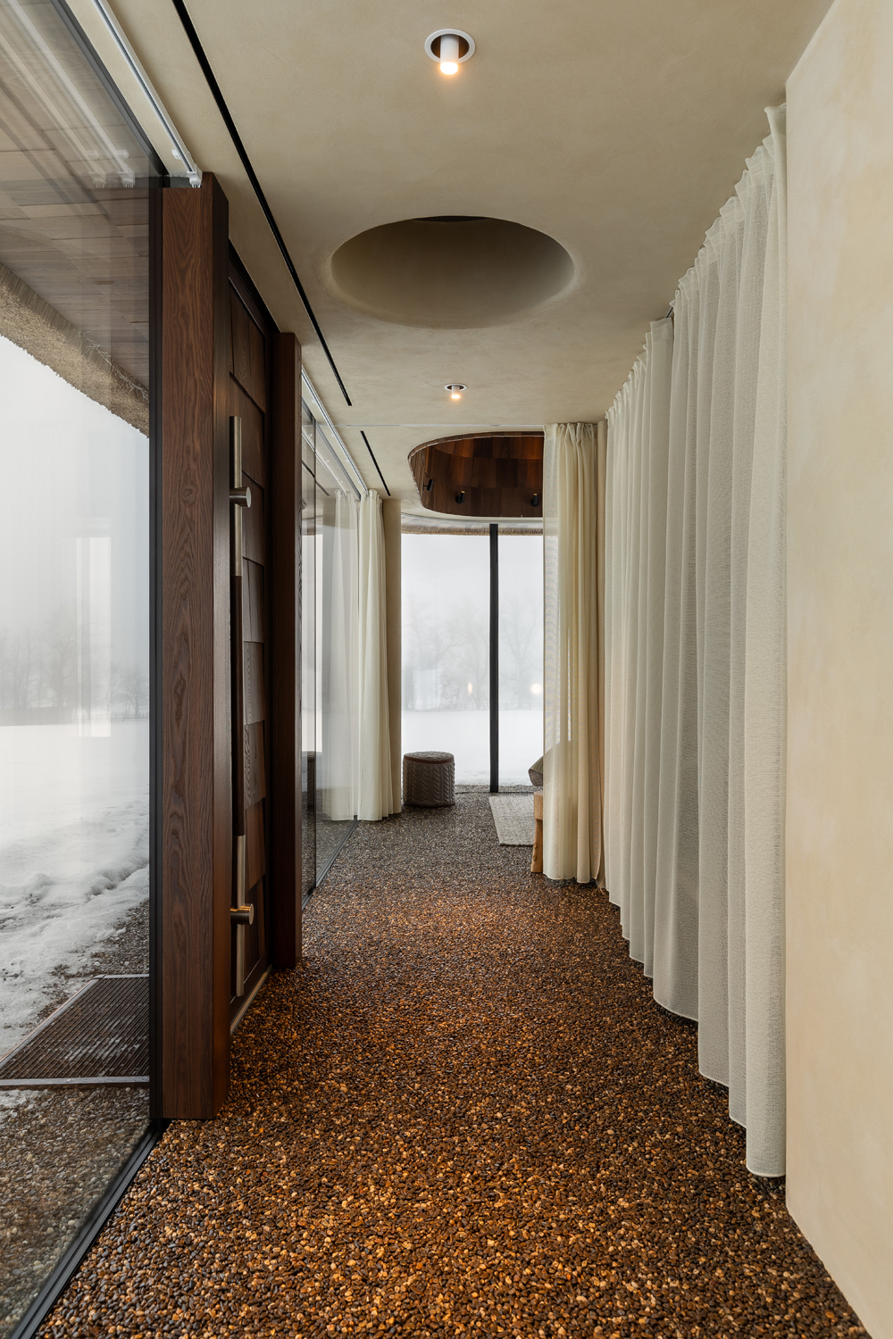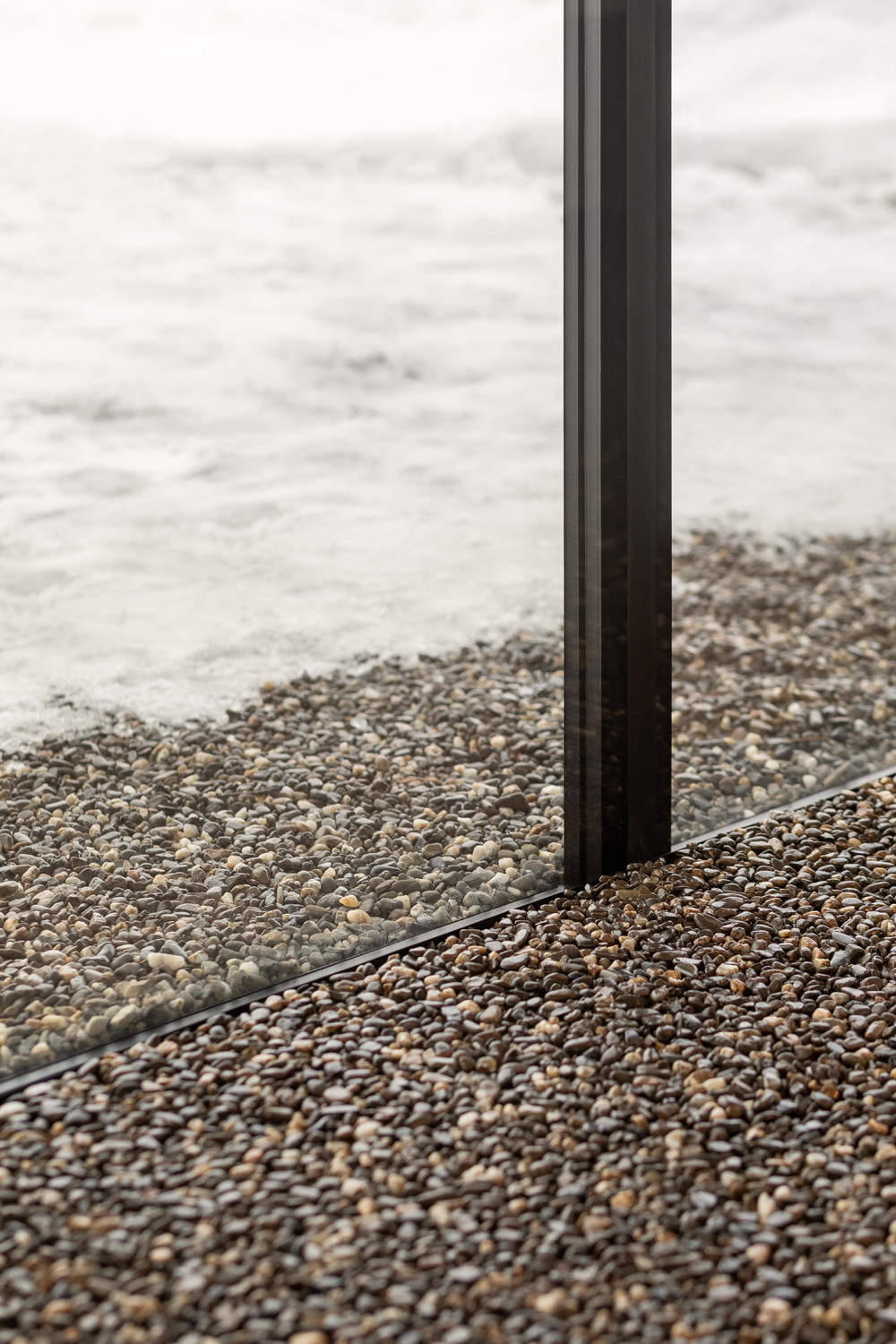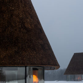 У денний час прозорі зовнішні стіни практично зникають, створюючи ілюзію левітації масивного очеретяного даху. Підлога всередині та зовні будинку виконана з однорідного кам’яно-килимового покриття, яке є приємним на дотик і створює легкий масажний ефект під час ходіння босоніж. Суцільне скління підсилює відчуття повного занурення в природу, де краєвид стає частиною емоційного досвіду. За потреби гості можуть відокремитися від зовнішнього світу за допомогою щільних, але візуально легких штор, керування якими відбувається автоматично – кнопка розташована в узголів’ї ліжка.
