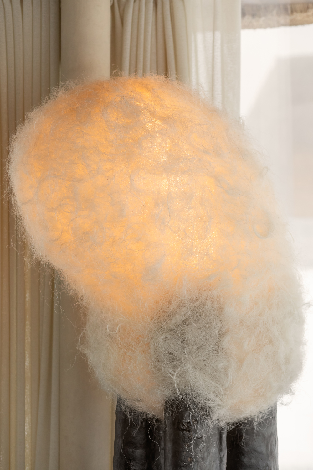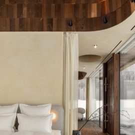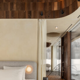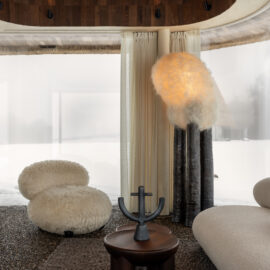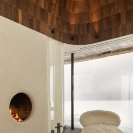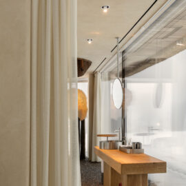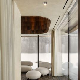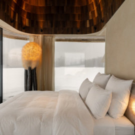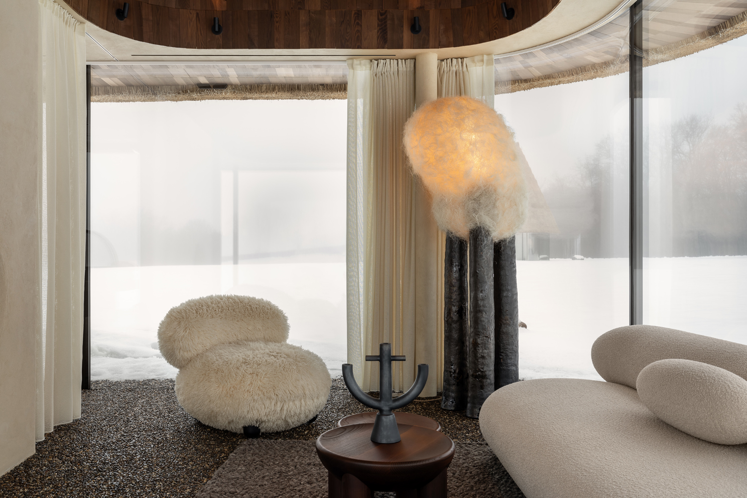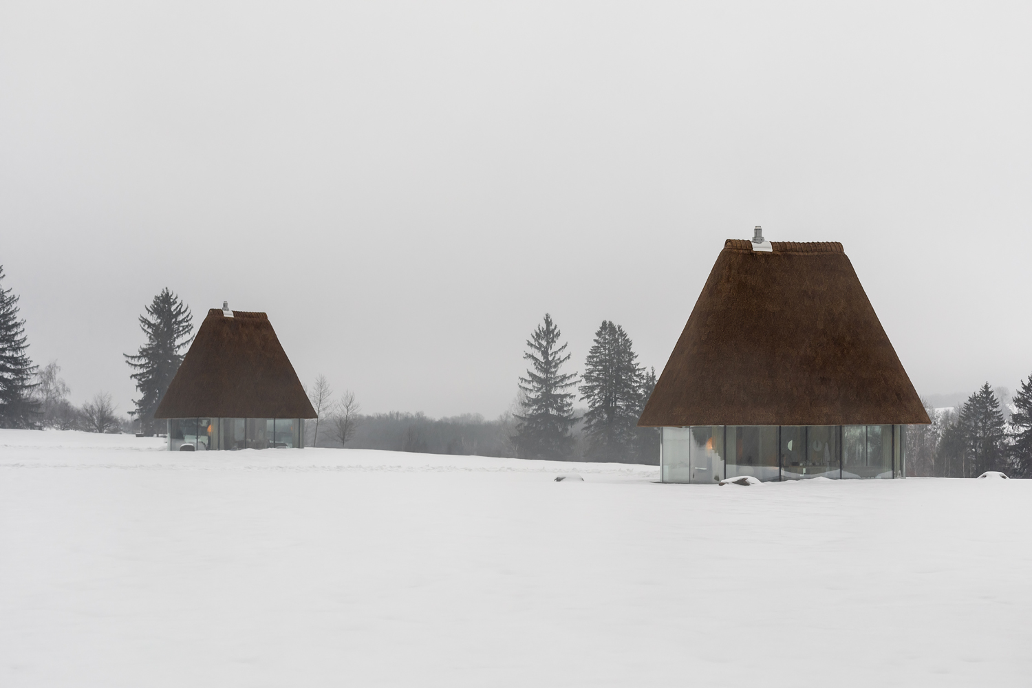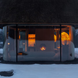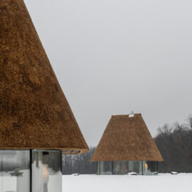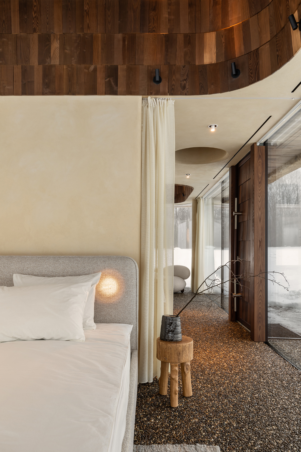 У денний час прозорі зовнішні стіни практично зникають, створюючи ілюзію левітації масивного очеретяного даху. Підлога всередині та зовні будинку виконана з однорідного кам’яно-килимового покриття, яке є приємним на дотик і створює легкий масажний ефект під час ходіння босоніж. Суцільне скління підсилює відчуття повного занурення в природу, де краєвид стає частиною емоційного досвіду. За потреби гості можуть відокремитися від зовнішнього світу за допомогою щільних, але візуально легких штор, керування якими відбувається автоматично – кнопка розташована в узголів’ї ліжка.