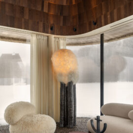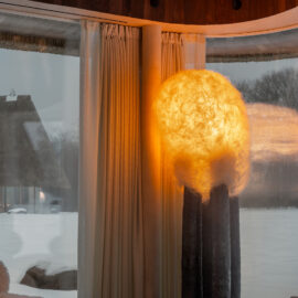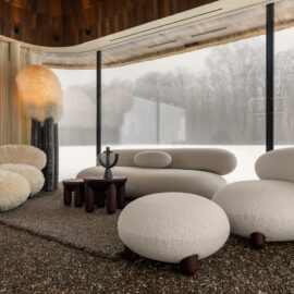 Інтер’єр вирішений у дусі сучасного еко-мінімалізму. Натуральна, стримана палітра, різноманітні тактильні поверхні та предмети українських брендів формують цілісний, заспокійливий простір. У будинку використано меблі Noom (дизайн Катерини Соколової), декор із чорної глини Guculiya, фактурні дерев’яні елементи. Один із ключових акцентів спальні – масивний кастомний торшер, створений дизайнерами Yod Group, із кераміки та натуральних волокон.
